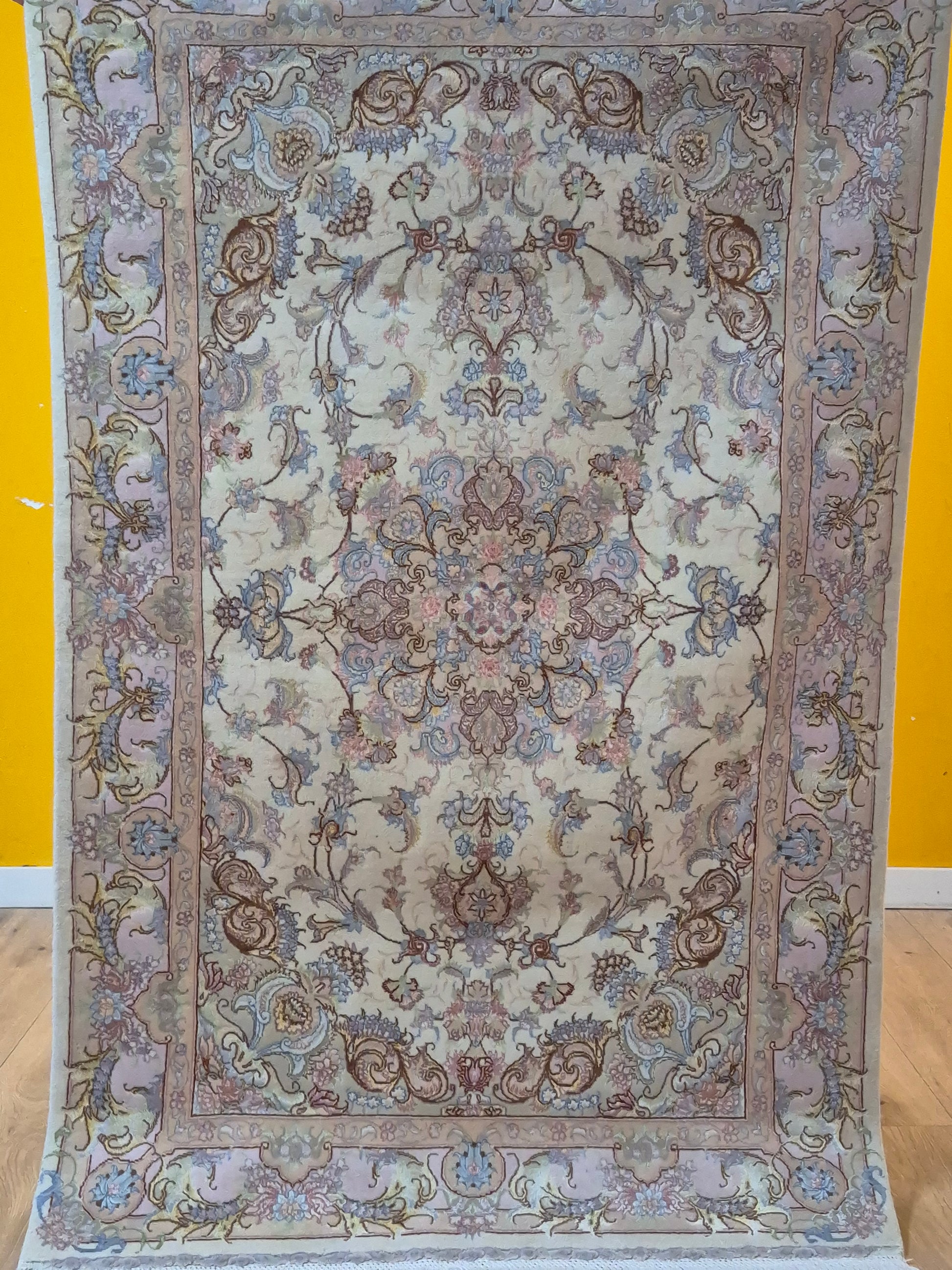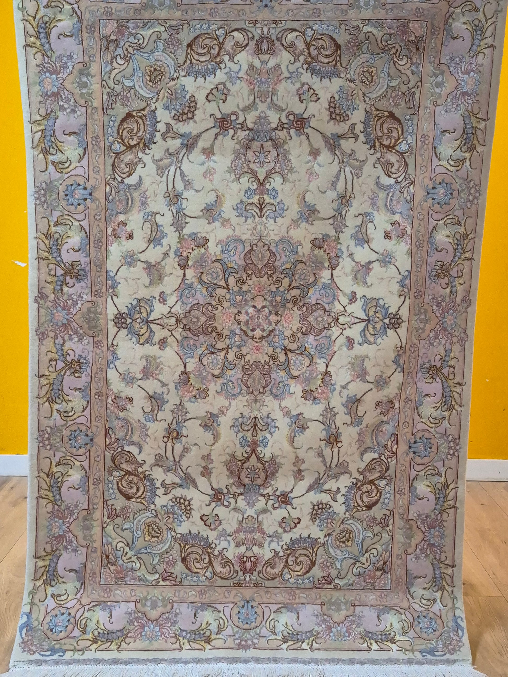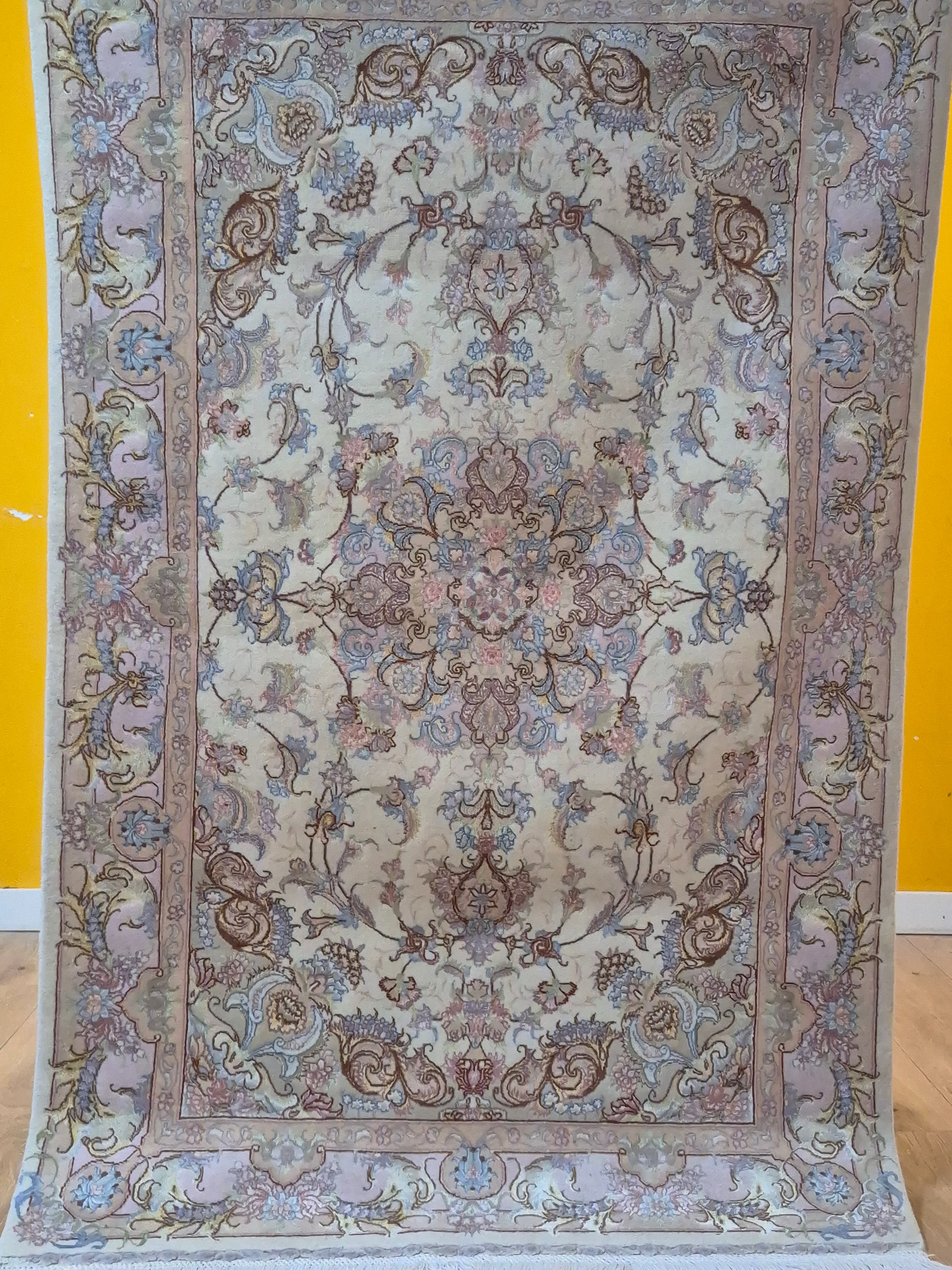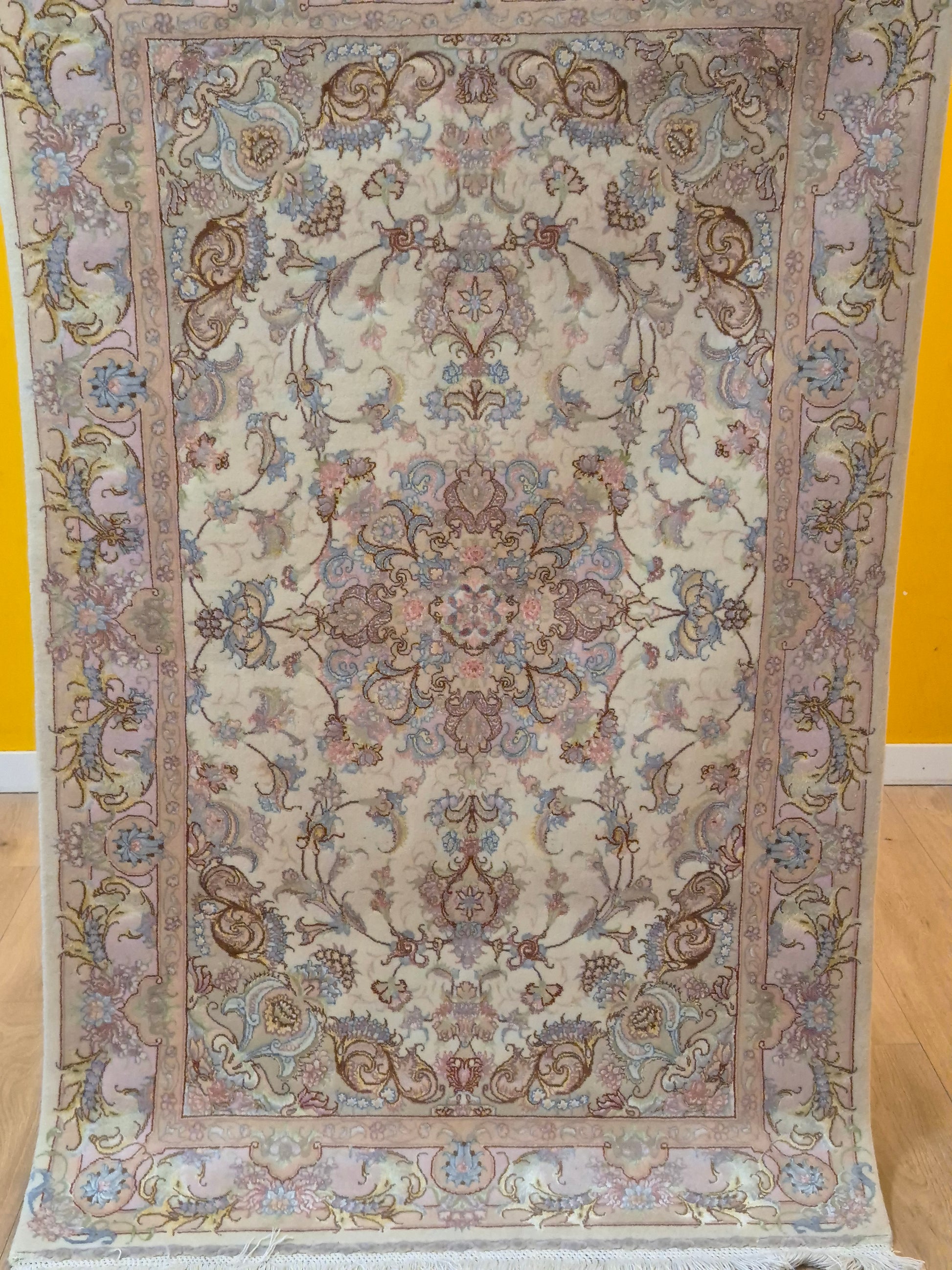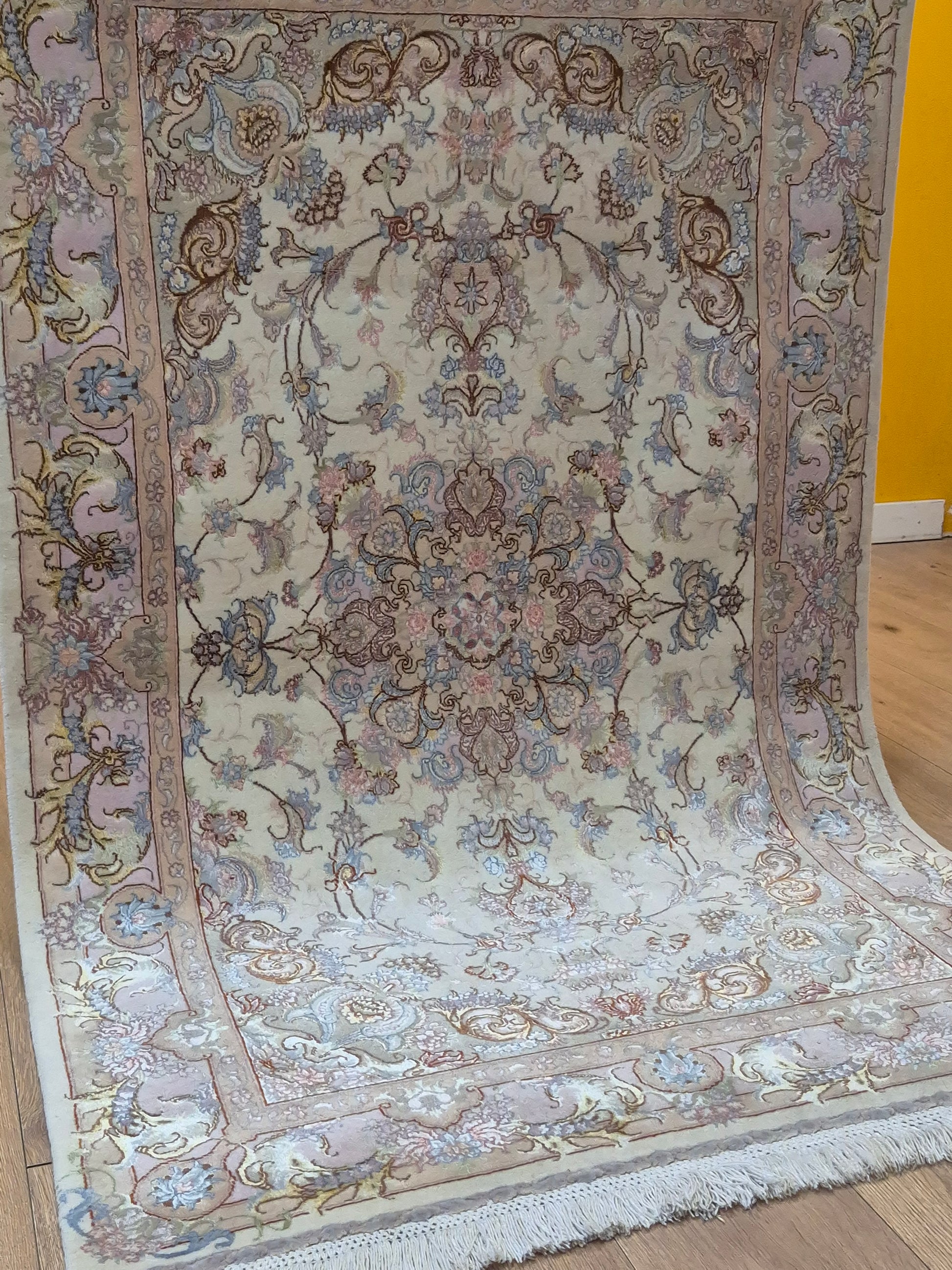 angeboten wird ein exquisiter Täbriz Teppich aus feiner Korkwolle mit Seide, auf Seide geknüpft. Dieses Stück besticht durch seine besonders feine Knüpfung und die elegante Gestaltung in zarten Pastelltönen. Im Zentrum befindet sich ein symmetrisches Medaillon, das von filigranen Blütenranken, Arabesken und geschwungenen Ornamenten umrahmt wird.
