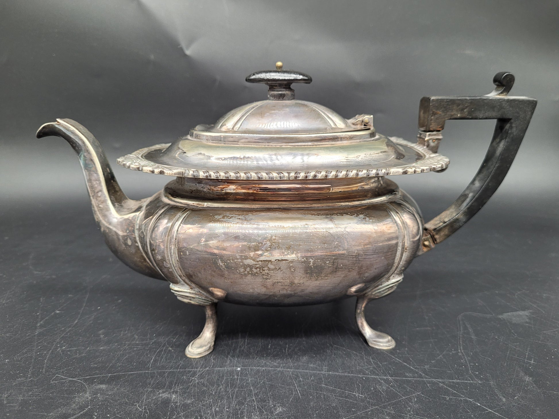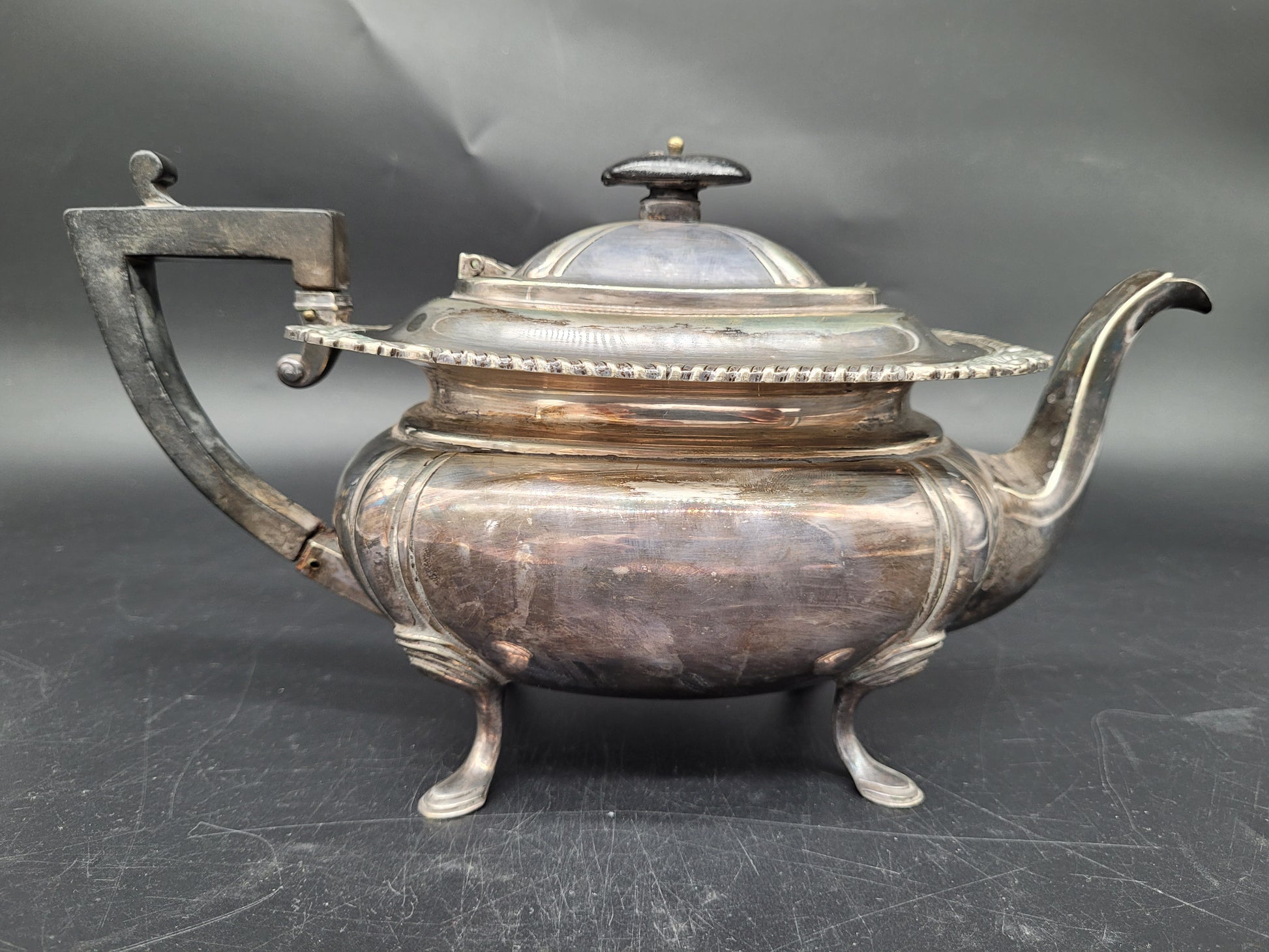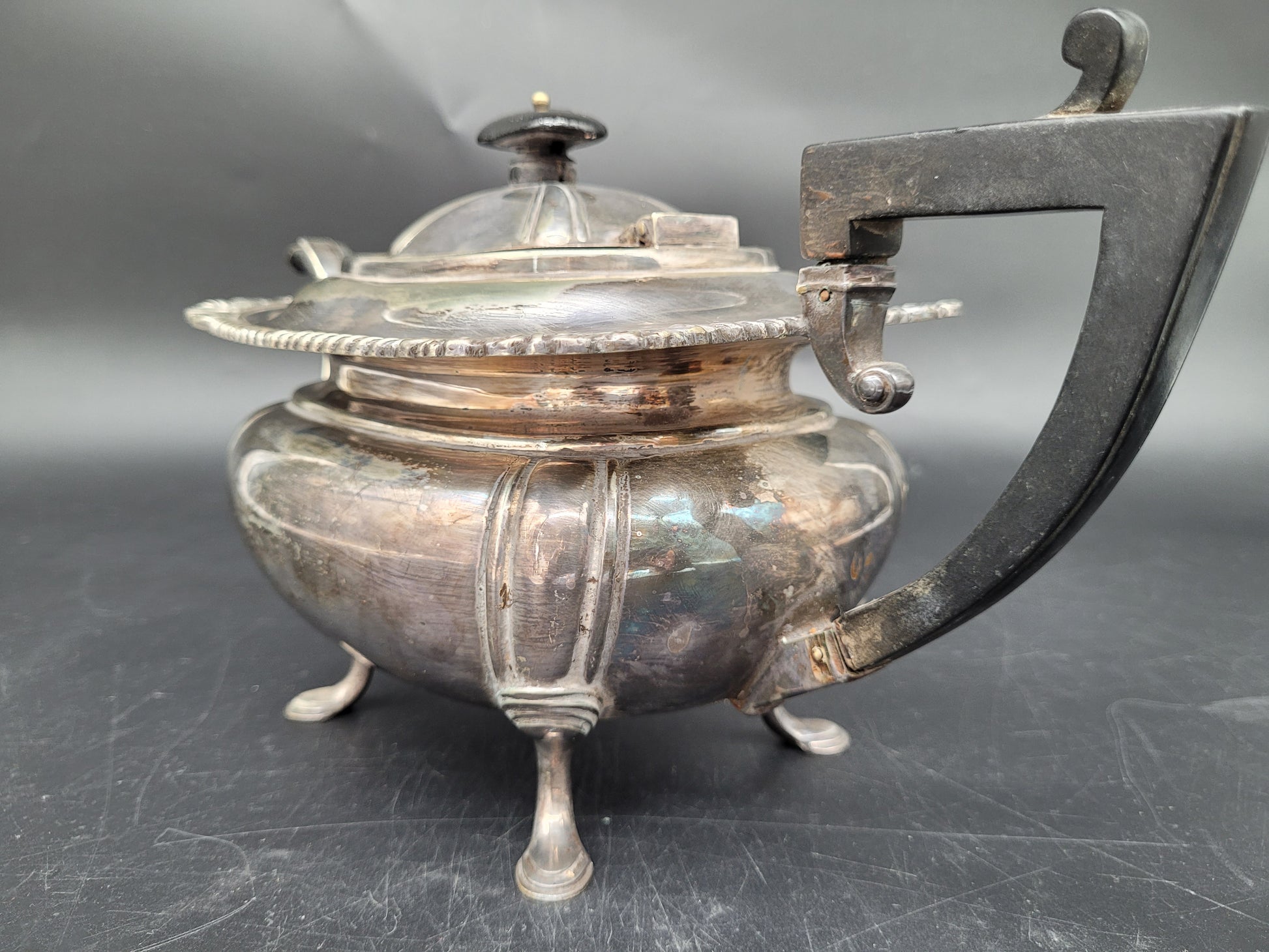 Diese antike Teekanne aus EPNS Silber stammt von der renommierten britischen Meistermarke Joseph Deakin & Sons (JD & S) aus Sheffield. Sie ist ein exzellentes Beispiel für den Edwardianischen Stil und besticht durch ihre klassische, bauchige Form, die auf eleganten Füßen ruht. Die Kanne ist ein stilvolles und hochwertiges Sammlerstück.