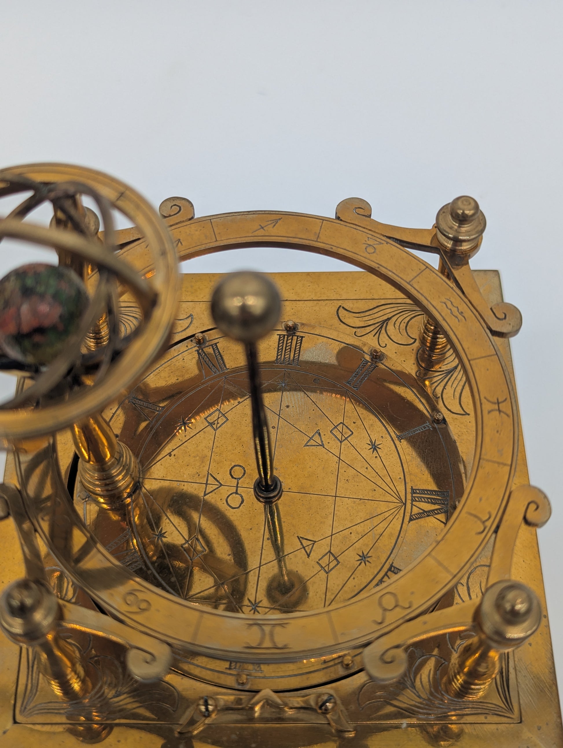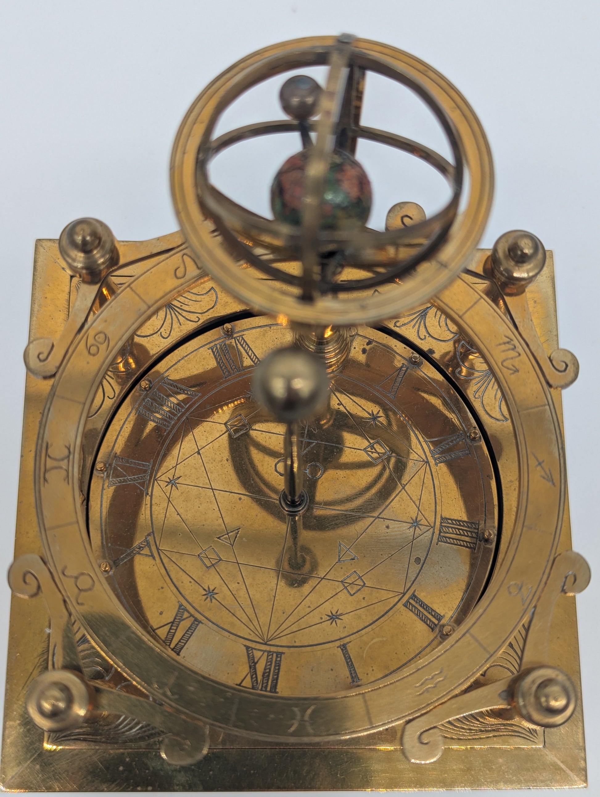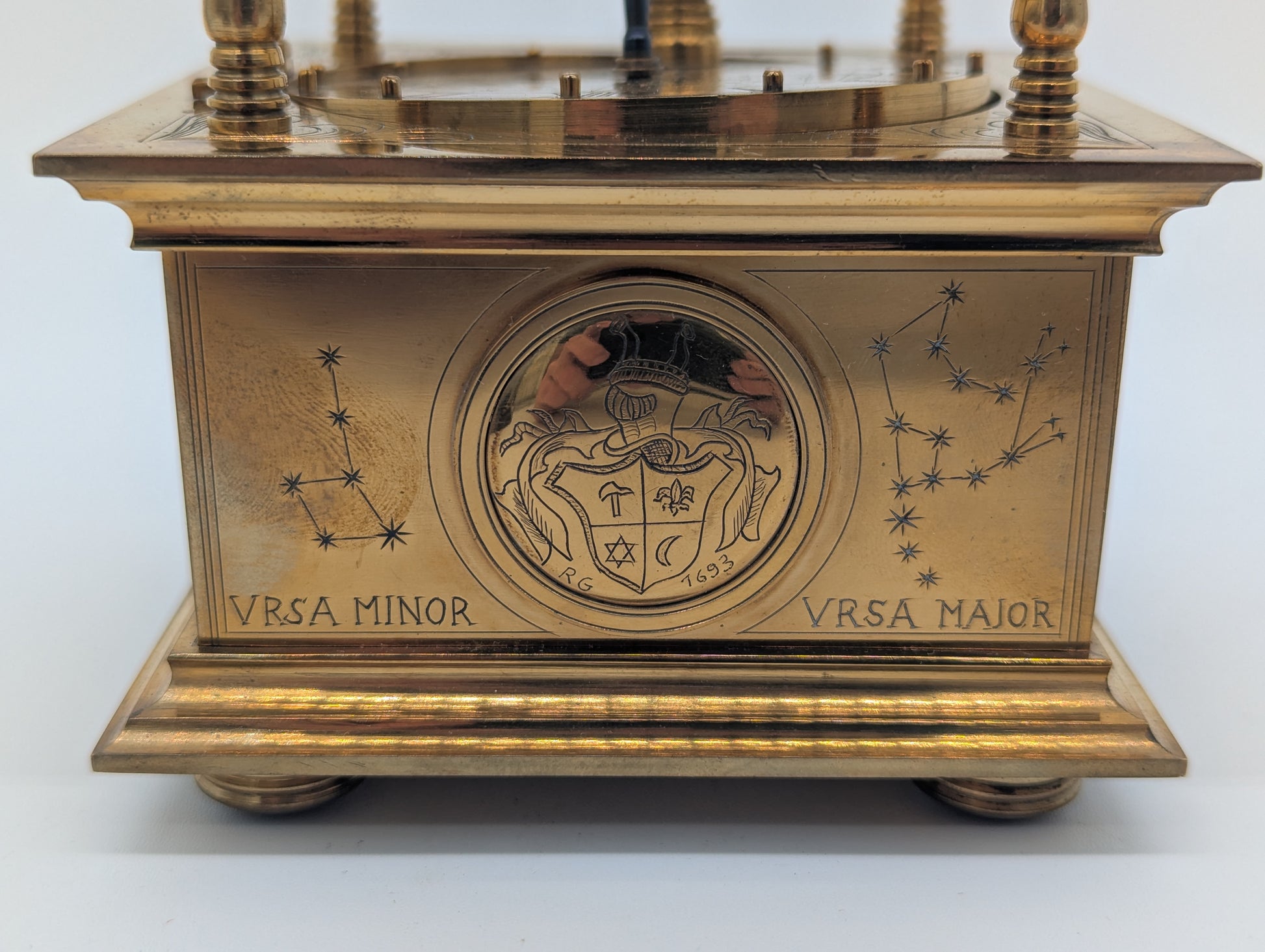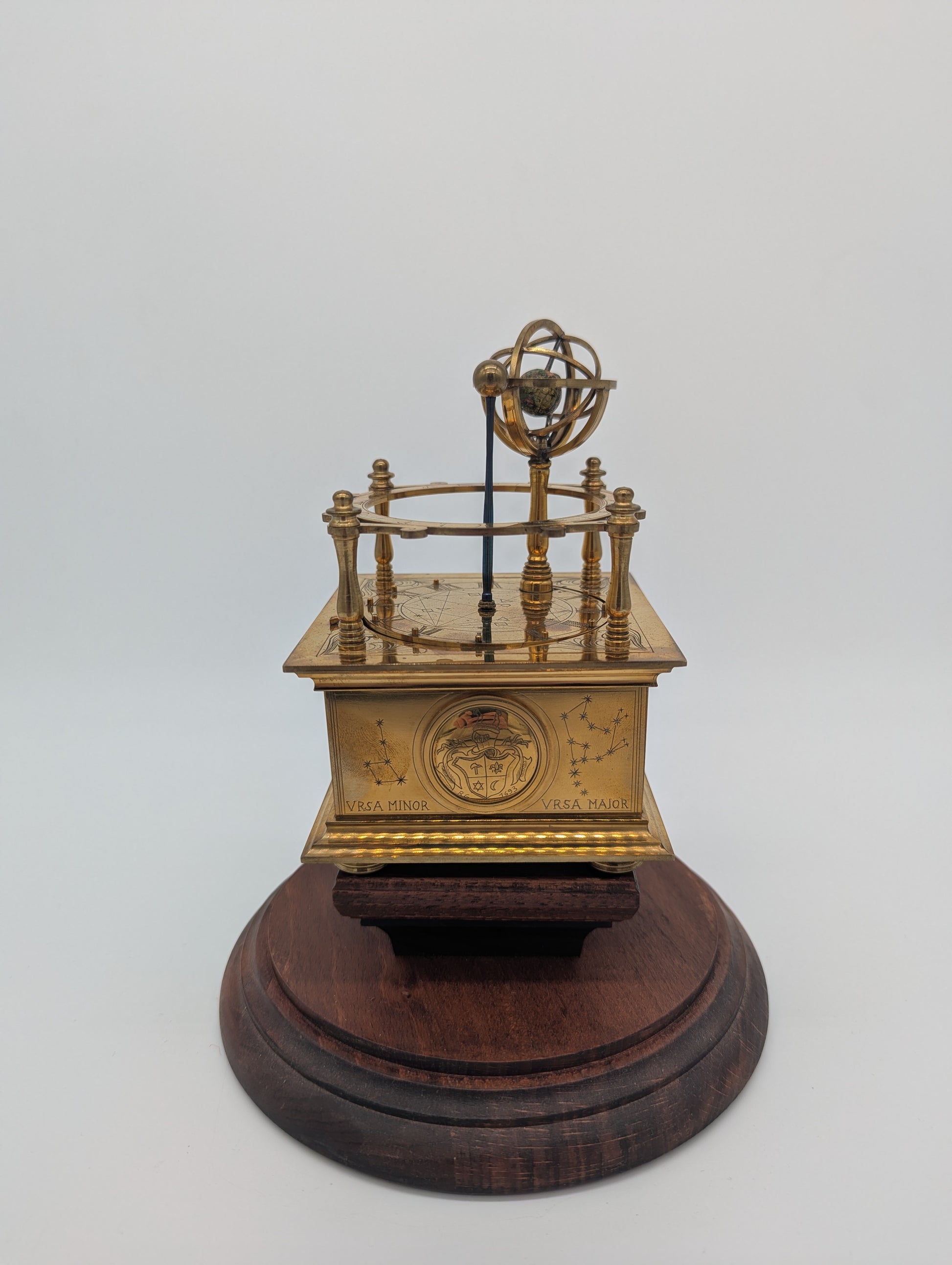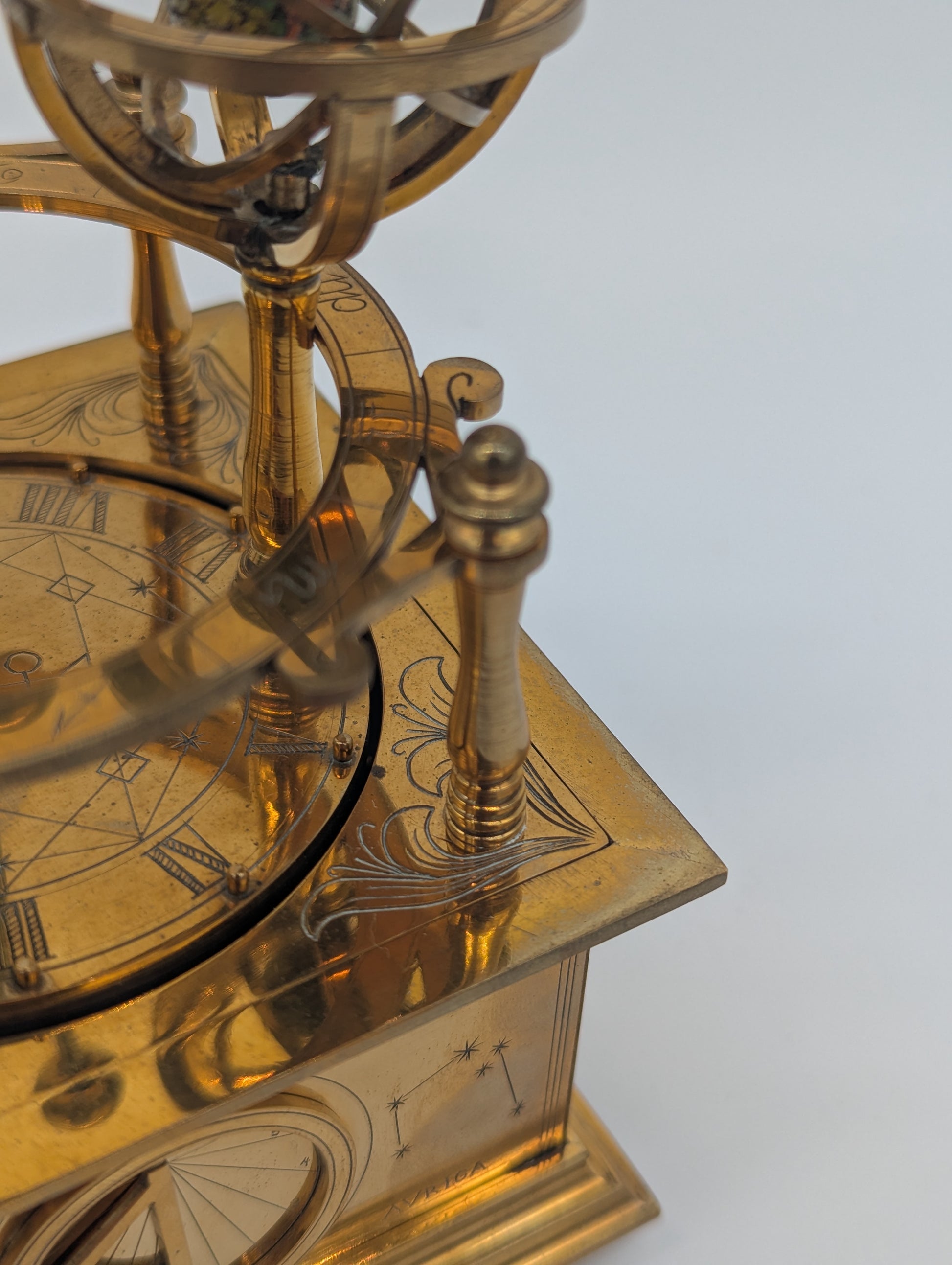Das Gerät steht auf einem quadratischen Sockel aus Messing, dessen Seiten mit fein gravierten Sternbildern (u.a. Ursa Minor, Ursa Major, Bootes, Leo) sowie dekorativen Ornamenten versehen sind. Auf dem Sockel erhebt sich eine zentrale Achse mit Ringstruktur, an deren Spitze eine kleine Armillarsphäre mit Erde und Mond montiert ist. Daneben befindet sich eine Sonnenkugel, sodass die Bahnen anschaulich nachvollzogen werden können.