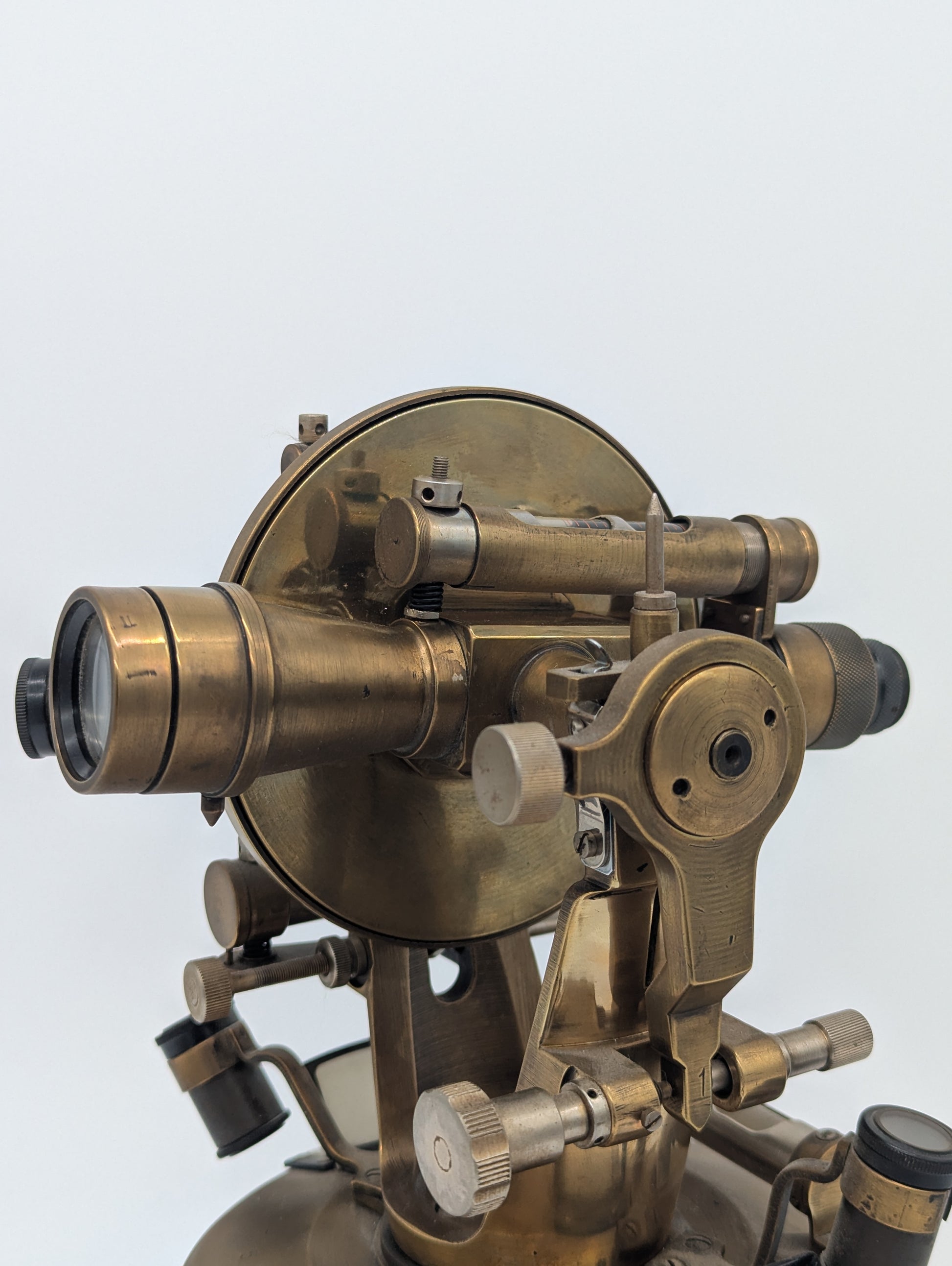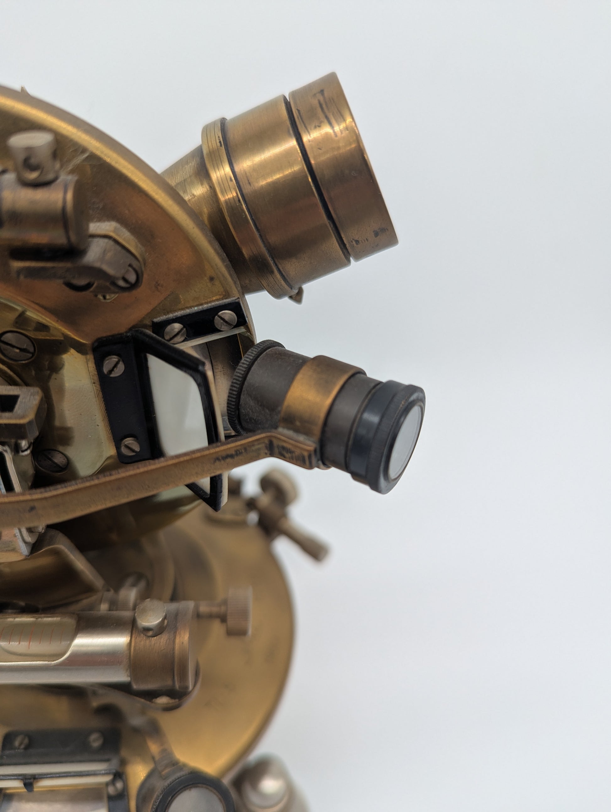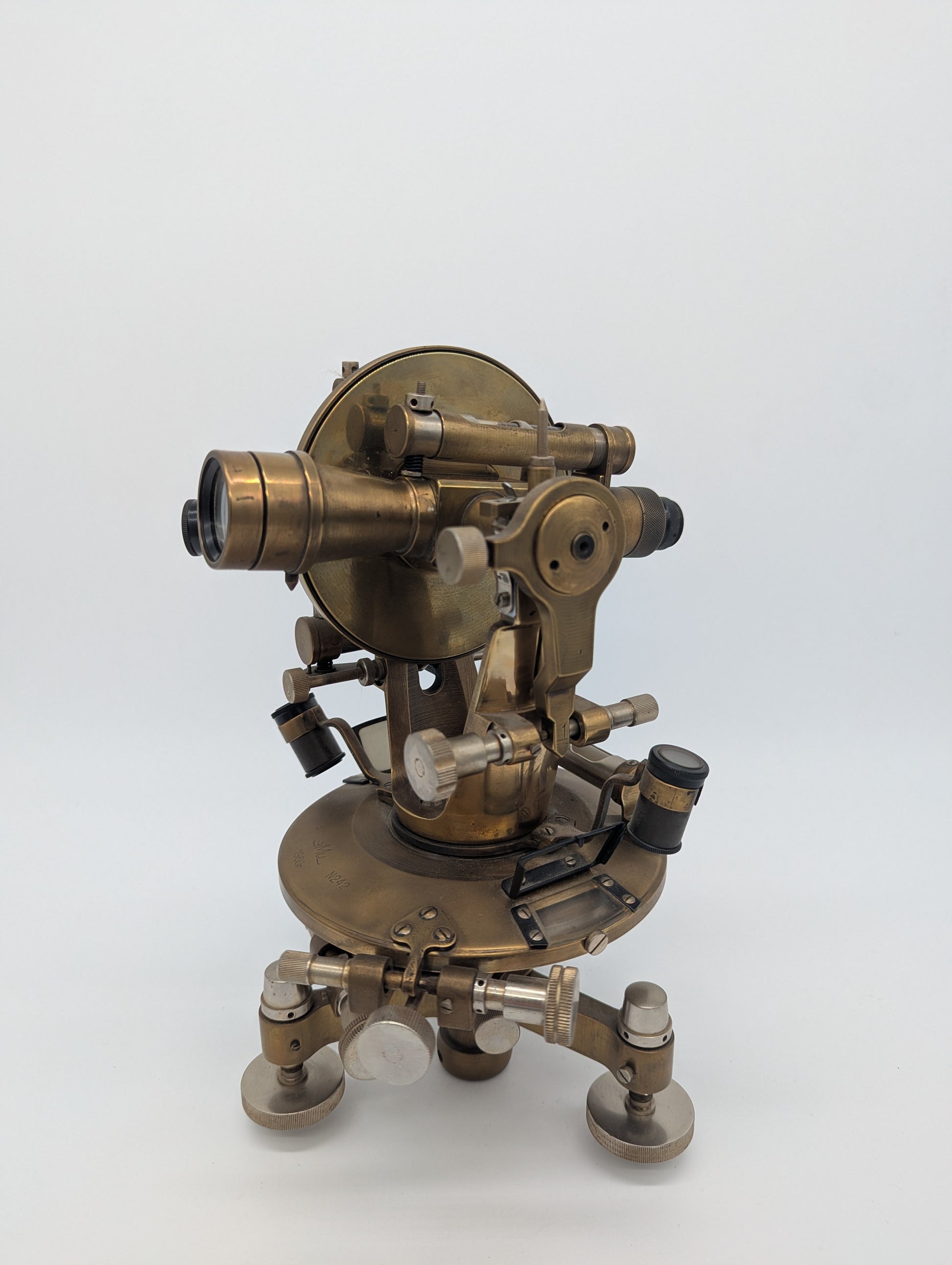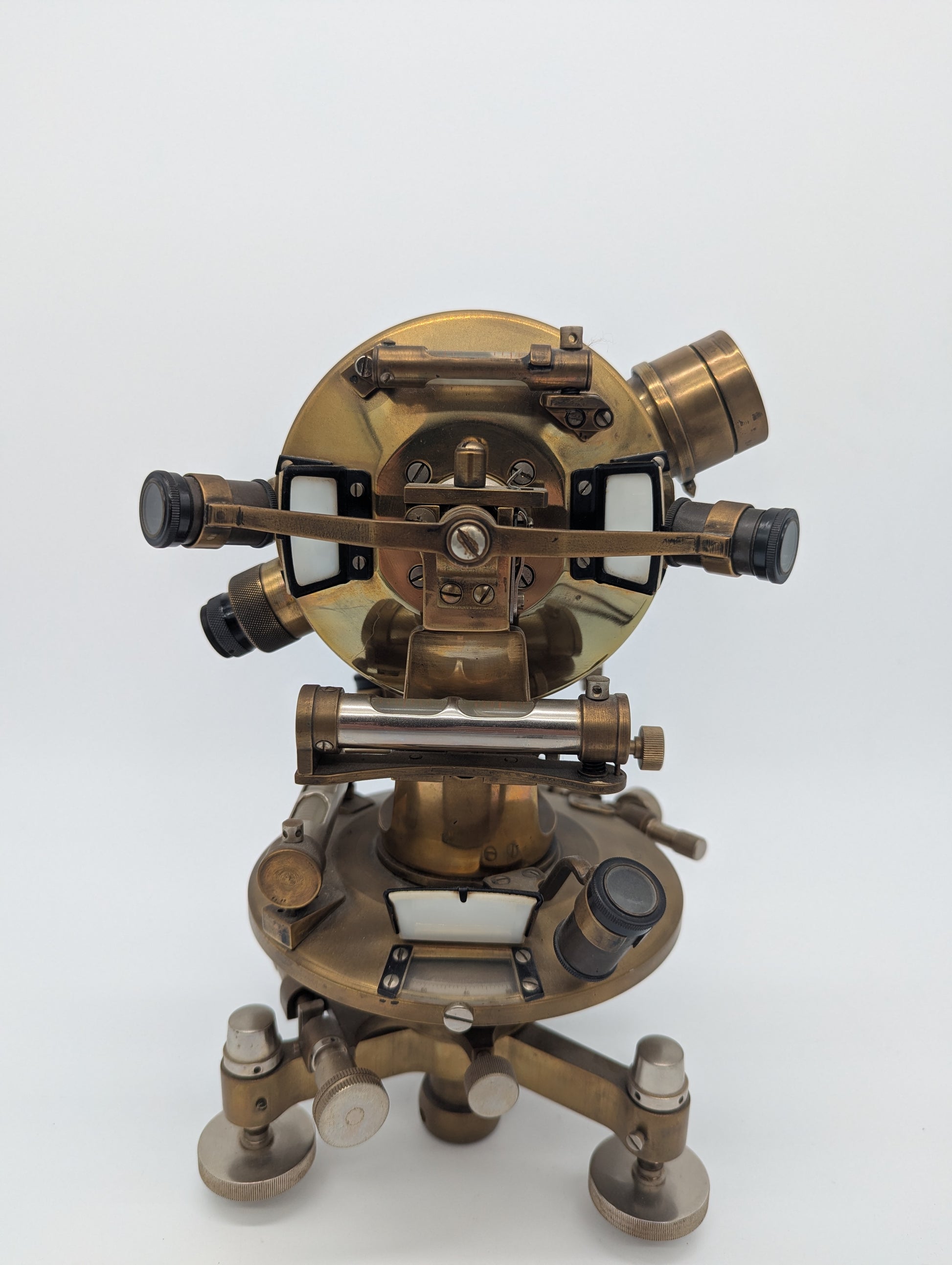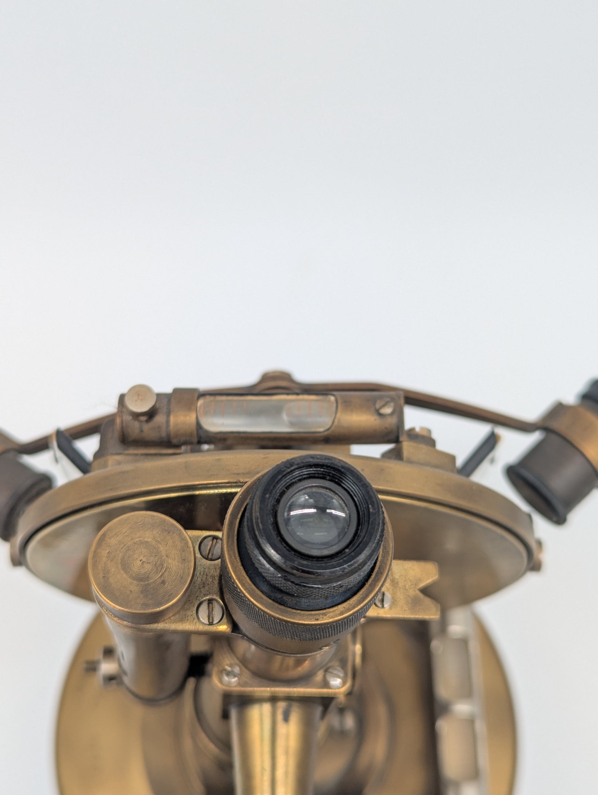 Dieser klassische Theodolit ist ein hochwertiges Präzisionsinstrument aus Messing mit zahlreichen Stellschrauben, Justiermöglichkeiten und optischen Elementen. Er diente ursprünglich zur exakten Messung von Horizontal- und Vertikalwinkeln in der Vermessungstechnik und ist heute ein begehrtes Sammlerstück oder dekoratives Objekt für Technikliebhaber.