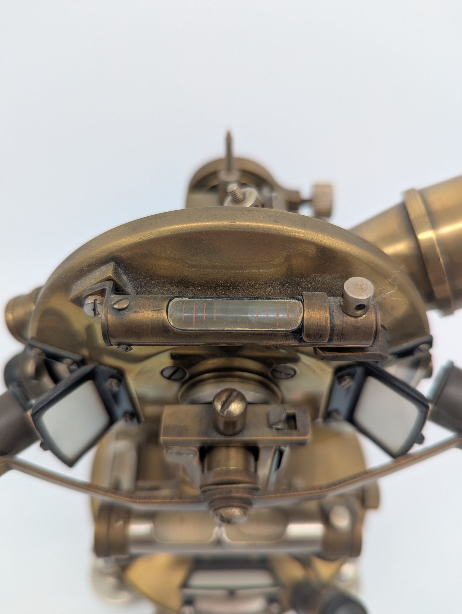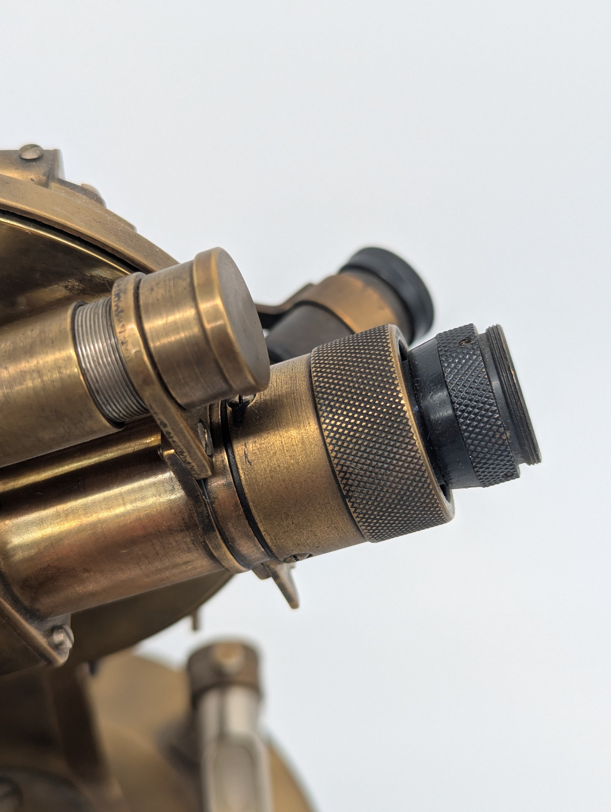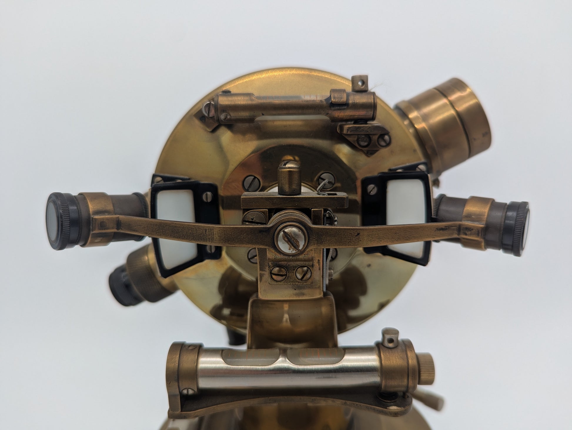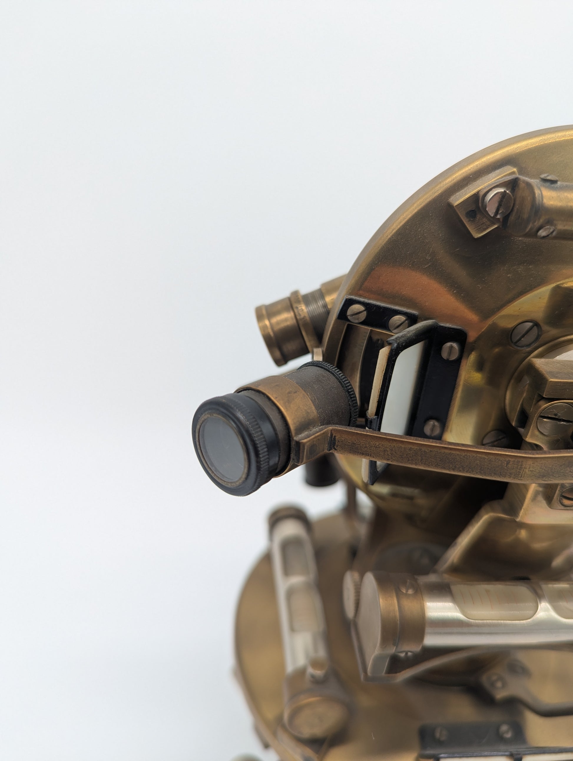 Dieser klassische Theodolit ist ein hochwertiges Präzisionsinstrument aus Messing mit zahlreichen Stellschrauben, Justiermöglichkeiten und optischen Elementen. Er diente ursprünglich zur exakten Messung von Horizontal- und Vertikalwinkeln in der Vermessungstechnik und ist heute ein begehrtes Sammlerstück oder dekoratives Objekt für Technikliebhaber.