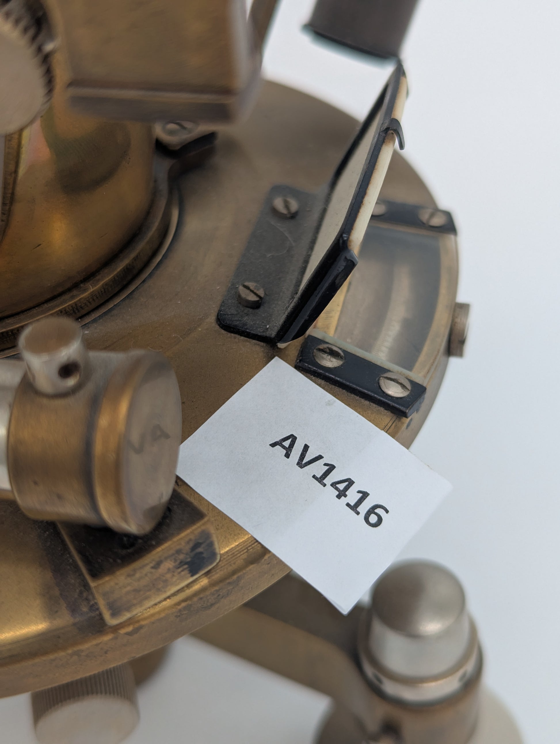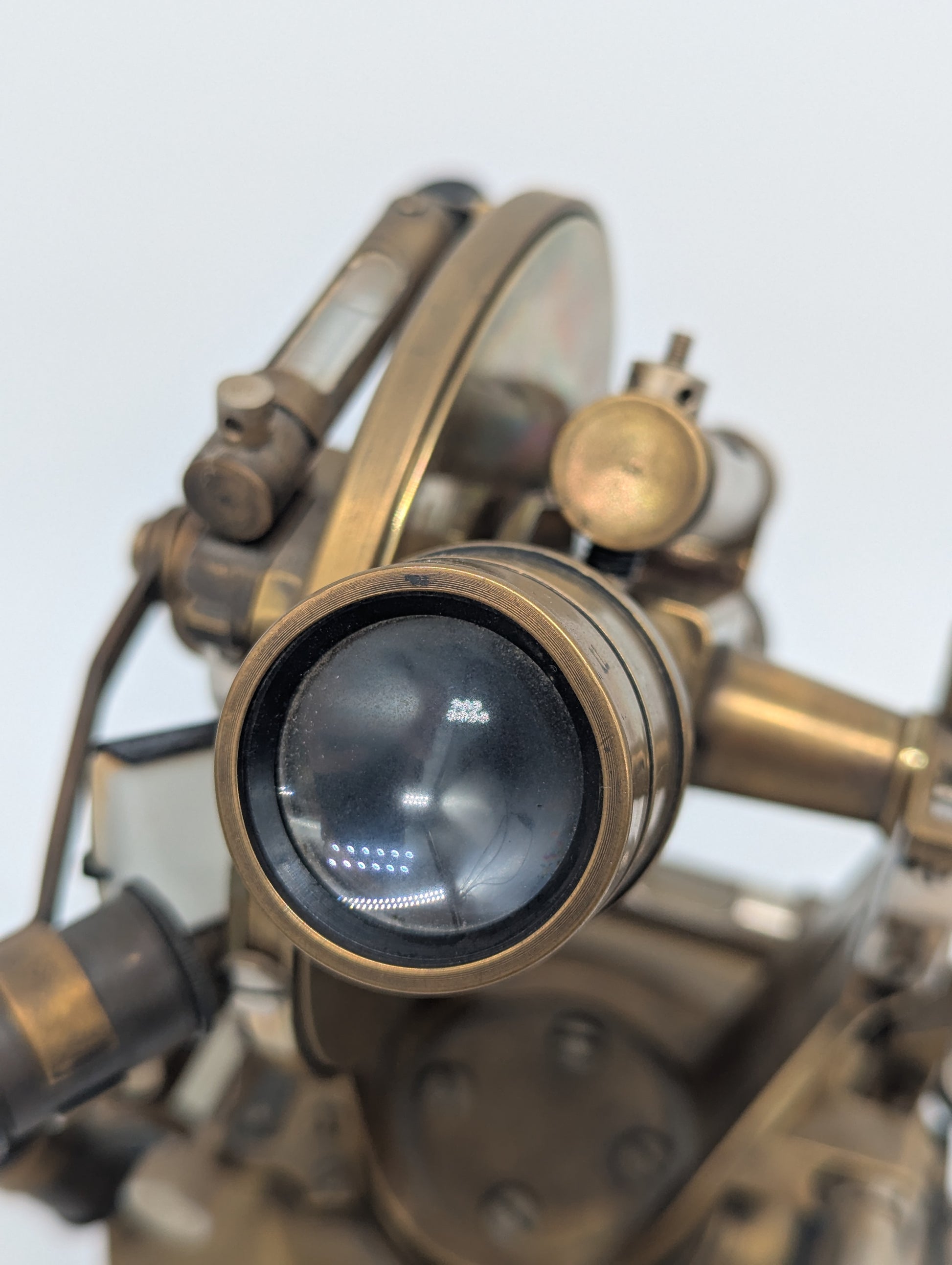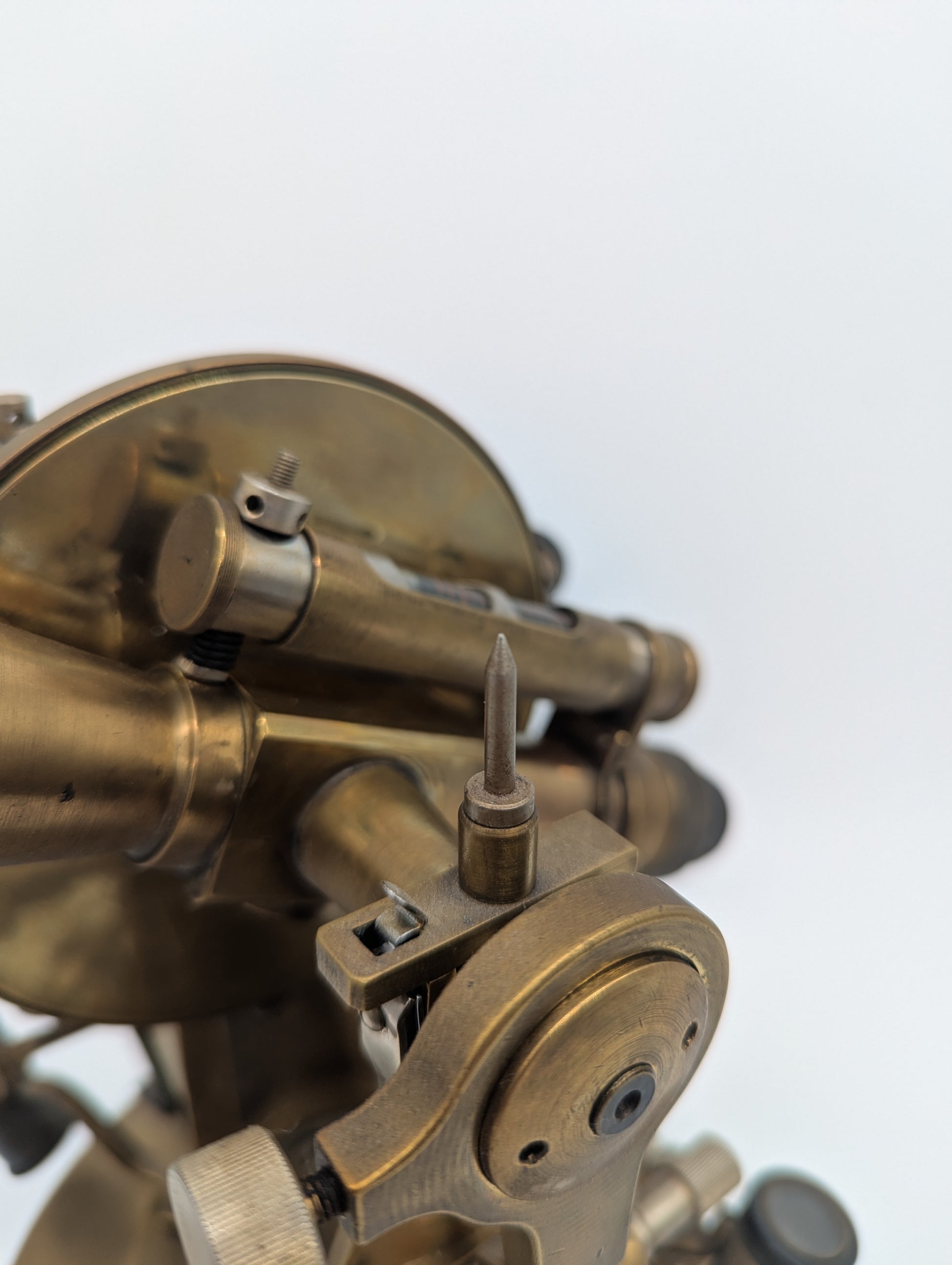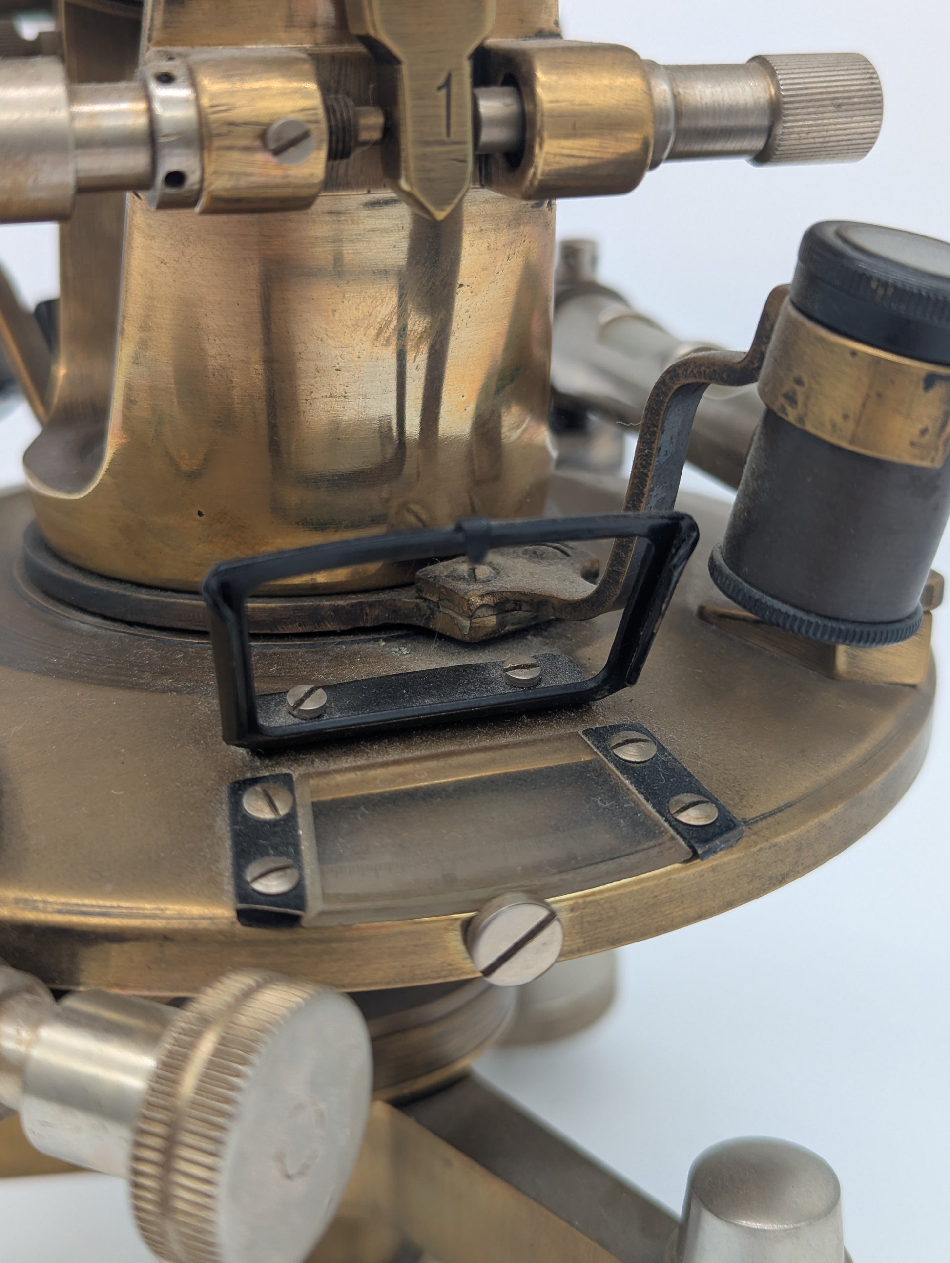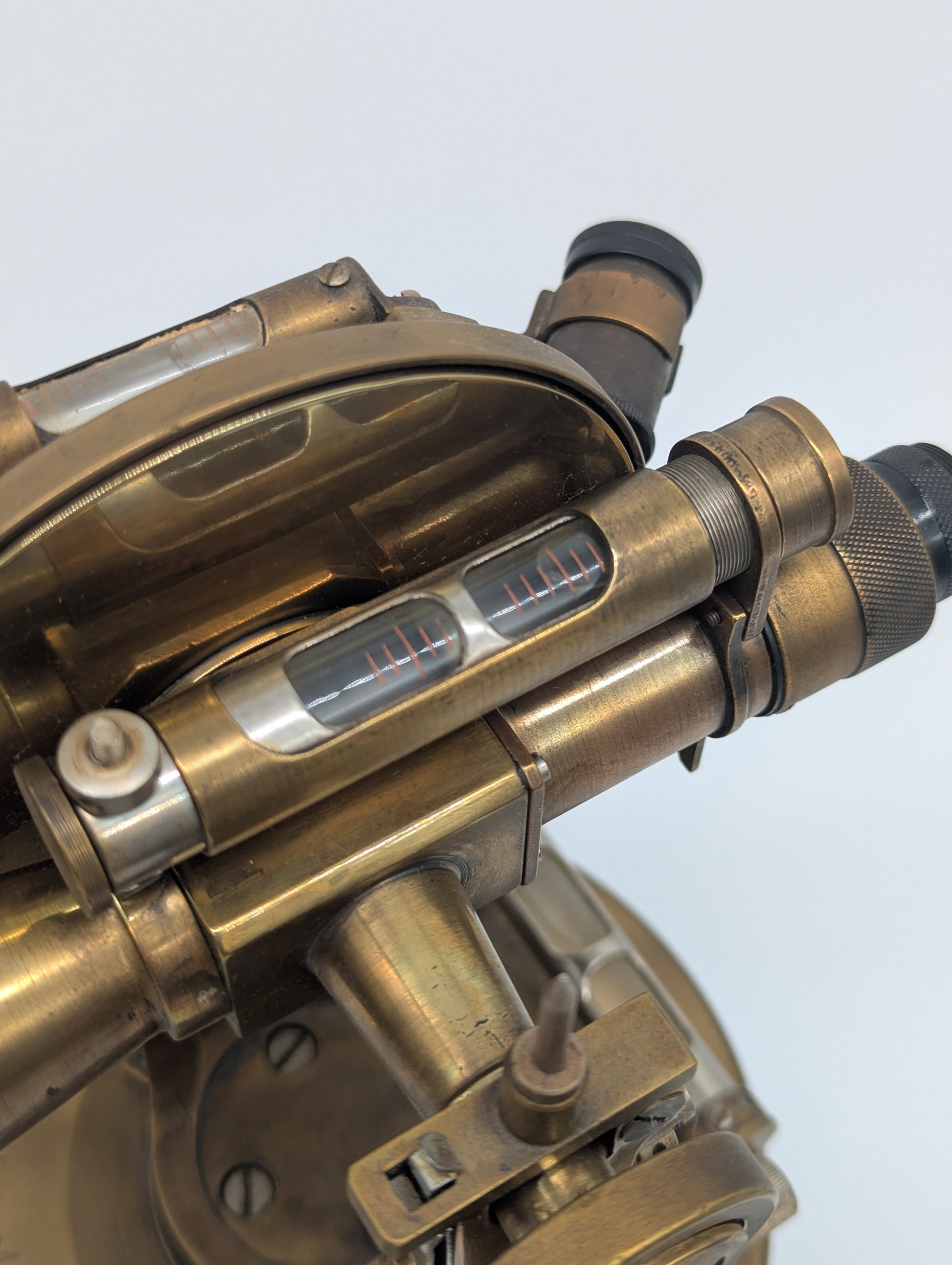 Dieser klassische Theodolit ist ein hochwertiges Präzisionsinstrument aus Messing mit zahlreichen Stellschrauben, Justiermöglichkeiten und optischen Elementen. Er diente ursprünglich zur exakten Messung von Horizontal- und Vertikalwinkeln in der Vermessungstechnik und ist heute ein begehrtes Sammlerstück oder dekoratives Objekt für Technikliebhaber.