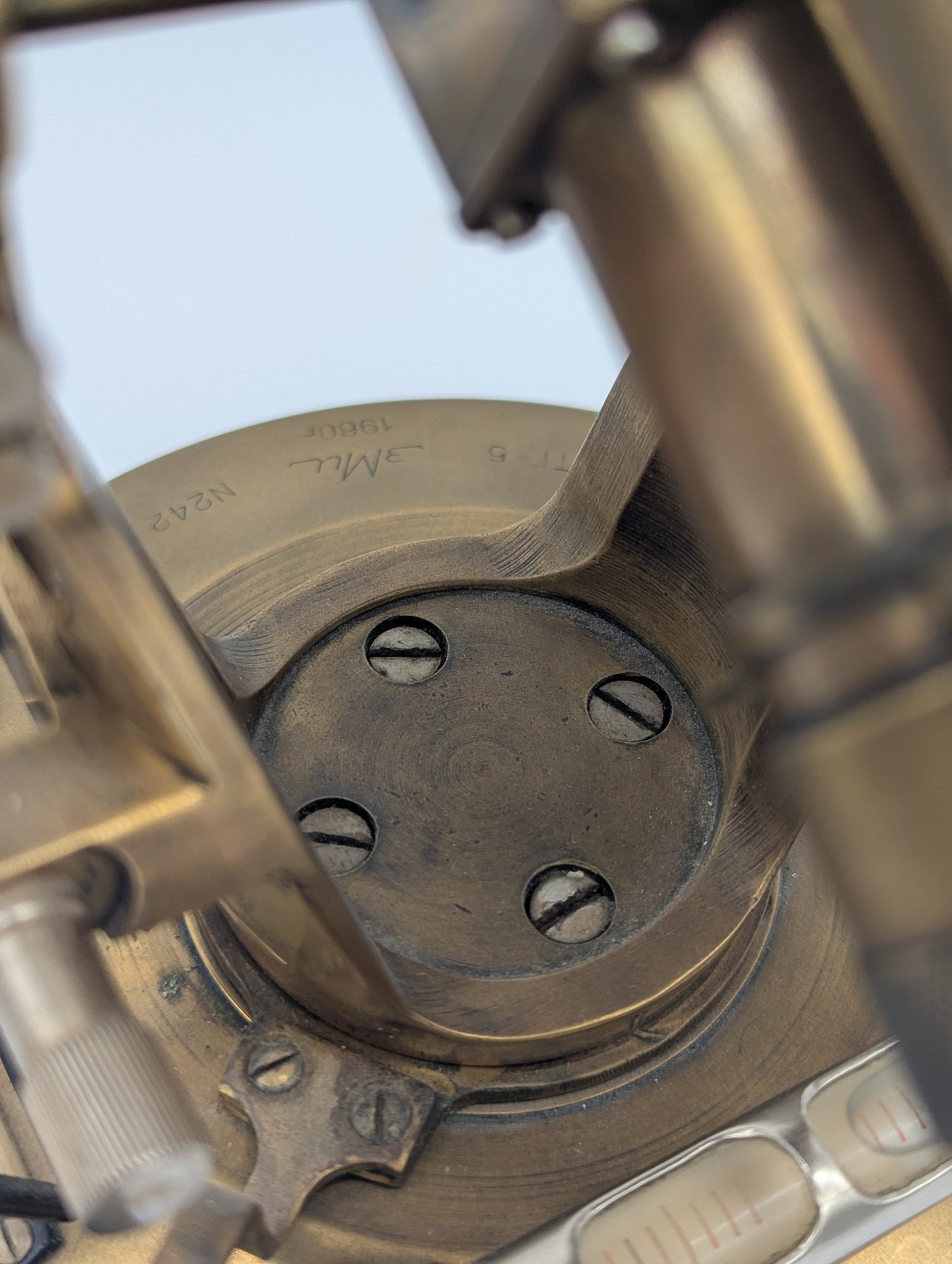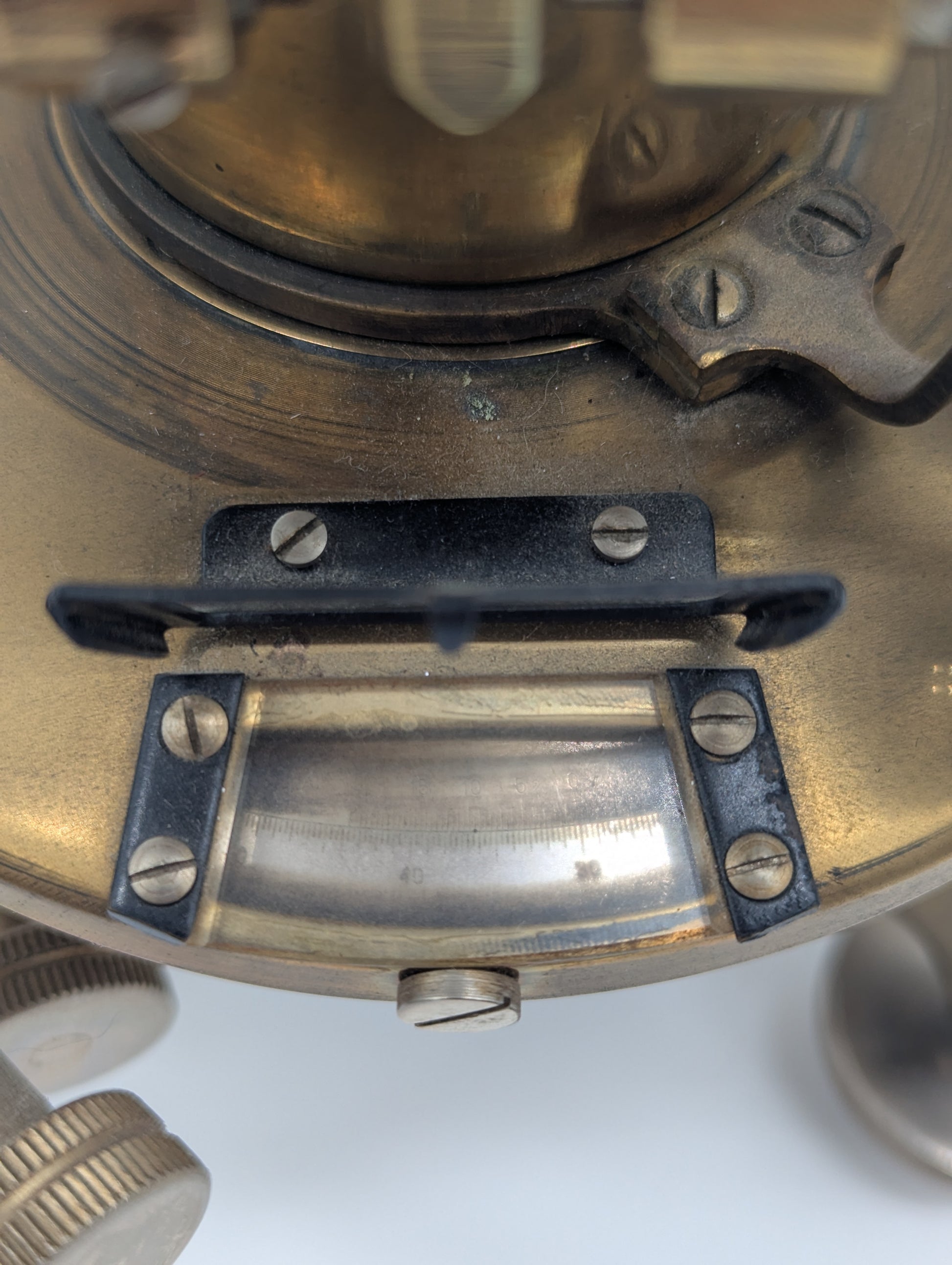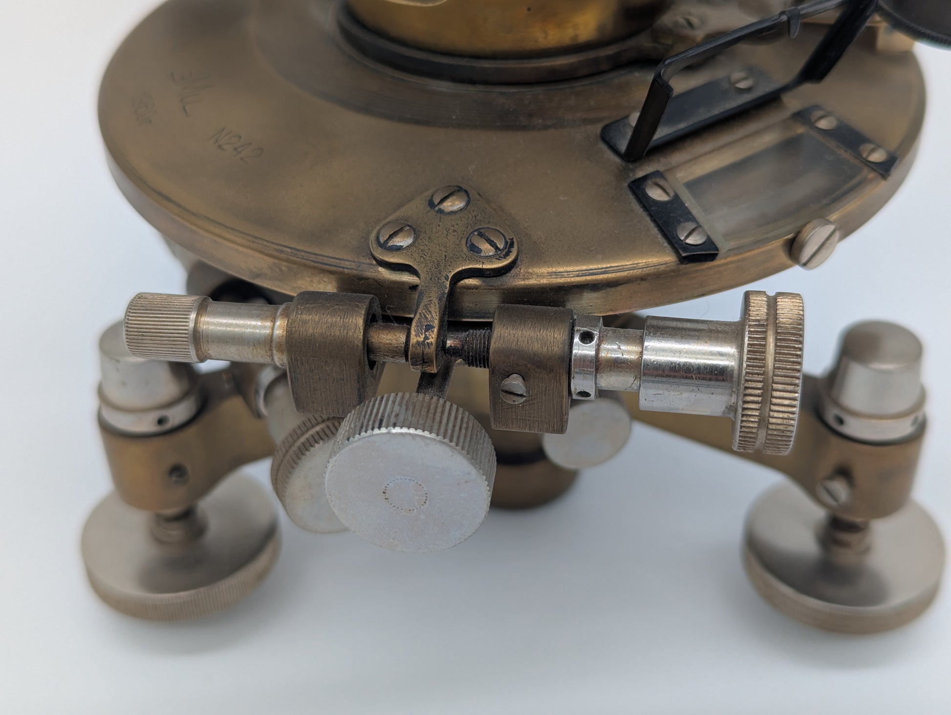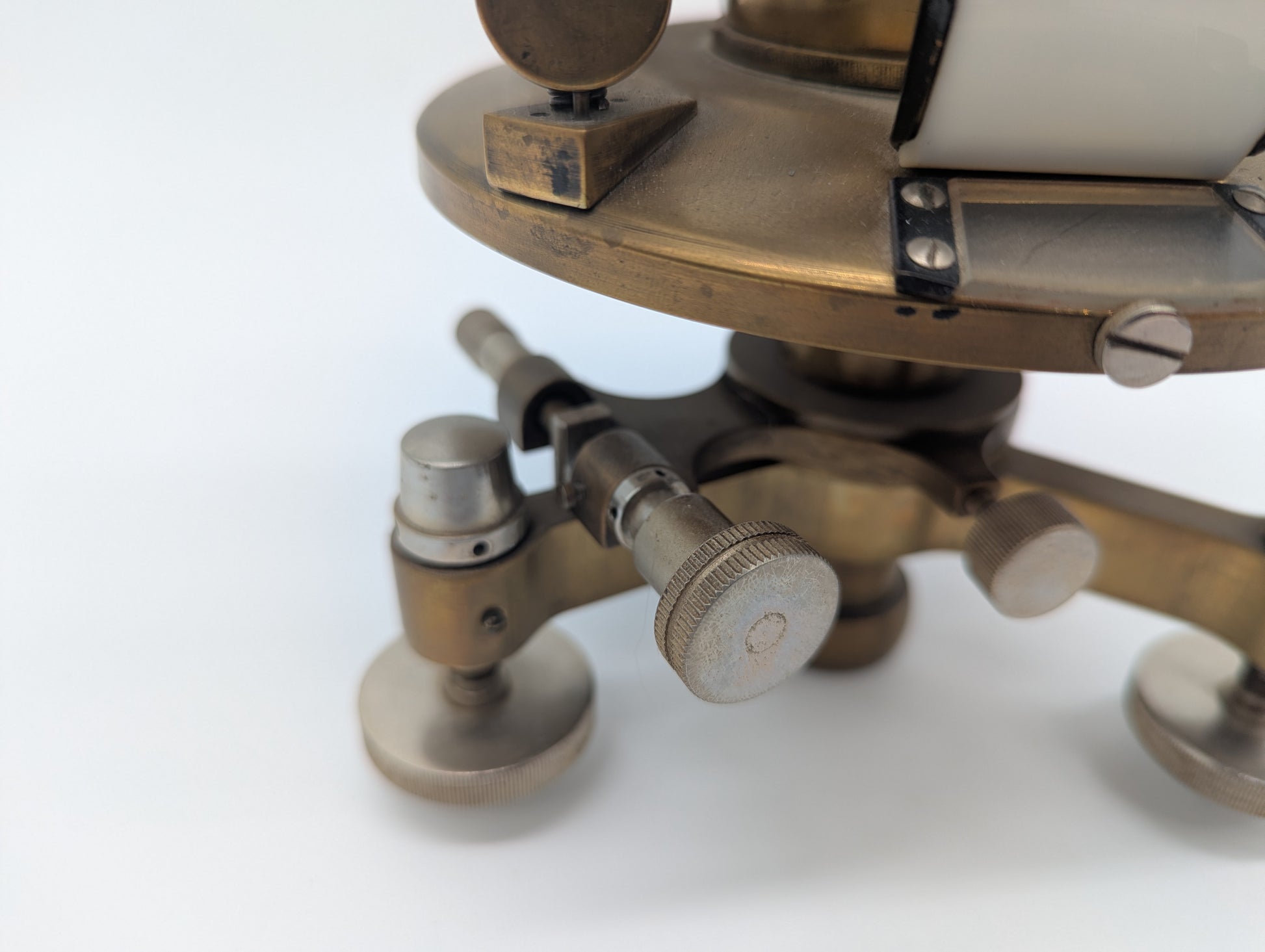 Das Gerät überzeugt durch seine aufwendige Verarbeitung: ein Messing-Fernrohr, fein gearbeitete Rändelschrauben aus Metall sowie eine stabile Basis mit drei Stellfüßen zur exakten Nivellierung. Typisch für solche Instrumente ist die komplexe Mechanik, die auch bei diesem Exemplar weitgehend intakt erscheint.