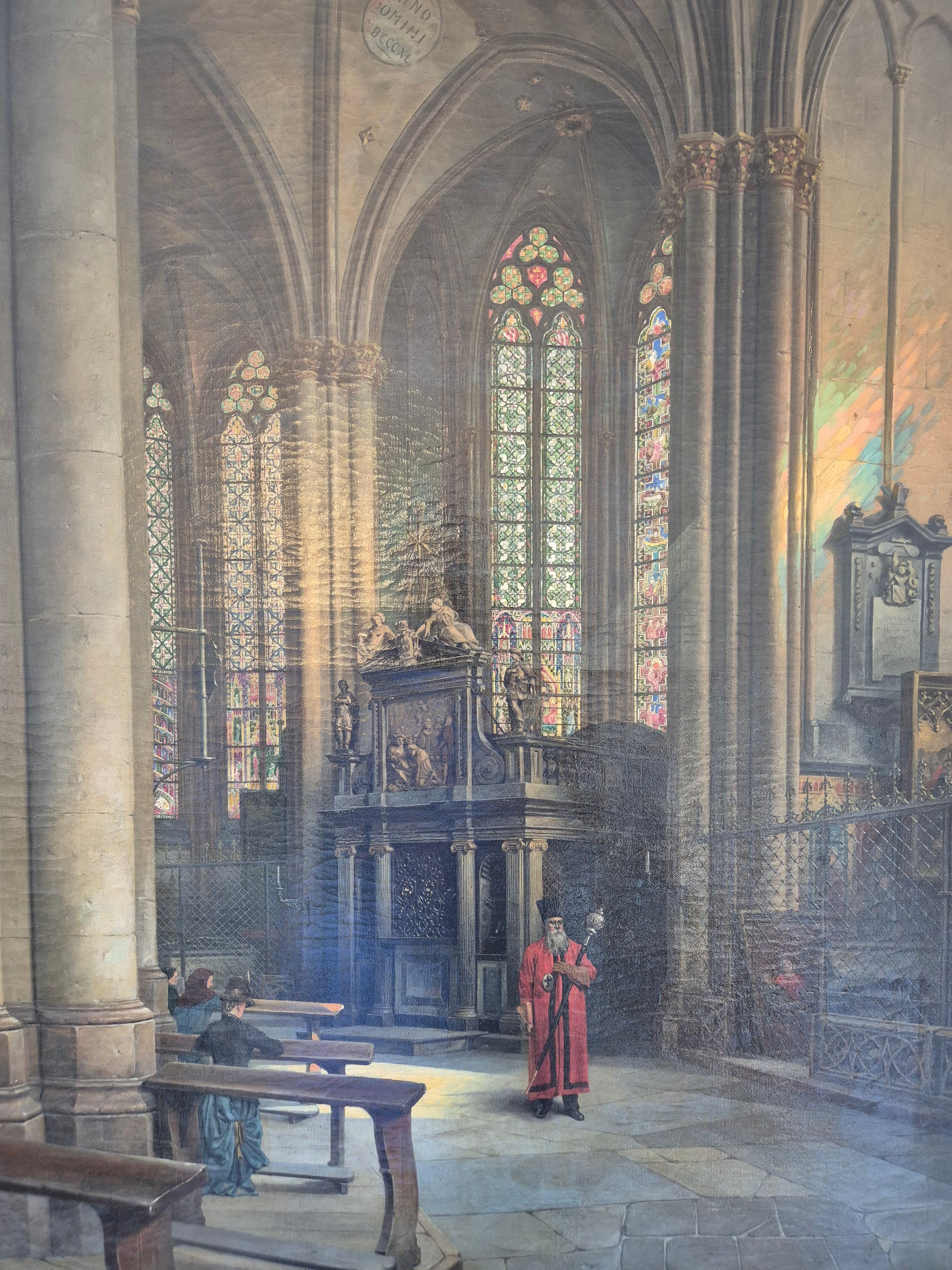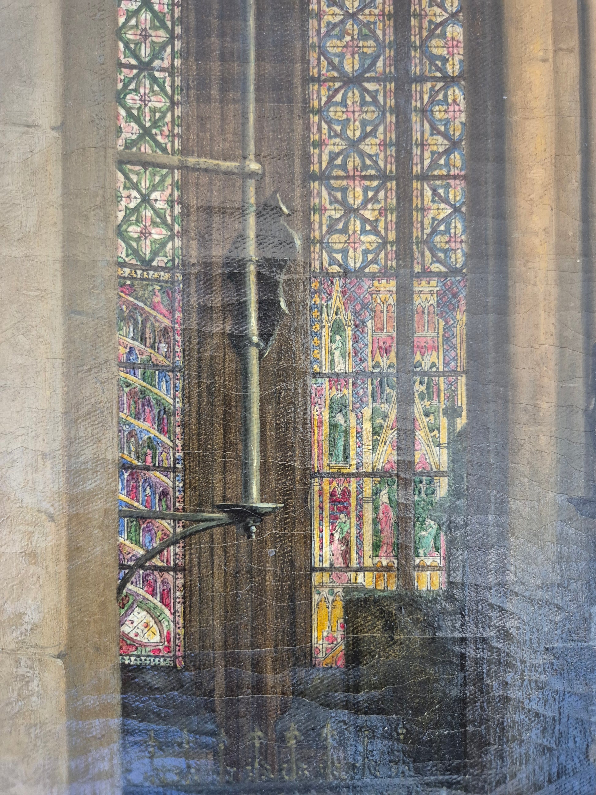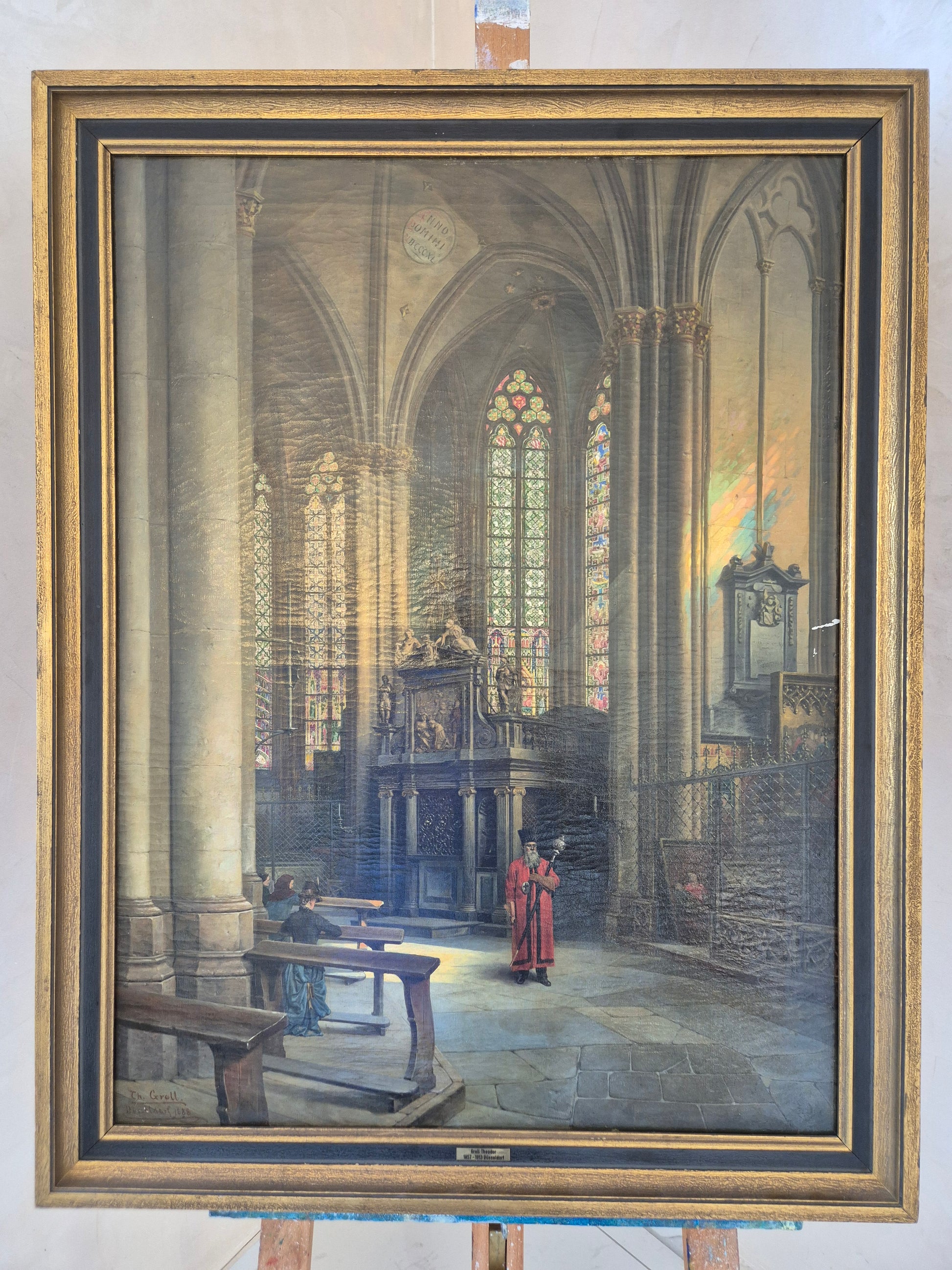 Herzlich willkommen, angeboten wird ein meisterhaft ausgeführtes Interieur-Gemälde von Theodor Groll, das eine stimmungsvolle Innenansicht des Kölner Doms 1888 zeigt. Das Werk besticht durch außergewöhnliche Detailtreue und atmosphärisches Lichtspiel: Farbenprächtige Kirchenfenster werfen ihr gefiltertes Licht auf das gotische Mauerwerk und lassen Tiefe sowie Raumwirkung lebendig werden.