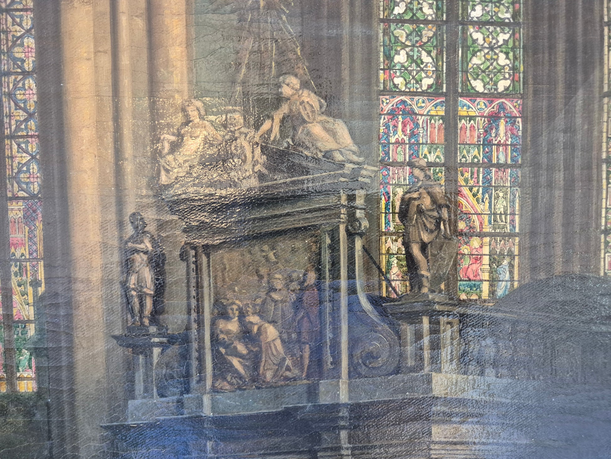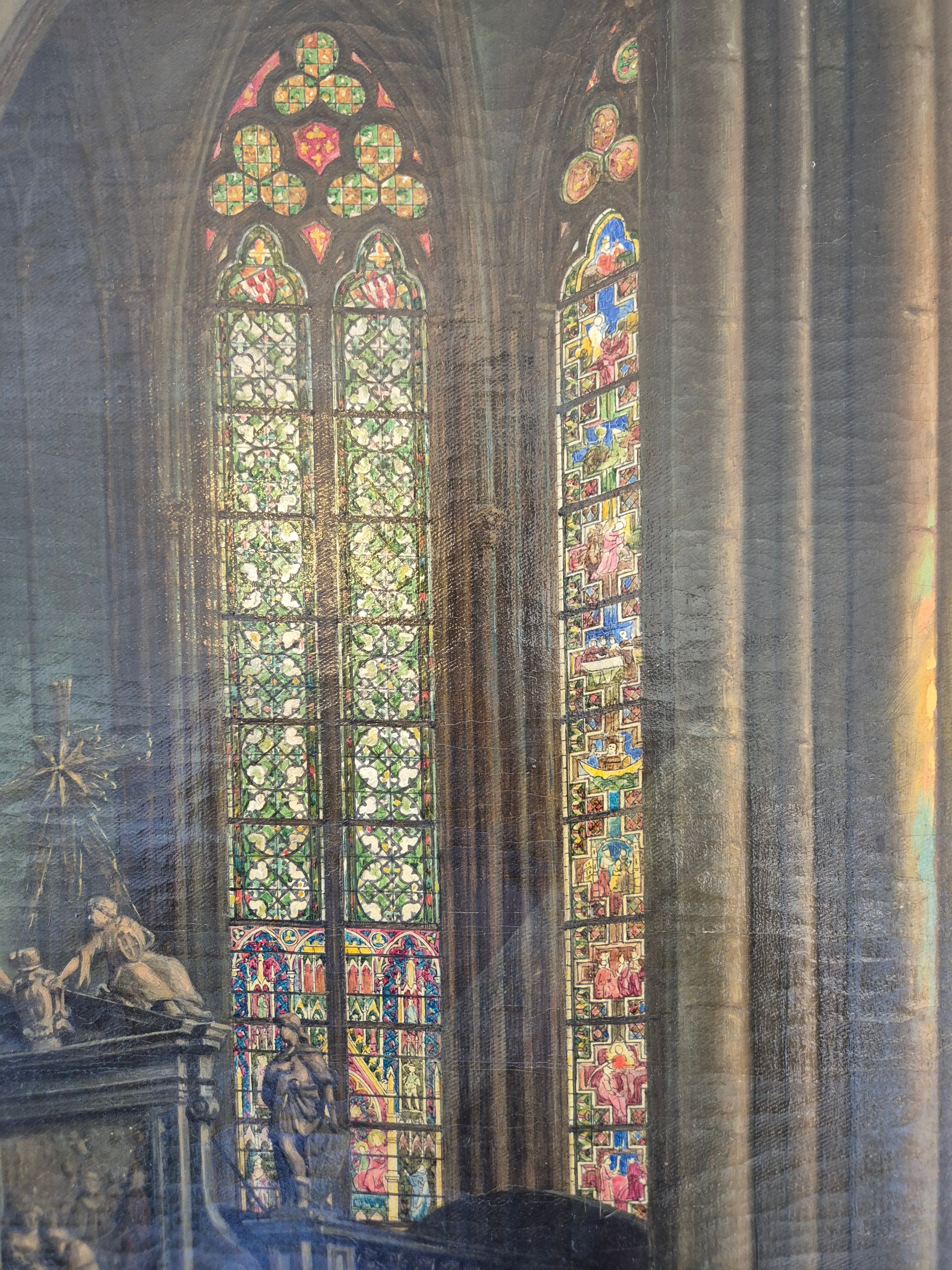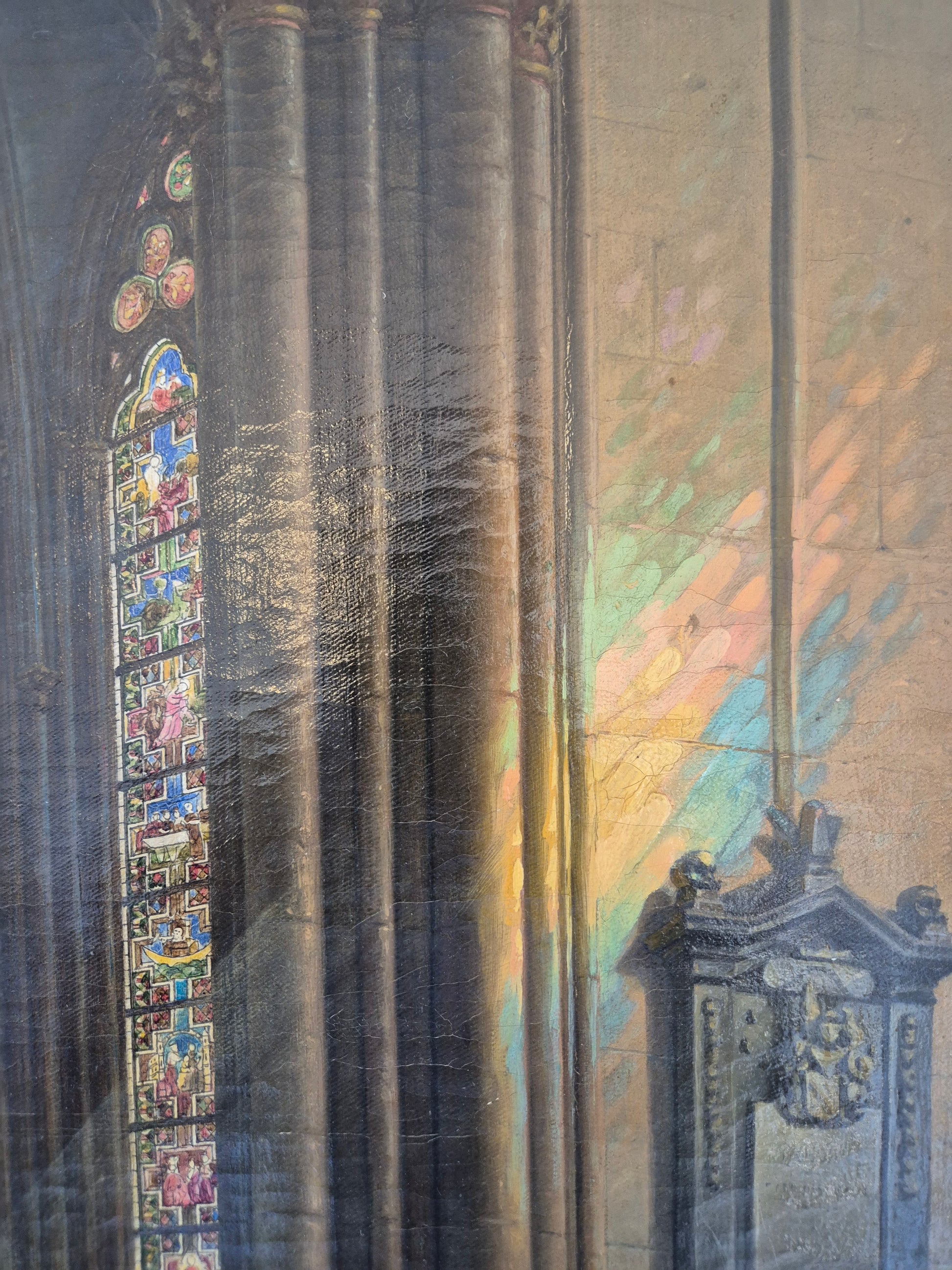 Herzlich willkommen, angeboten wird ein meisterhaft ausgeführtes Interieur-Gemälde von Theodor Groll, das eine stimmungsvolle Innenansicht des Kölner Doms 1888 zeigt. Das Werk besticht durch außergewöhnliche Detailtreue und atmosphärisches Lichtspiel: Farbenprächtige Kirchenfenster werfen ihr gefiltertes Licht auf das gotische Mauerwerk und lassen Tiefe sowie Raumwirkung lebendig werden.