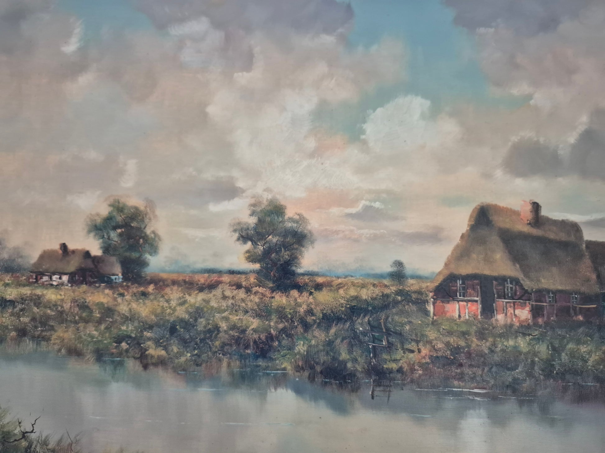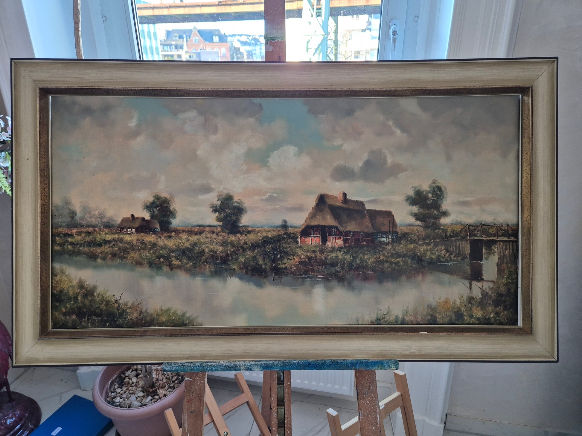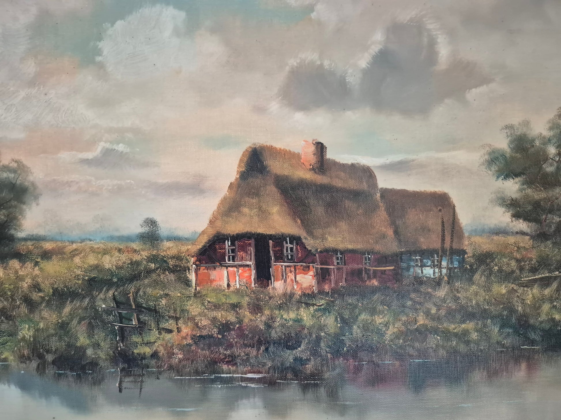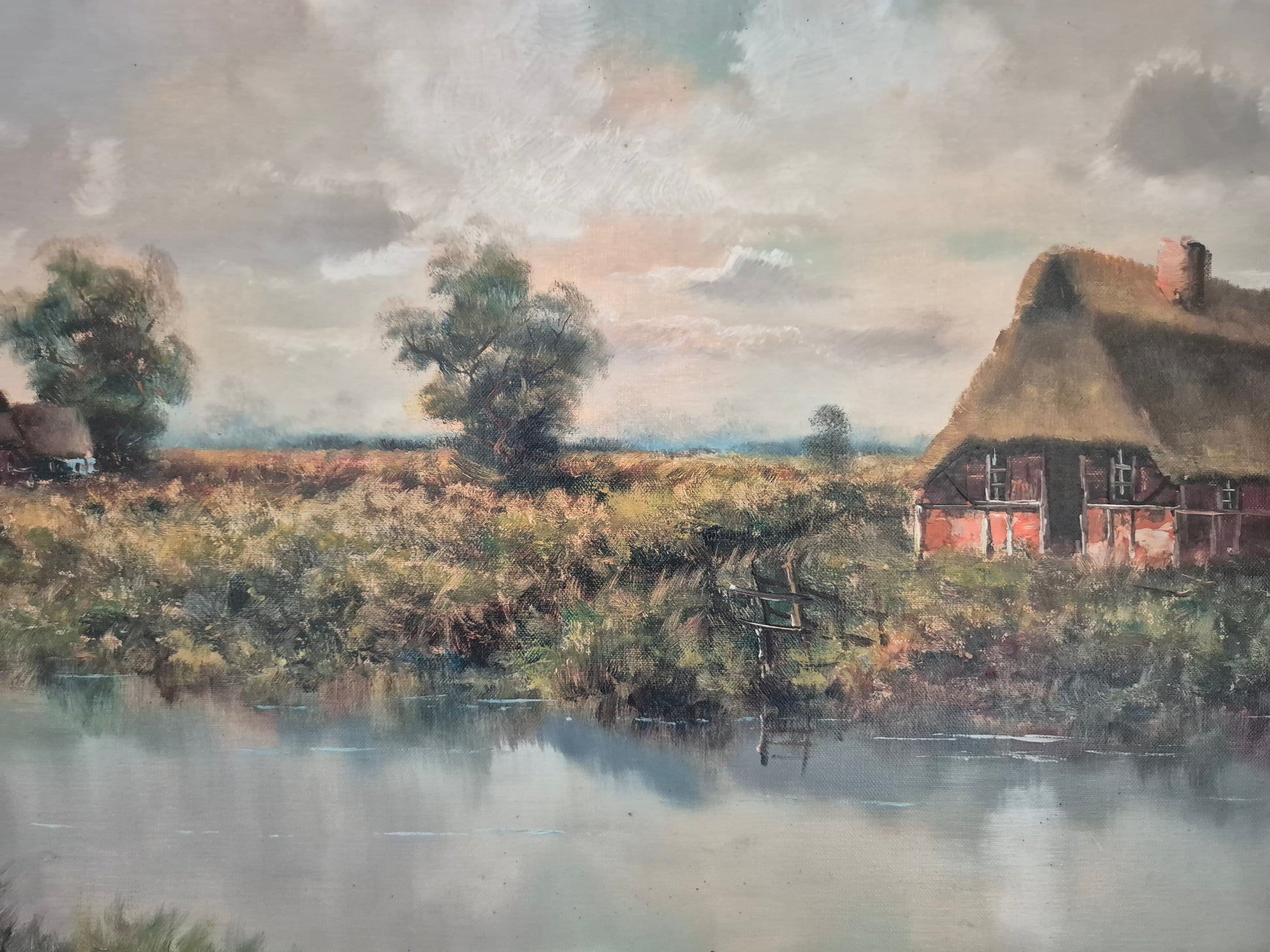 Beeindruckendes Ölgemälde auf Leinwand von Gerd Loboda mit einer stimmungsvollen Landschaftsdarstellung. Zu sehen ist eine idyllische Szene mit Häusern an einem ruhigen See, eingefangen in warmen Farben und mit ausdrucksstarkem Pinselstrich. Ein harmonisches Werk mit atmosphärischer Tiefe.