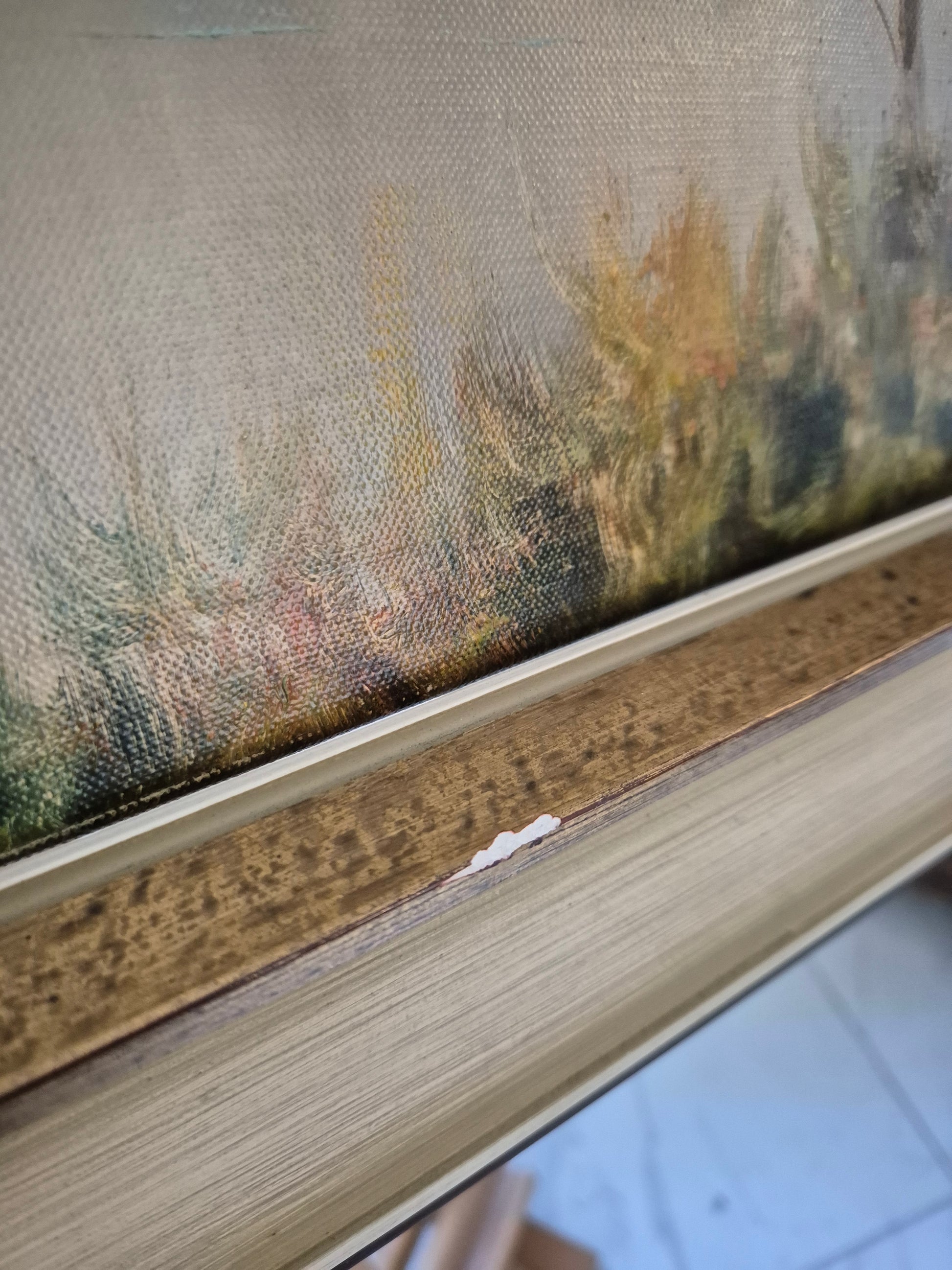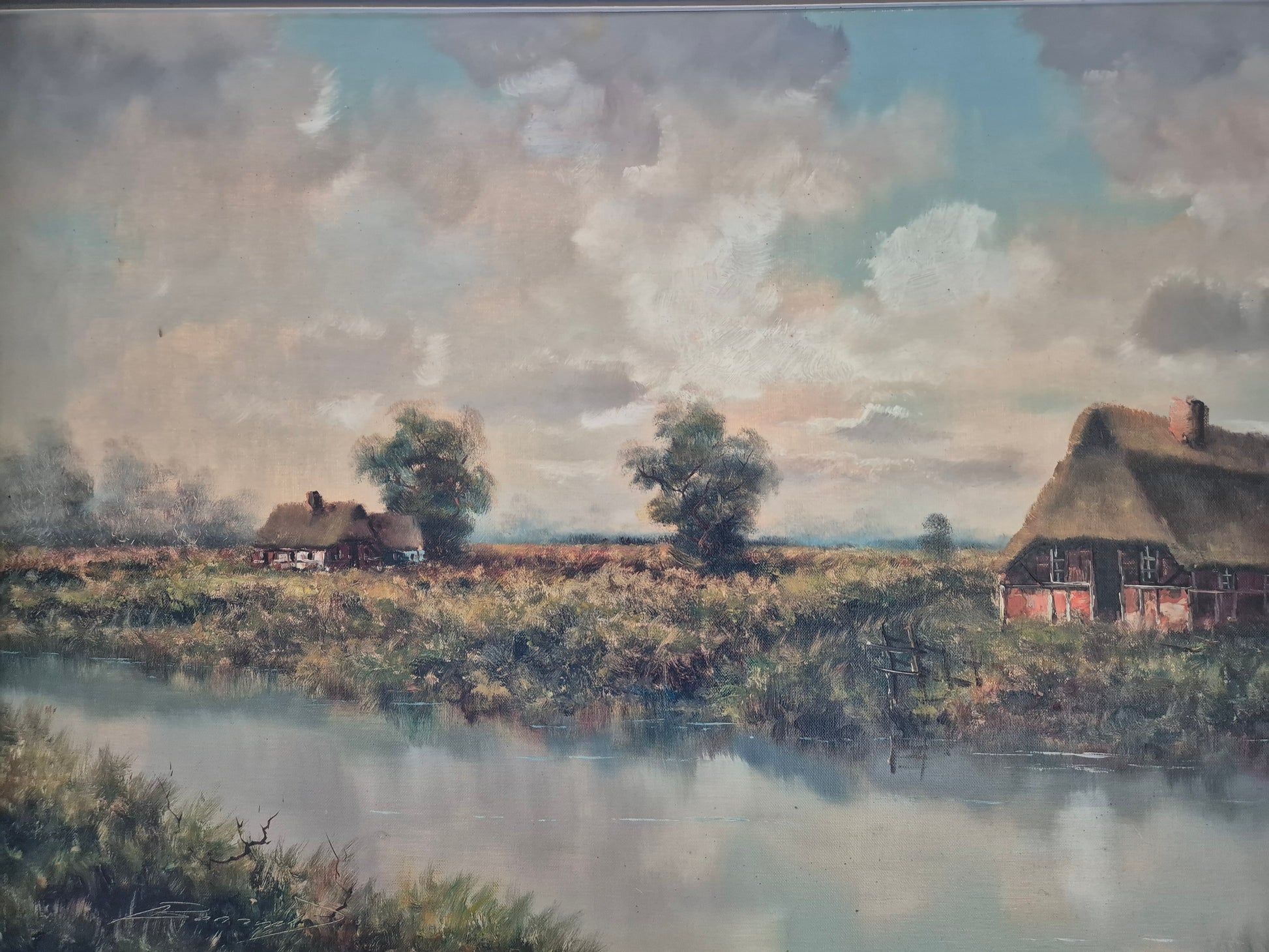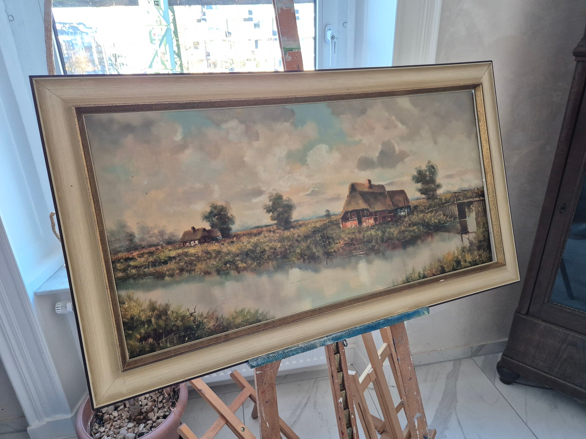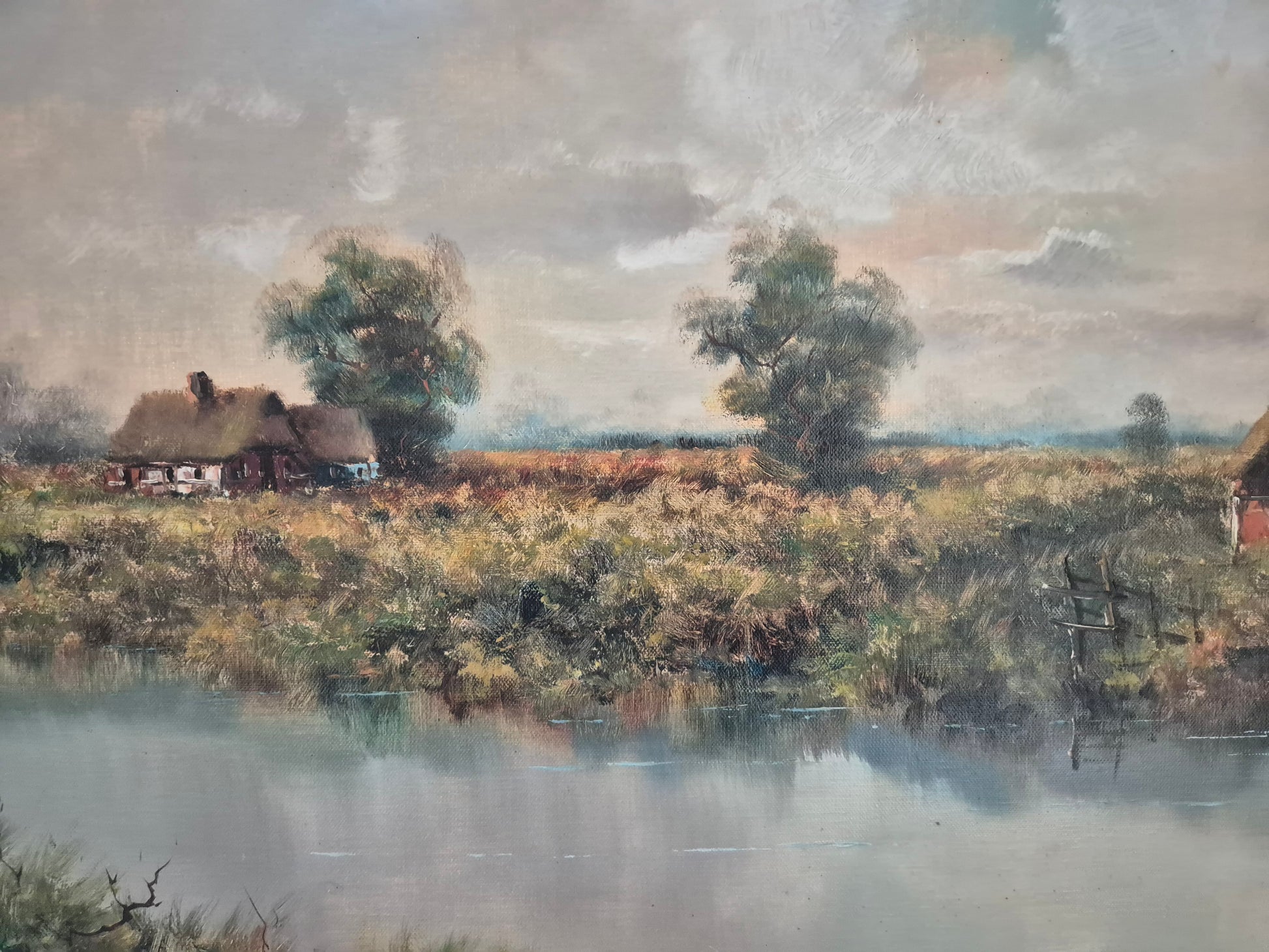 Beeindruckendes Ölgemälde auf Leinwand von Gerd Loboda mit einer stimmungsvollen Landschaftsdarstellung. Zu sehen ist eine idyllische Szene mit Häusern an einem ruhigen See, eingefangen in warmen Farben und mit ausdrucksstarkem Pinselstrich. Ein harmonisches Werk mit atmosphärischer Tiefe.