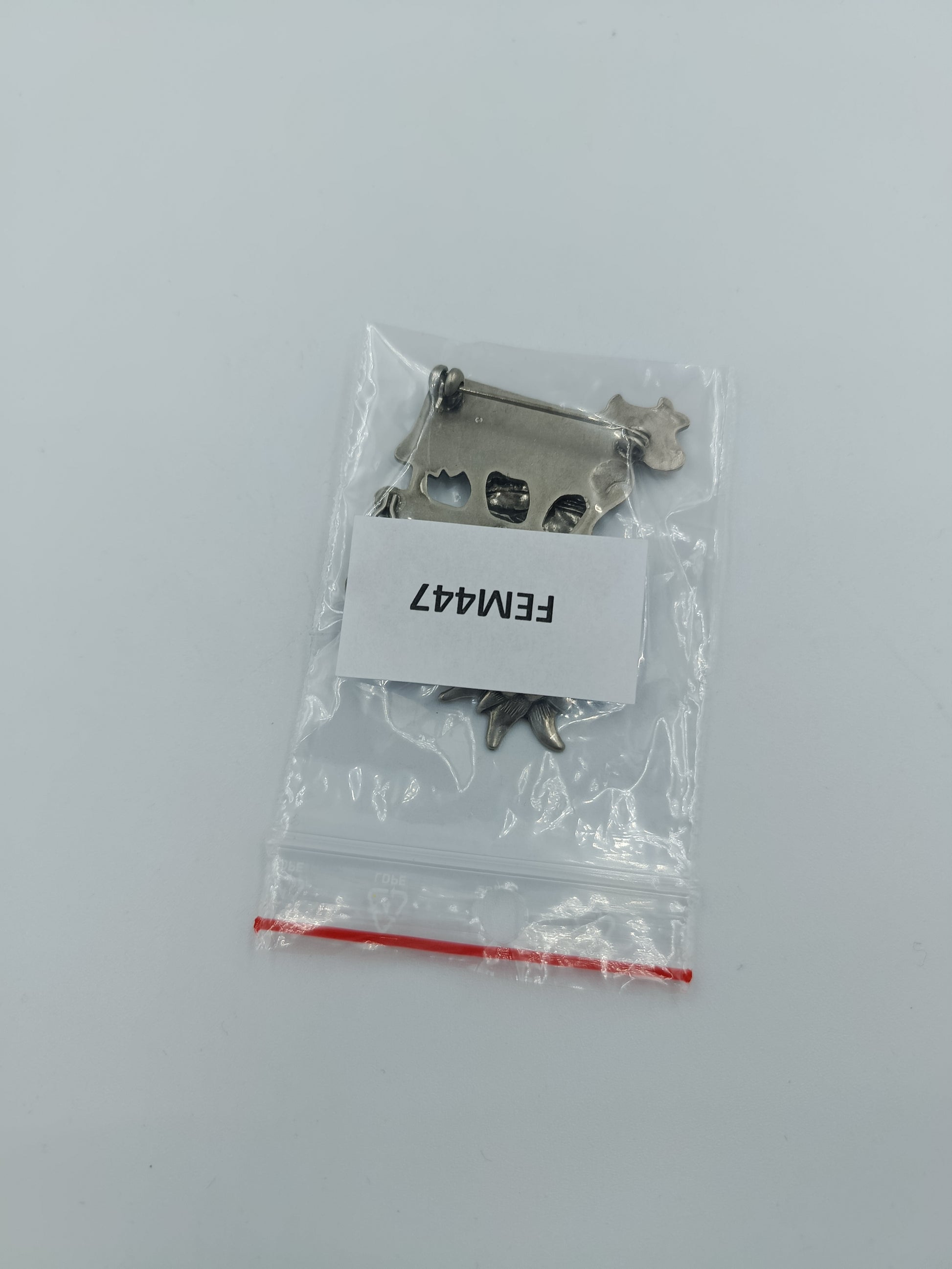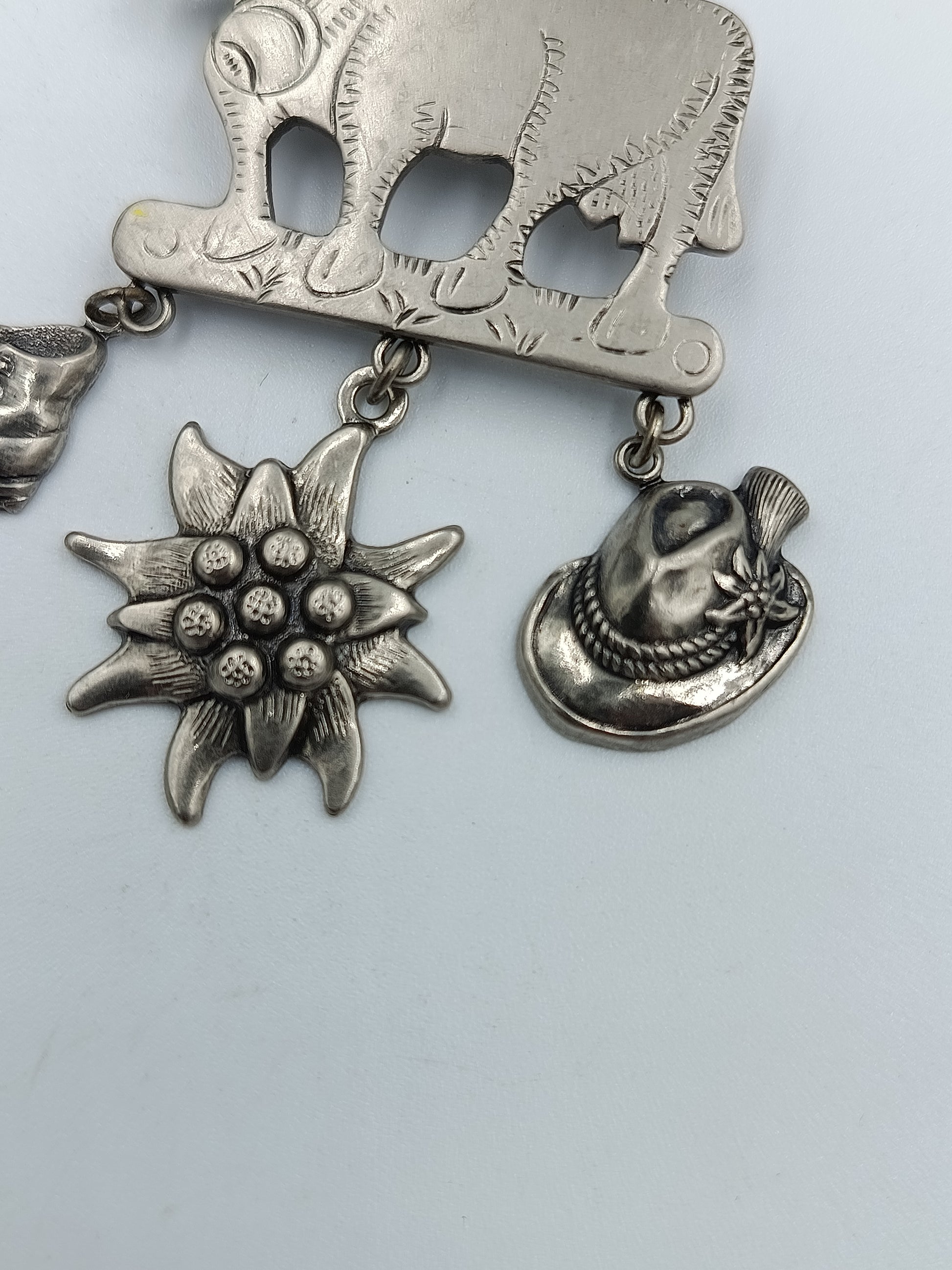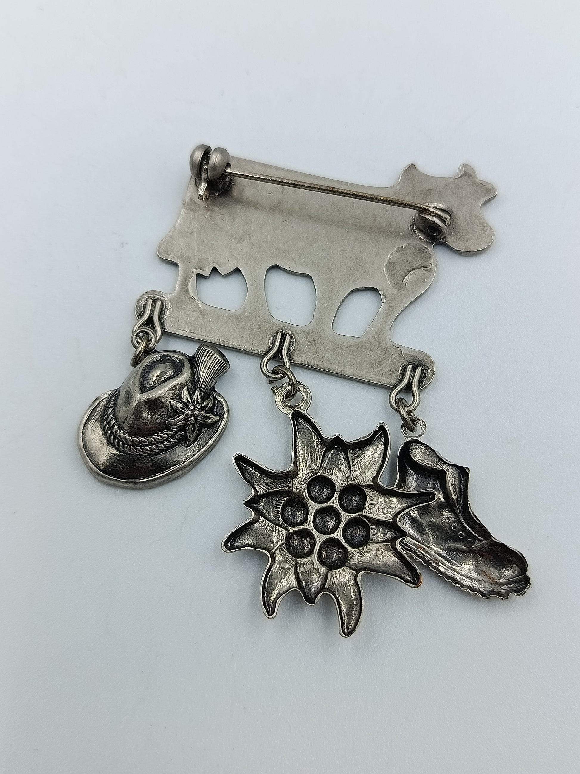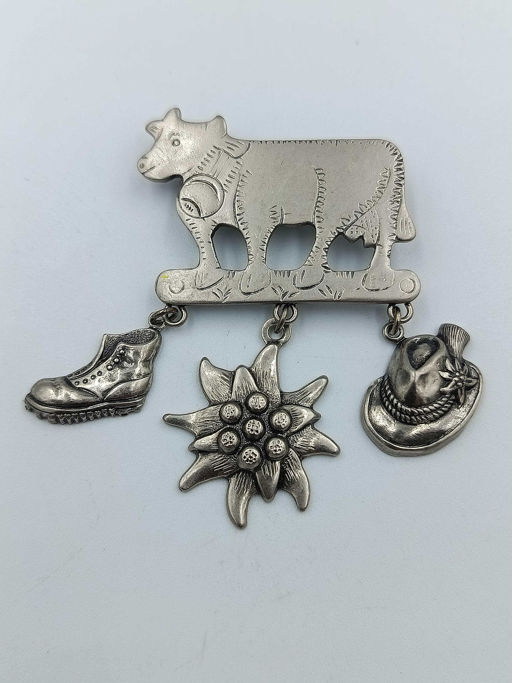 Charmante Vintage-Trachtenbrosche aus Metall im Motiv einer Kuh. An der Brosche sind drei bewegliche Anhänger befestigt: ein Bergschuh, eine Edelweißblüte und ein traditioneller Hut. Ein schönes Sammlerstück oder Accessoire für Liebhaber von Trachtenschmuck und alpinen Motiven.