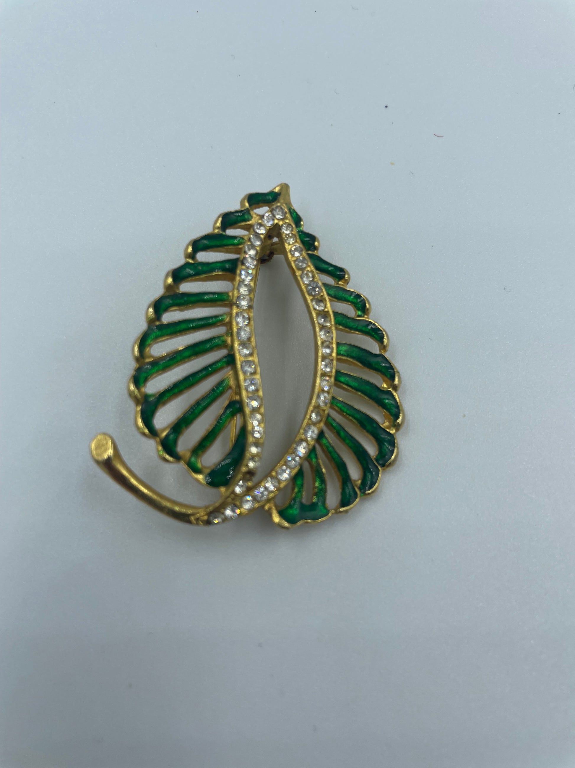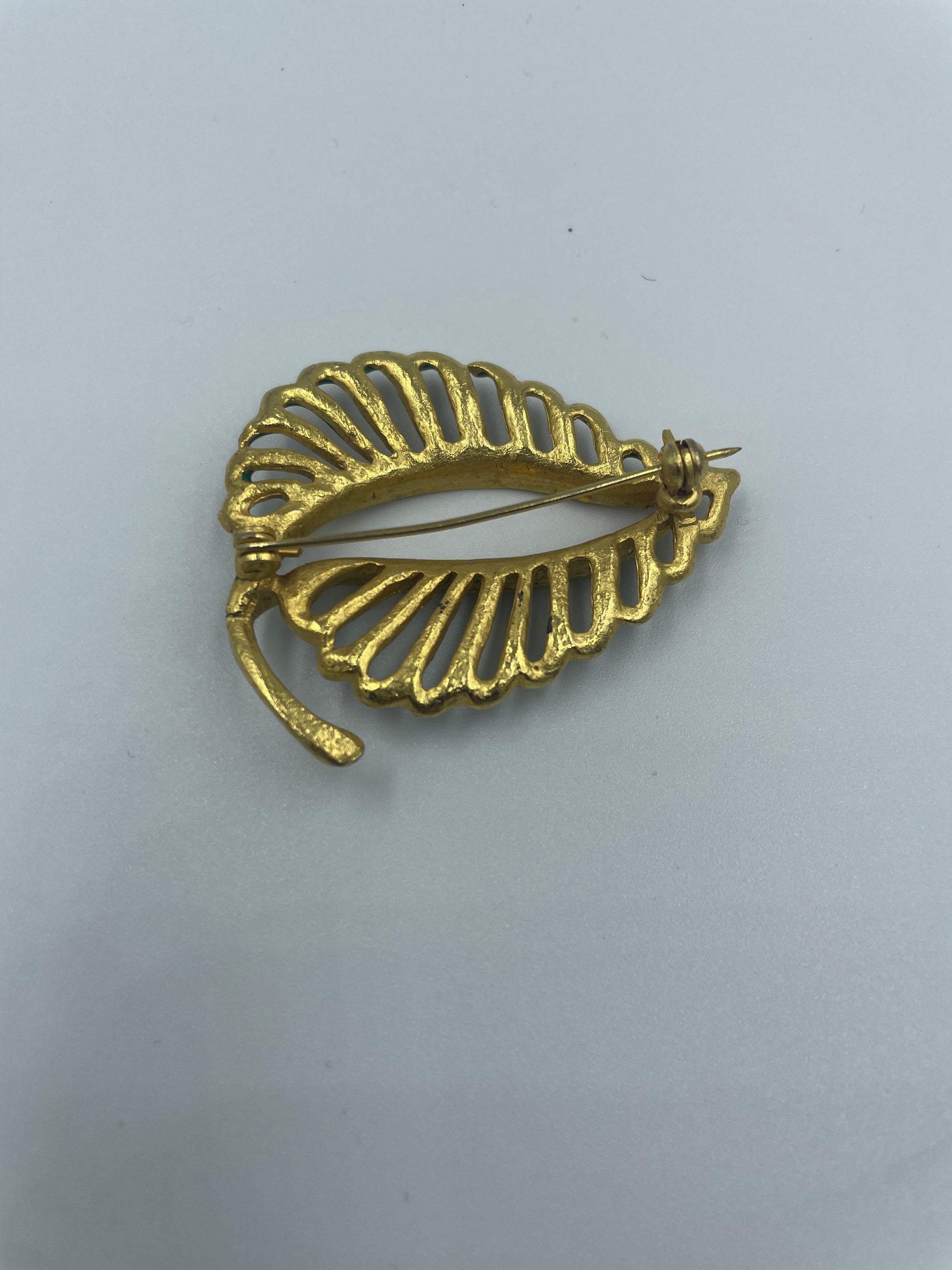 Diese elegante antike Brosche besticht durch ihr filigranes Blatt-Design, das mit zahlreichen funkelnden Steinen verziert ist. Die vergoldete Fassung verleiht dem Schmuckstück einen zeitlosen Glanz und hebt die feine Verarbeitung kunstvoll hervor. Ein stilvoller Akzent, der jedem Outfit eine edle Vintage-Note verleiht.