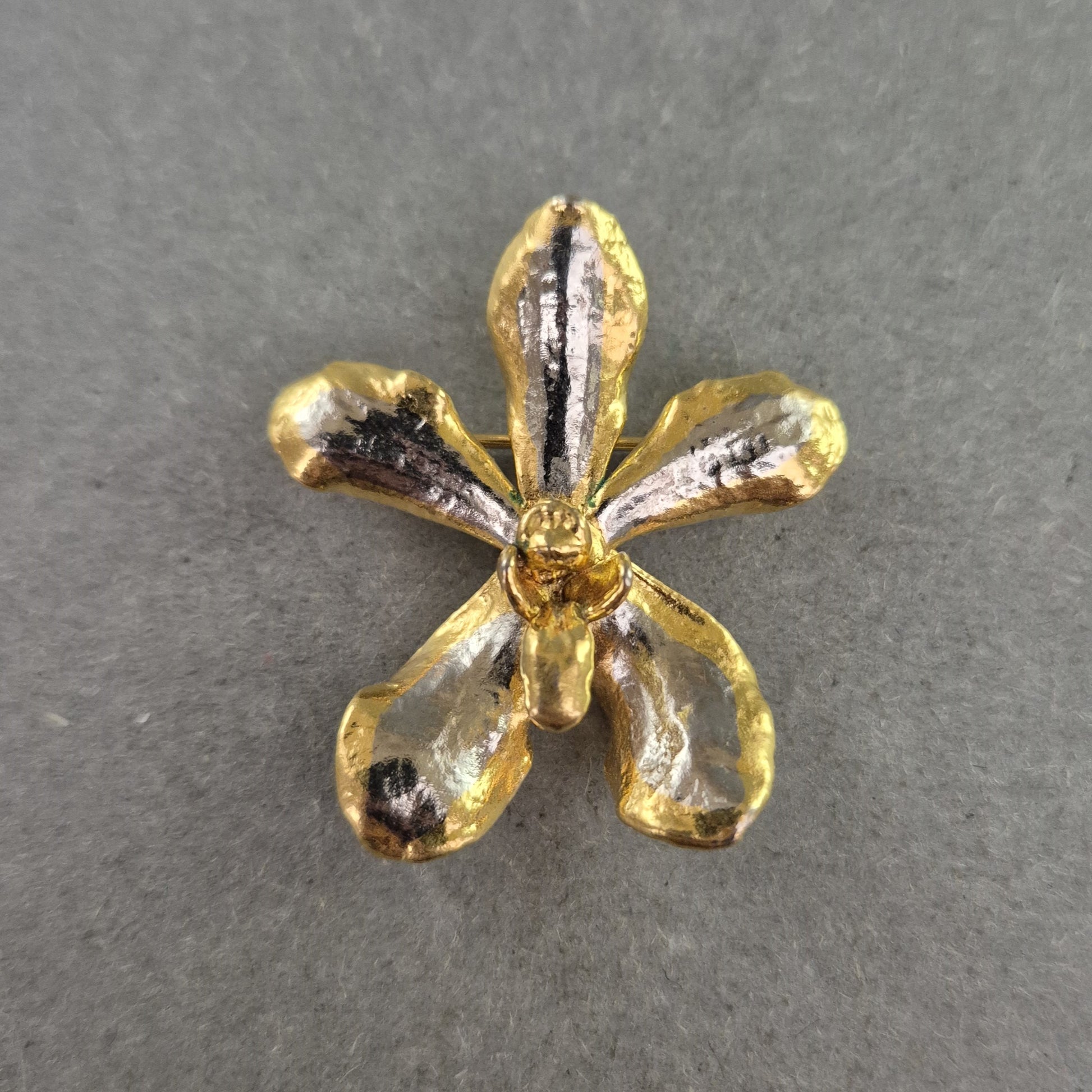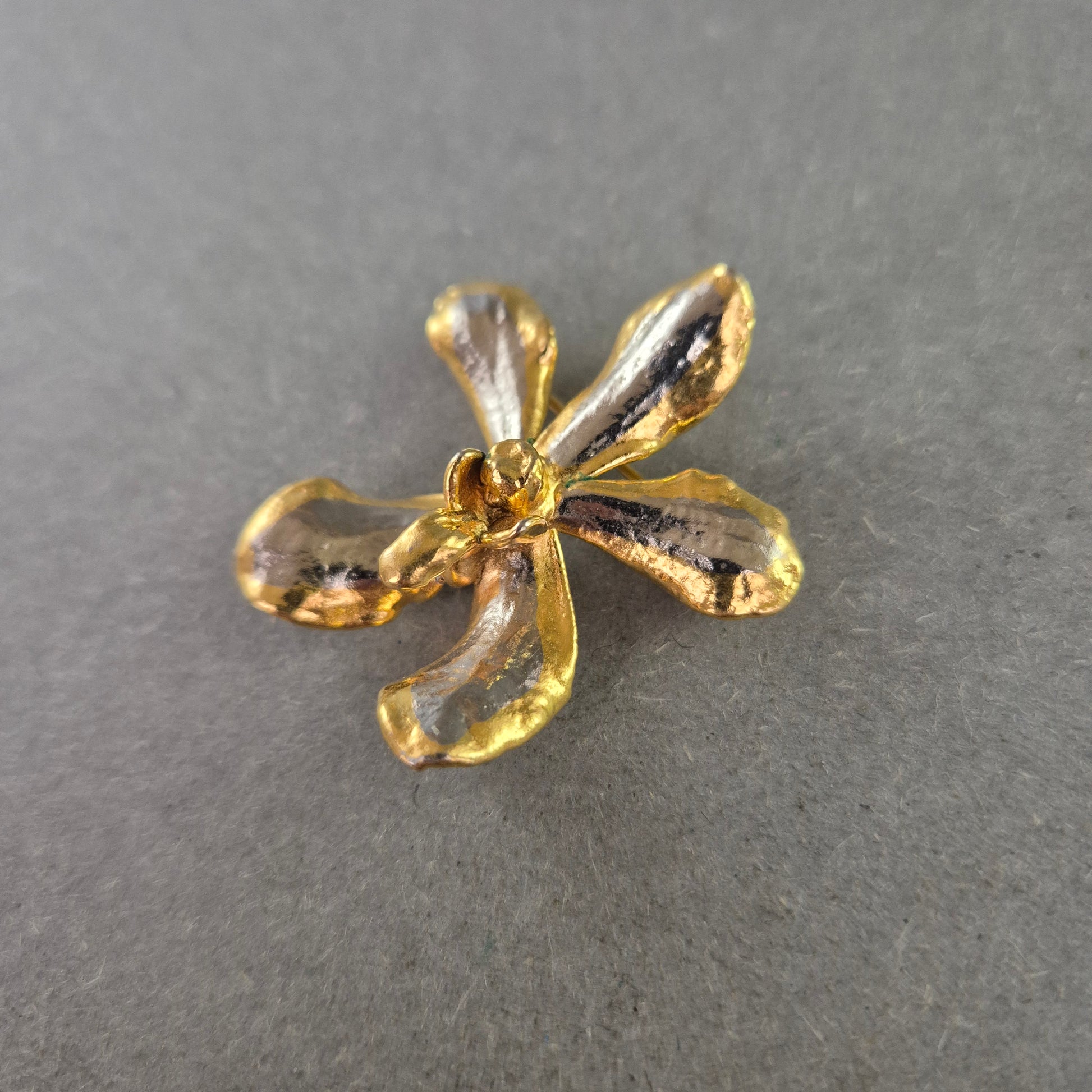 Diese auffällige Vintage-Brosche in Blütenform zeigt fünf elegant geschwungene Blätter in glänzender Goldoptik mit dunklen Akzenten. Die strukturierte Oberfläche verleiht dem Design Tiefe und Charakter. Ein stilvolles Accessoire für Retro-Looks oder als besonderer Hingucker auf Mantel oder Blazer.