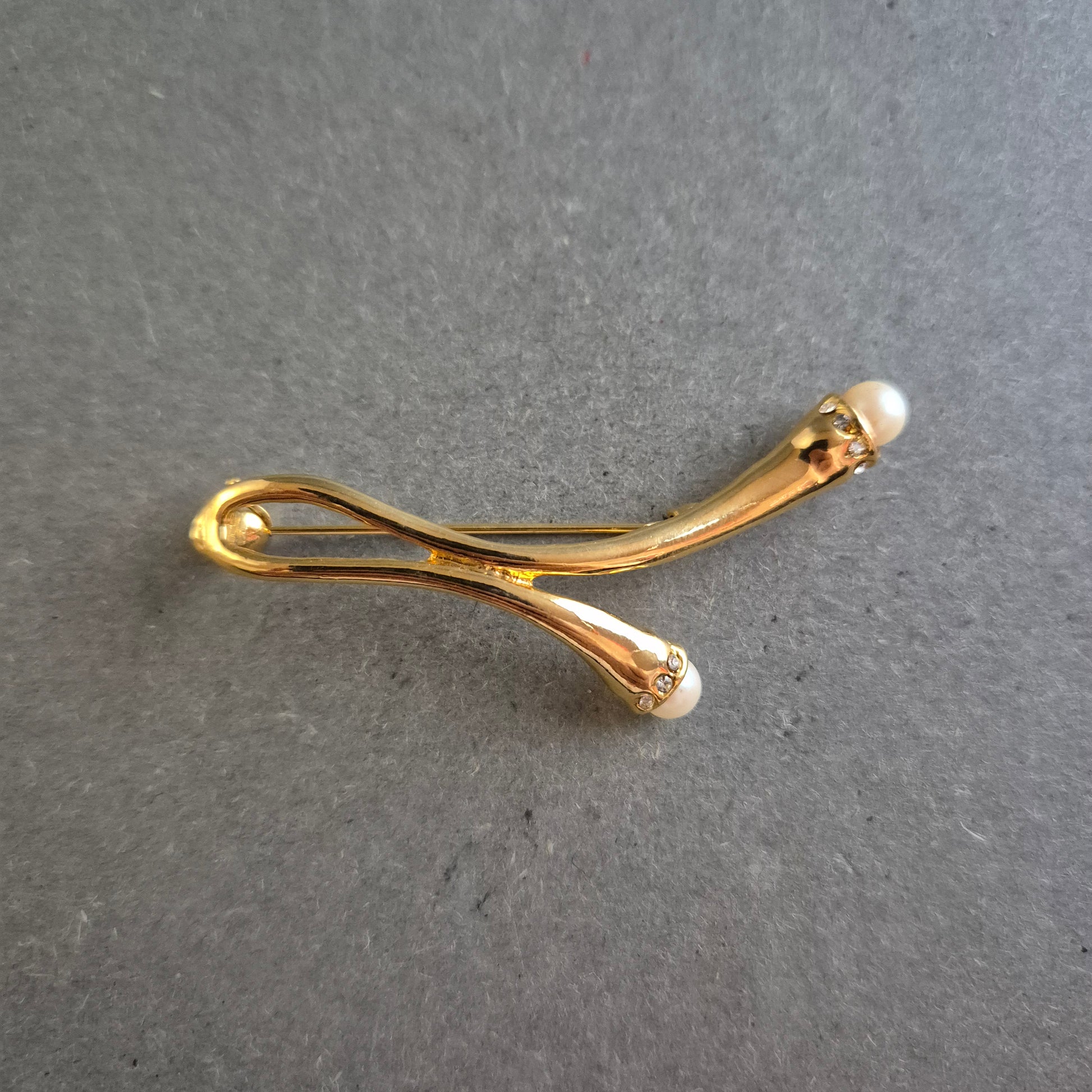 Diese elegante Vintage-Brosche in geschwungener X-Form kombiniert vergoldetes Metall mit zwei dezenten Zuchtperlen an den Enden. Das moderne, minimalistische Design verleiht dem Schmuckstück eine raffinierte Note – ideal für stilvolle Outfits im Alltag oder zu besonderen Anlässen.