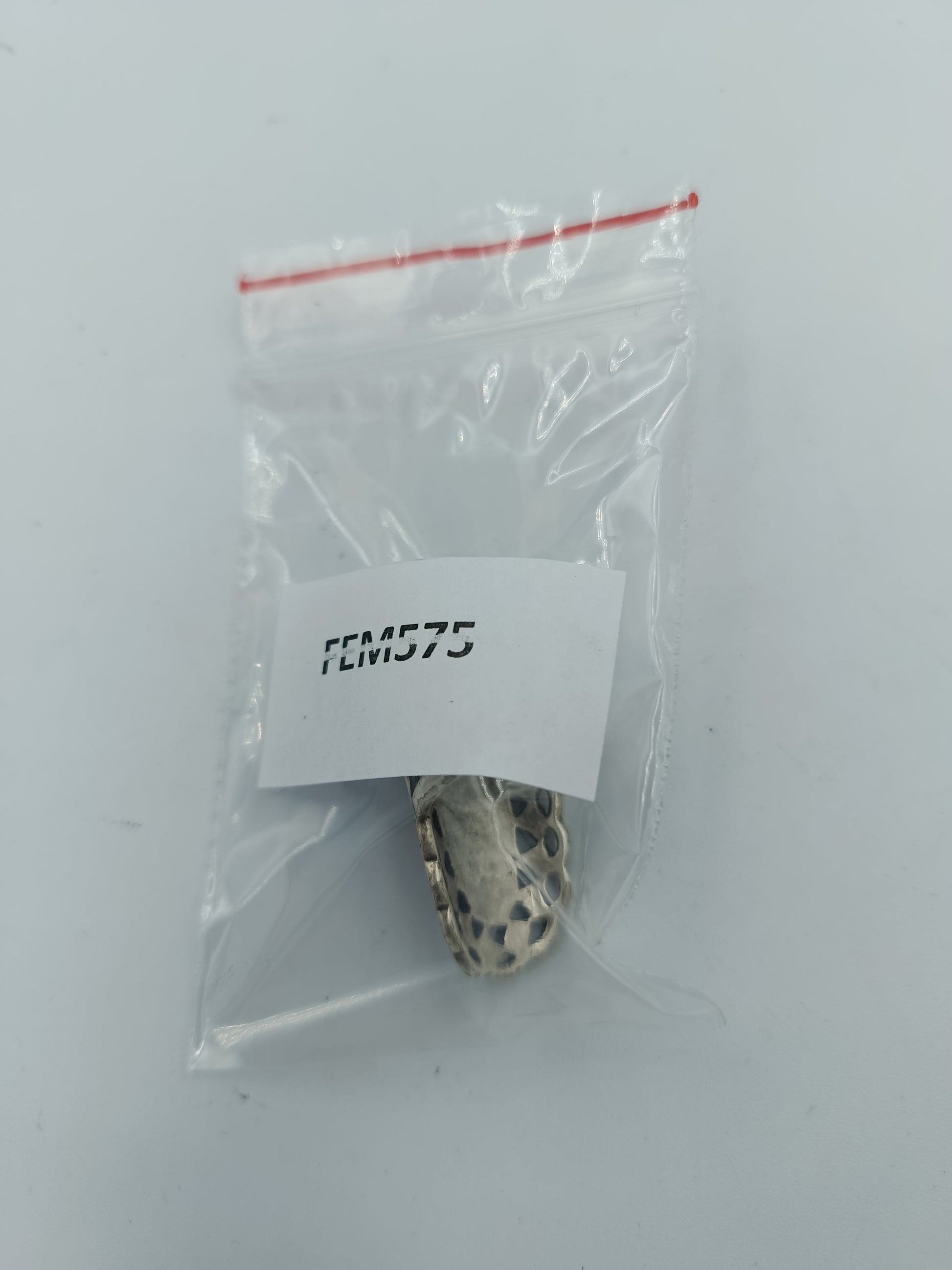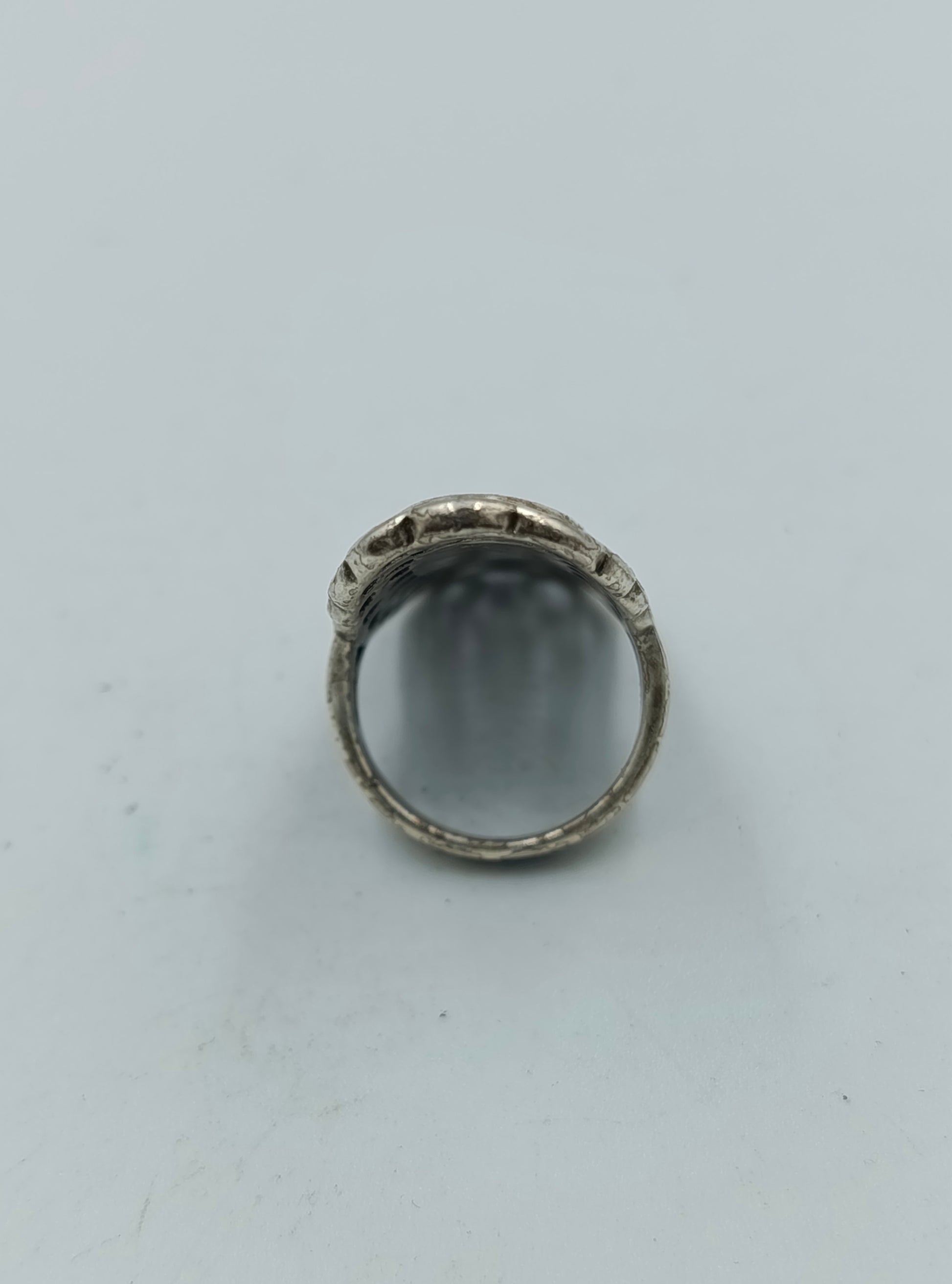Ausdrucksstarker Ring in länglicher Form, gefertigt aus versilbertem Metall. Das filigrane, durchbrochene Muster verleiht dem Stück eine elegante Note. In der Mitte sitzt ein schwarzer Schmuckstein, der den Ring zu einem auffälligen Blickfang macht.