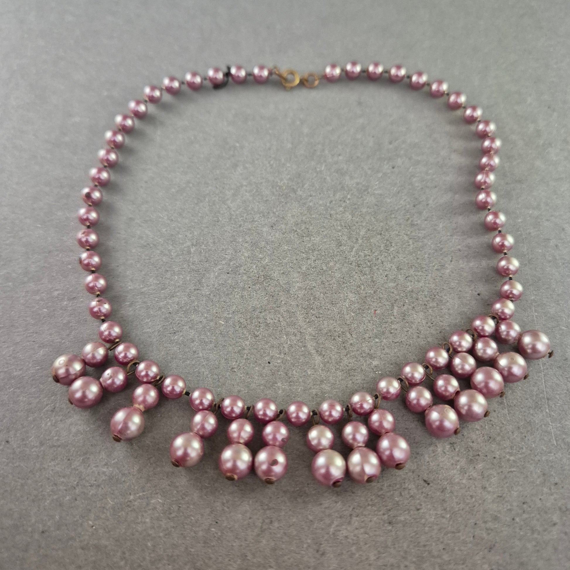 Diese auffällige Halskette im Retro-Stil ist mit glänzenden Perlen in zartem Rosa gestaltet. Die Kombination aus hängenden Elementen und gleichmäßiger Perlenreihe sorgt für ein elegantes Spiel von Bewegung und Glanz. Ideal für festliche Anlässe oder als Hingucker zu einem schlichten Outfit – ein charmantes Accessoire im Vintage-Stil.