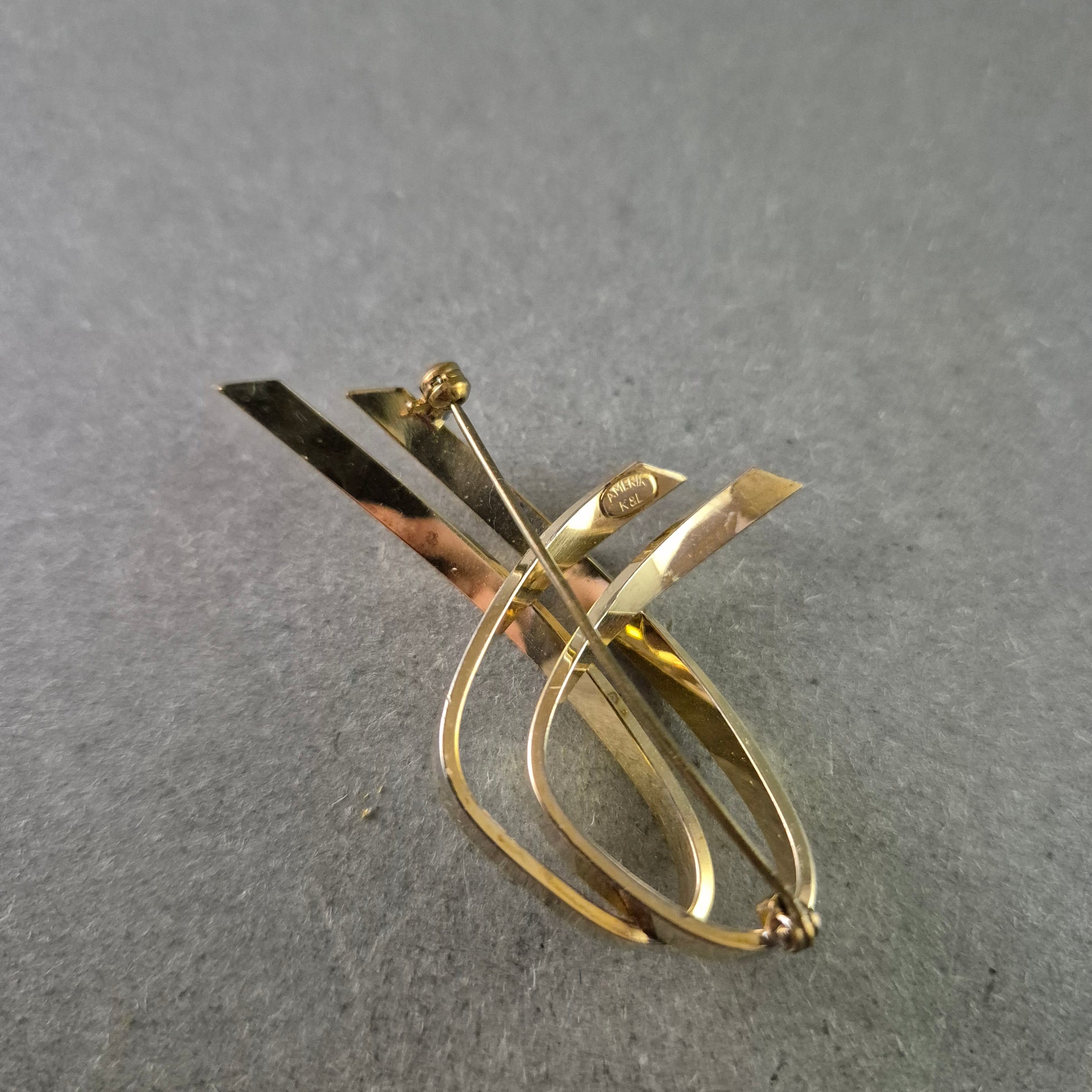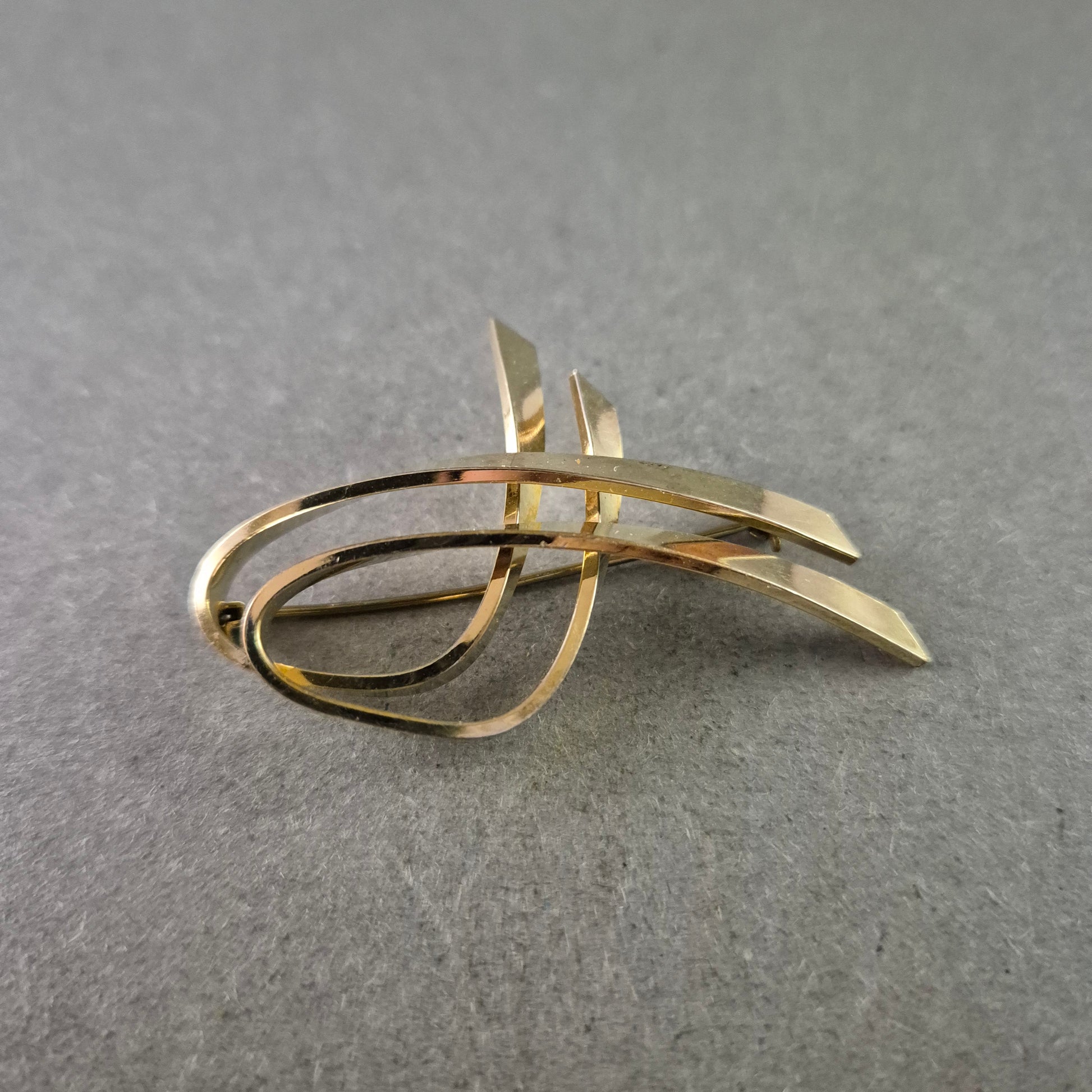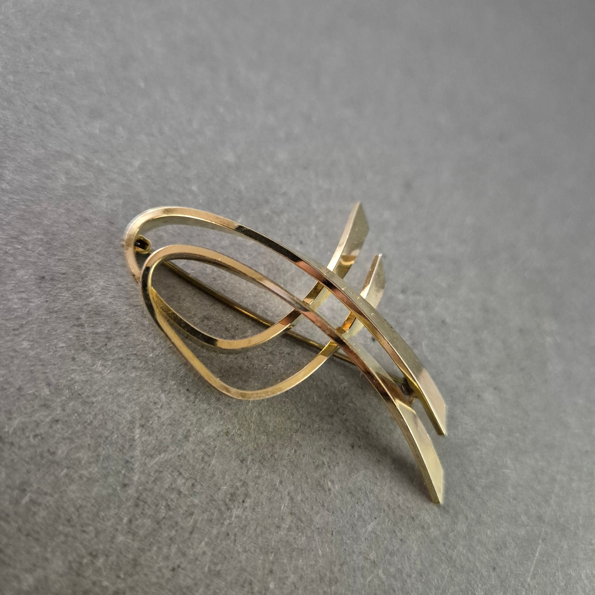 Diese stilvolle Vintage-Brosche von AMERIK K&L ist ein Paradebeispiel für zeitloses Mid-Century-Design. Die verschlungenen Metallstreifen in goldfarbener Optik erzeugen ein abstraktes, elegantes Muster, das sowohl klassisch als auch modern wirkt. Ideal als Accessoire für Blazer, Kleider oder Tücher.