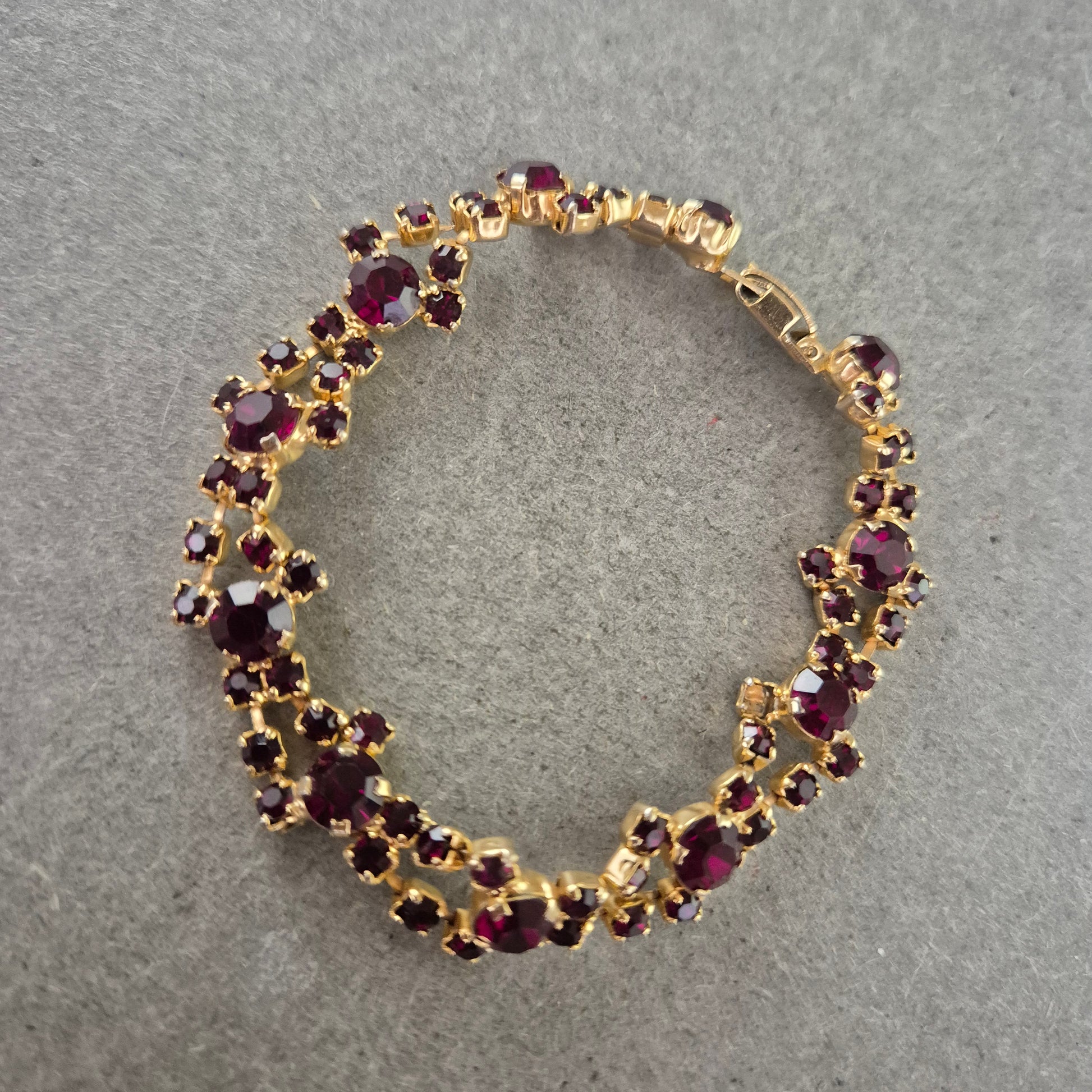 Dieses elegante Vintage Armband begeistert durch seine zahlreichen roten Schmucksteine, die in einem verspielten Blumen Design eingefasst sind. Die intensive Farbwirkung der Steine verleiht dem Armband einen luxuriösen Charakter und macht es zu einem echten Blickfang. Ideal für festliche Anlässe oder als stilvolles Accessoire im Alltag.