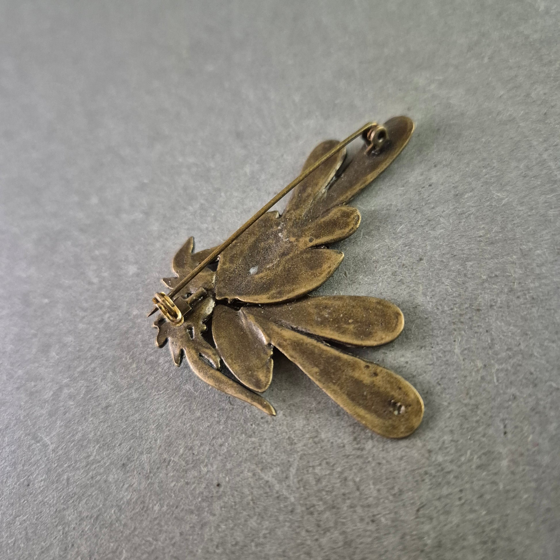 Diese elegante Brosche besticht durch ihr florales Design in antik-bronze Optik. Mehrere dekorative Blätter bilden die Basis, während kleine Zierelemente und Schmucksteine – darunter eine weiße Perle, ein roter Cabochon und ein klarer Stein – für besondere Akzente sorgen. Ein charmantes Schmuckstück, das perfekt zu Blazern, Kleidern oder Schals passt und Vintage-Flair verleiht.