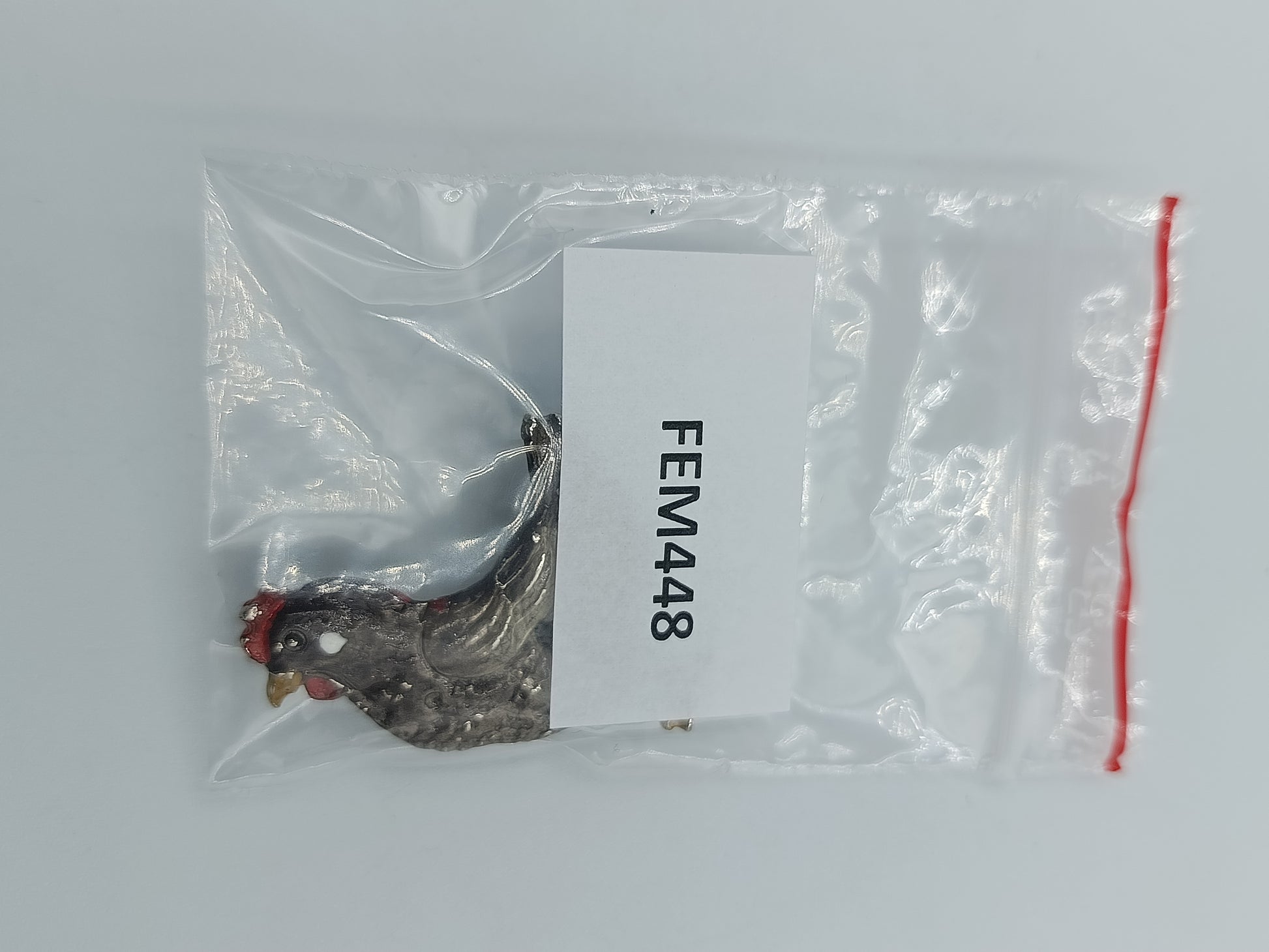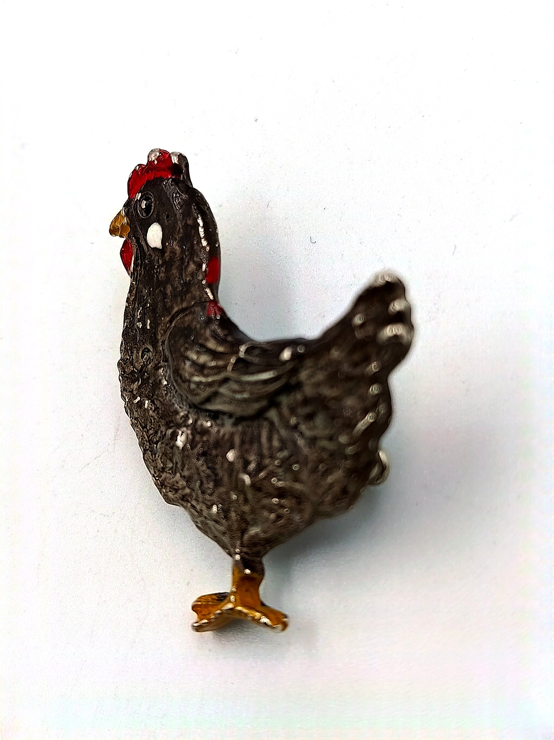 Detailreich gearbeitete Brosche in Form eines Huhns. Das Stück ist farbig emailliert – mit schwarzem Gefieder, rotem Kamm und goldfarbenem Schnabel sowie Bein. Die Rückseite trägt eine stabile Nadel mit Verschluss und eine Signaturprägung. Ein originelles Accessoire und hübsches Sammlerstück für Liebhaber von Tiermotiven.
