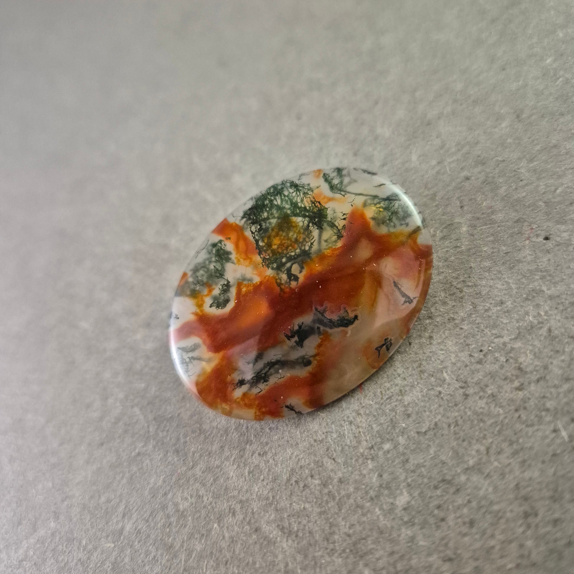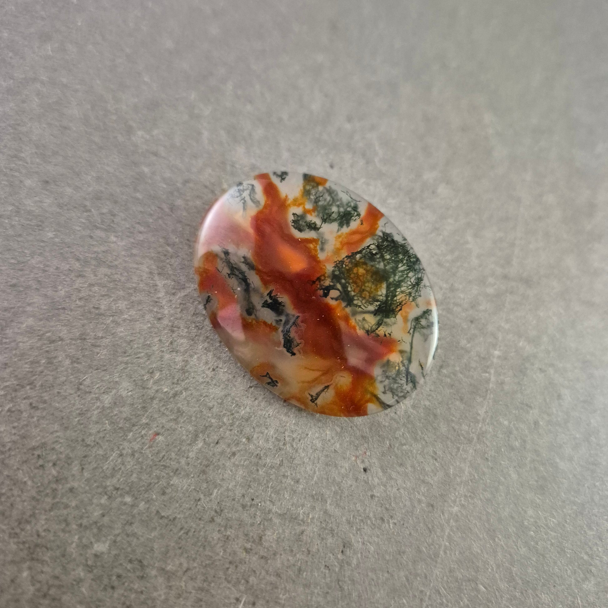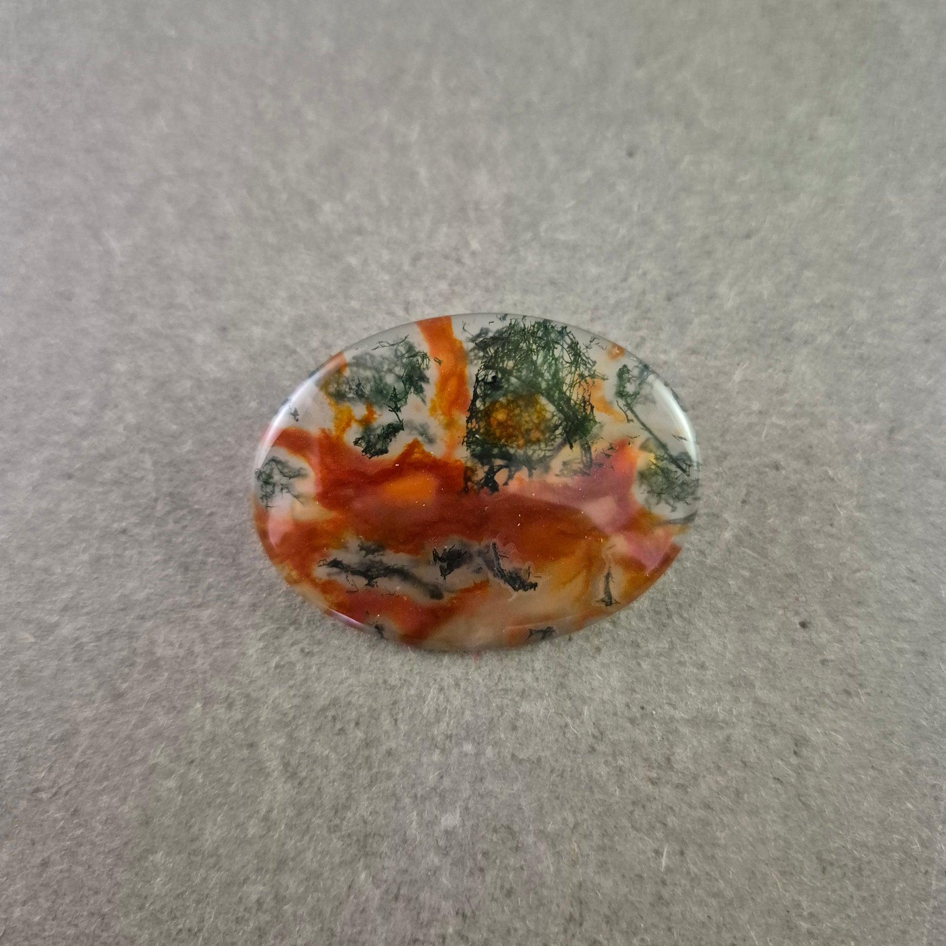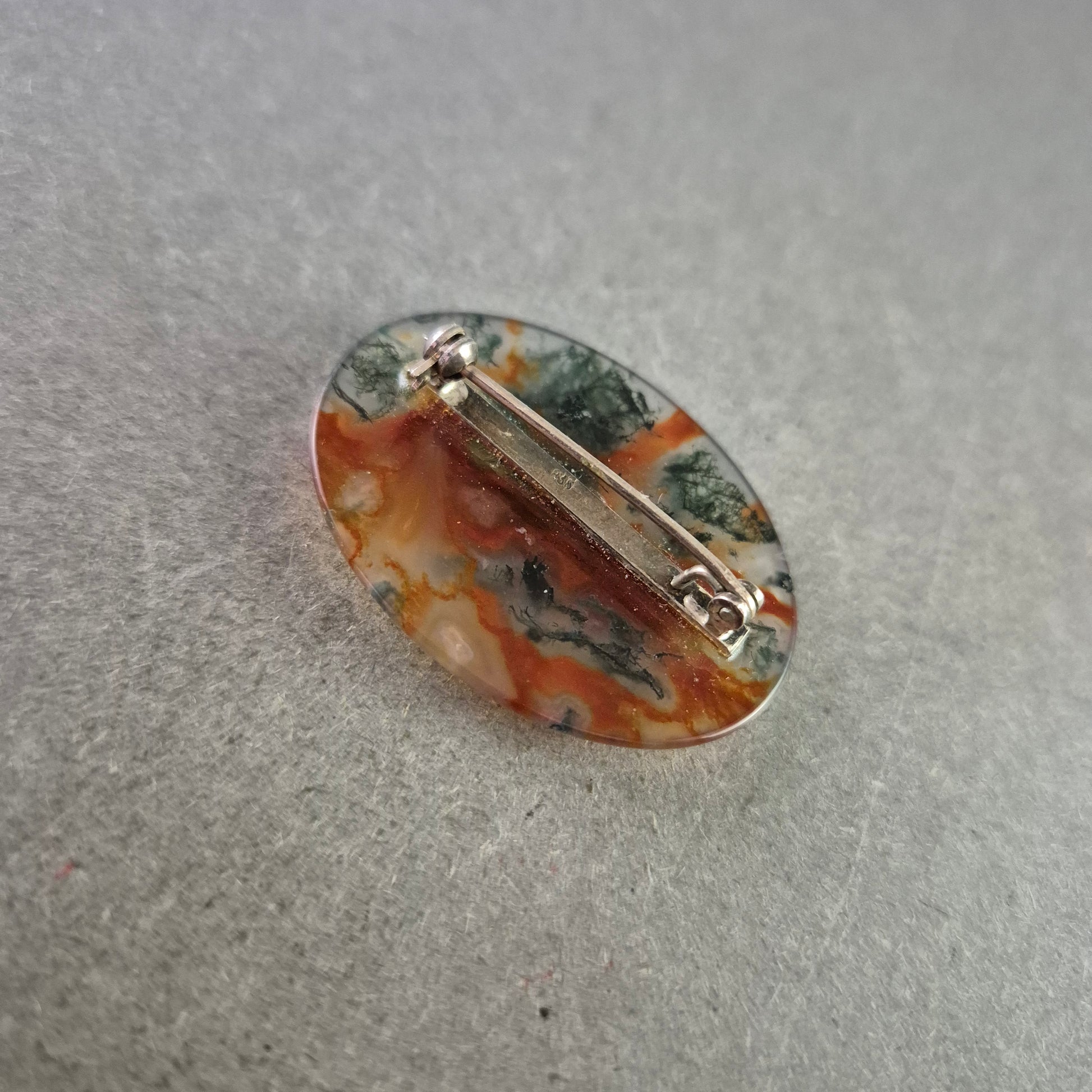 Diese Vintage-Brosche beeindruckt durch ihren ovalen Landschaftsachat, der durch seine faszinierenden Farbstrukturen in Orange-, Grün- und Grautönen an ein natürliches Gemälde erinnert. Jeder Stein ist ein Unikat und bringt die Schönheit der Natur in ein tragbares Schmuckstück.