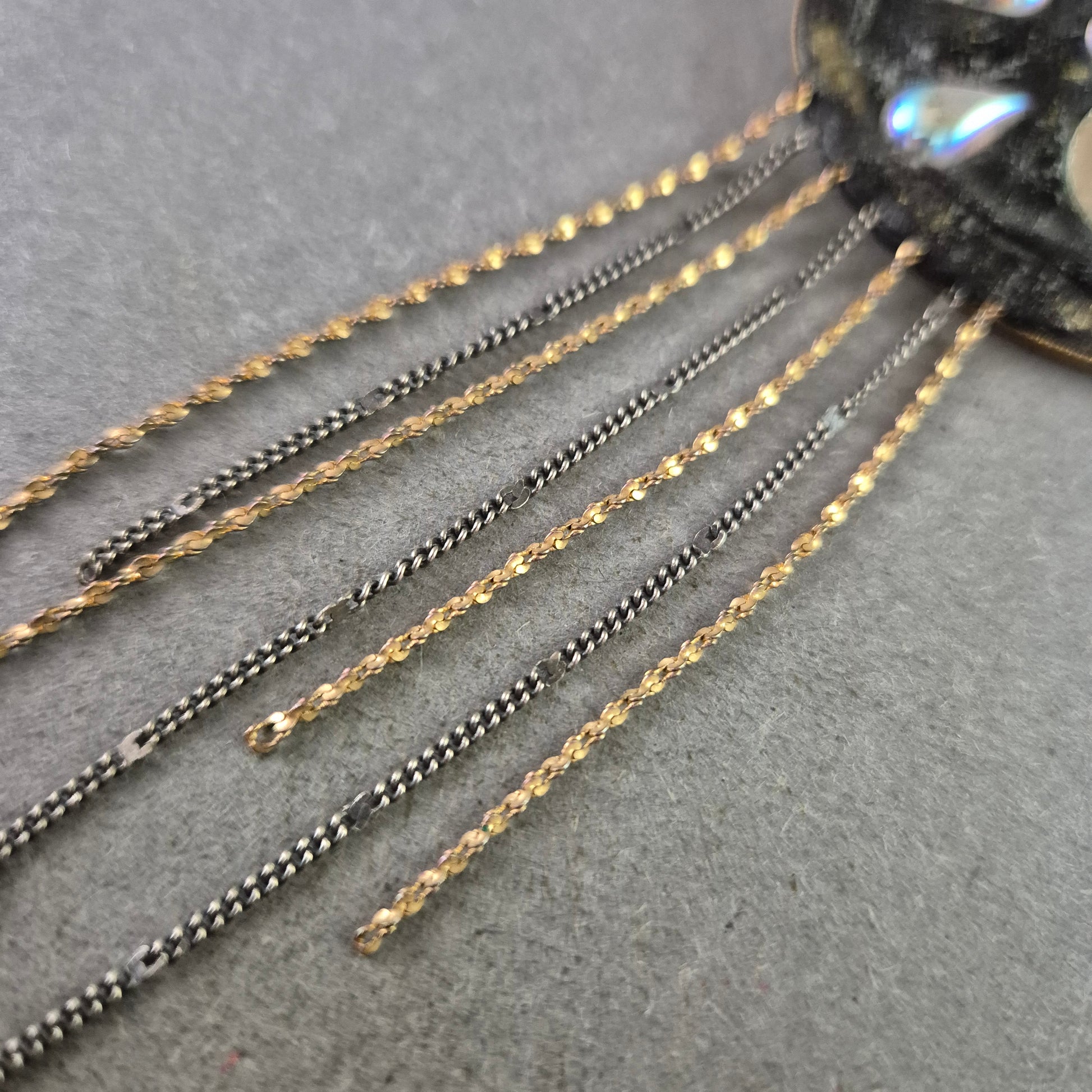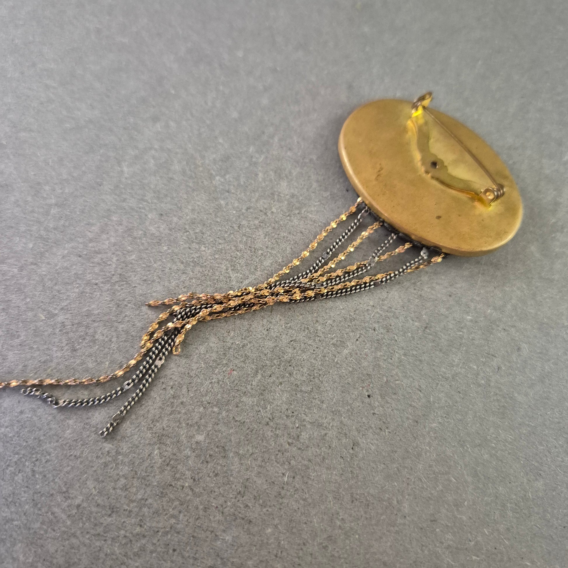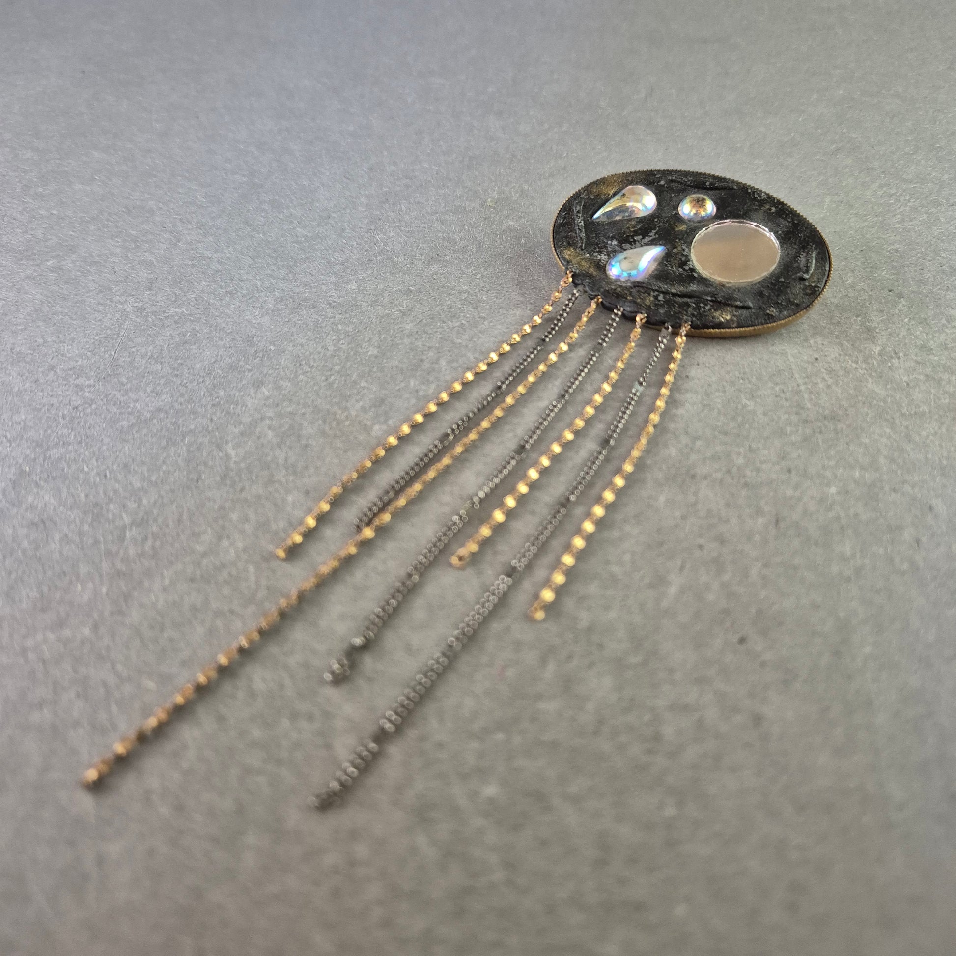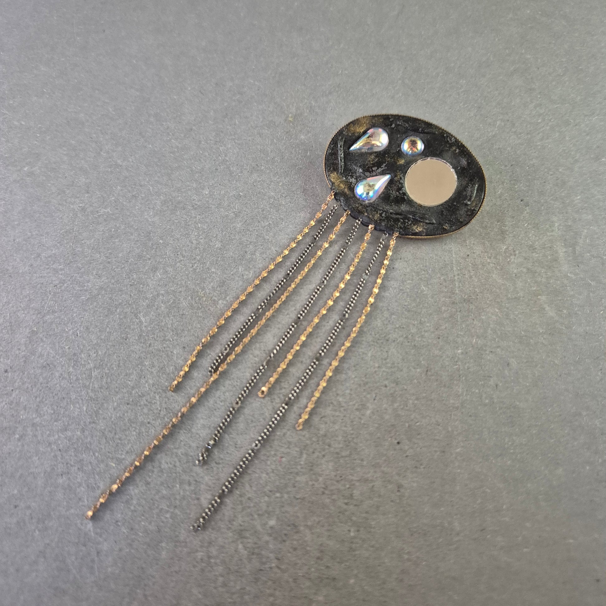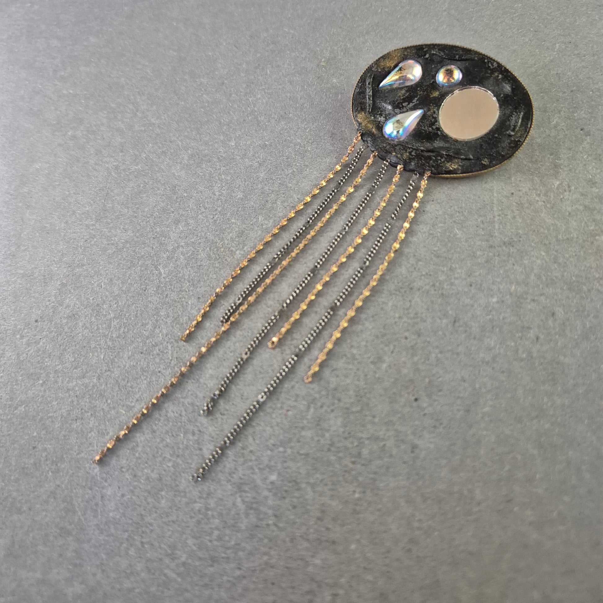 Diese auffällige Vintage-Brosche verbindet Eleganz mit Extravaganz. Auf einer goldfarbenen, ovalen Basis sind funkelnde Strasssteine in verschiedenen Formen eingefasst, während feine gold- und silberfarbene Ketten dekorativ nach unten fallen.