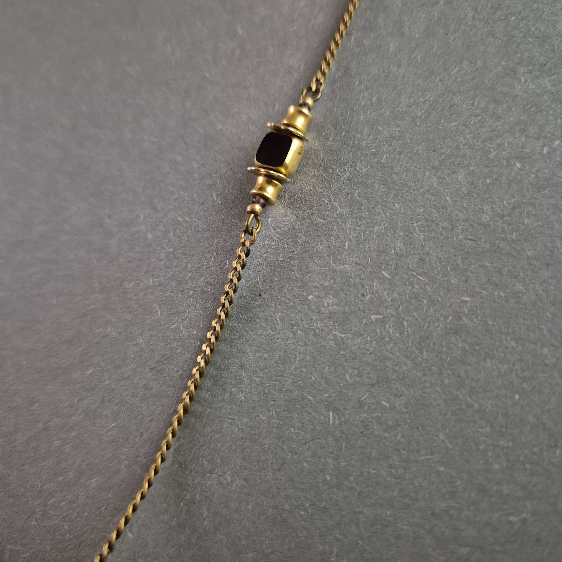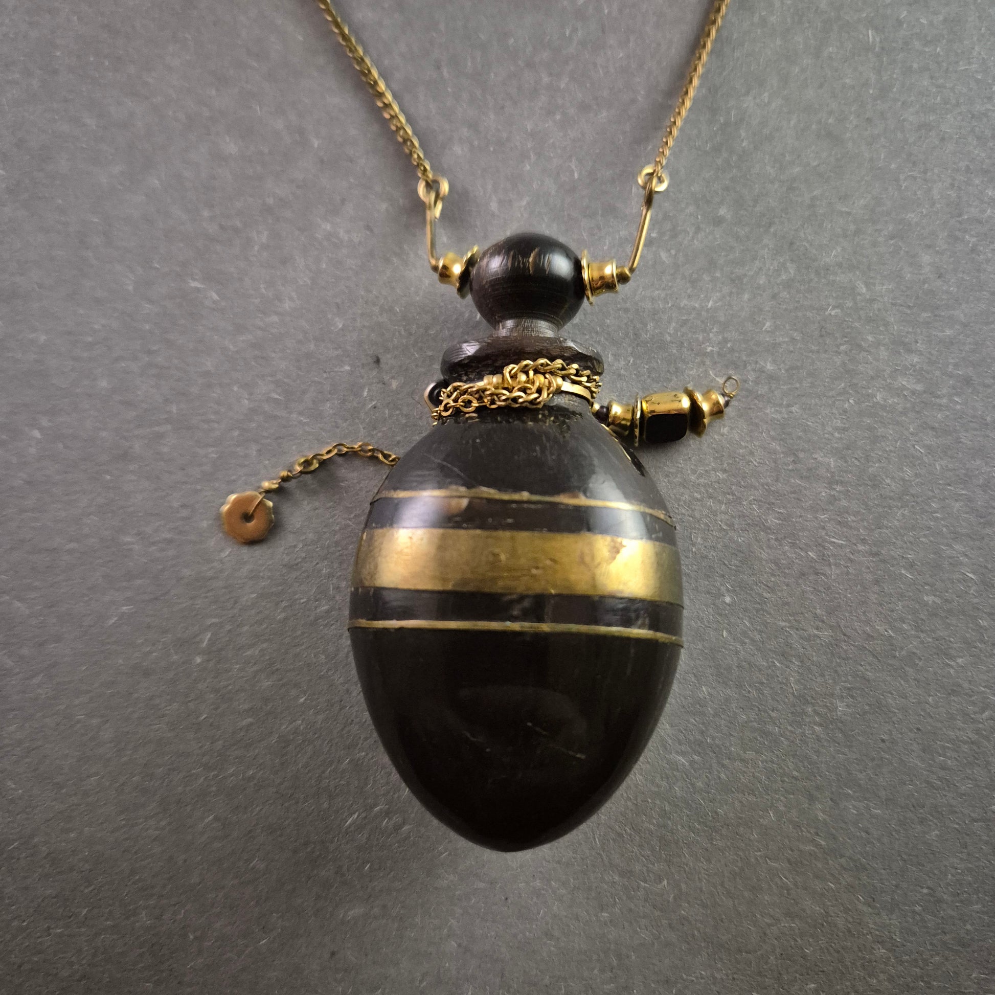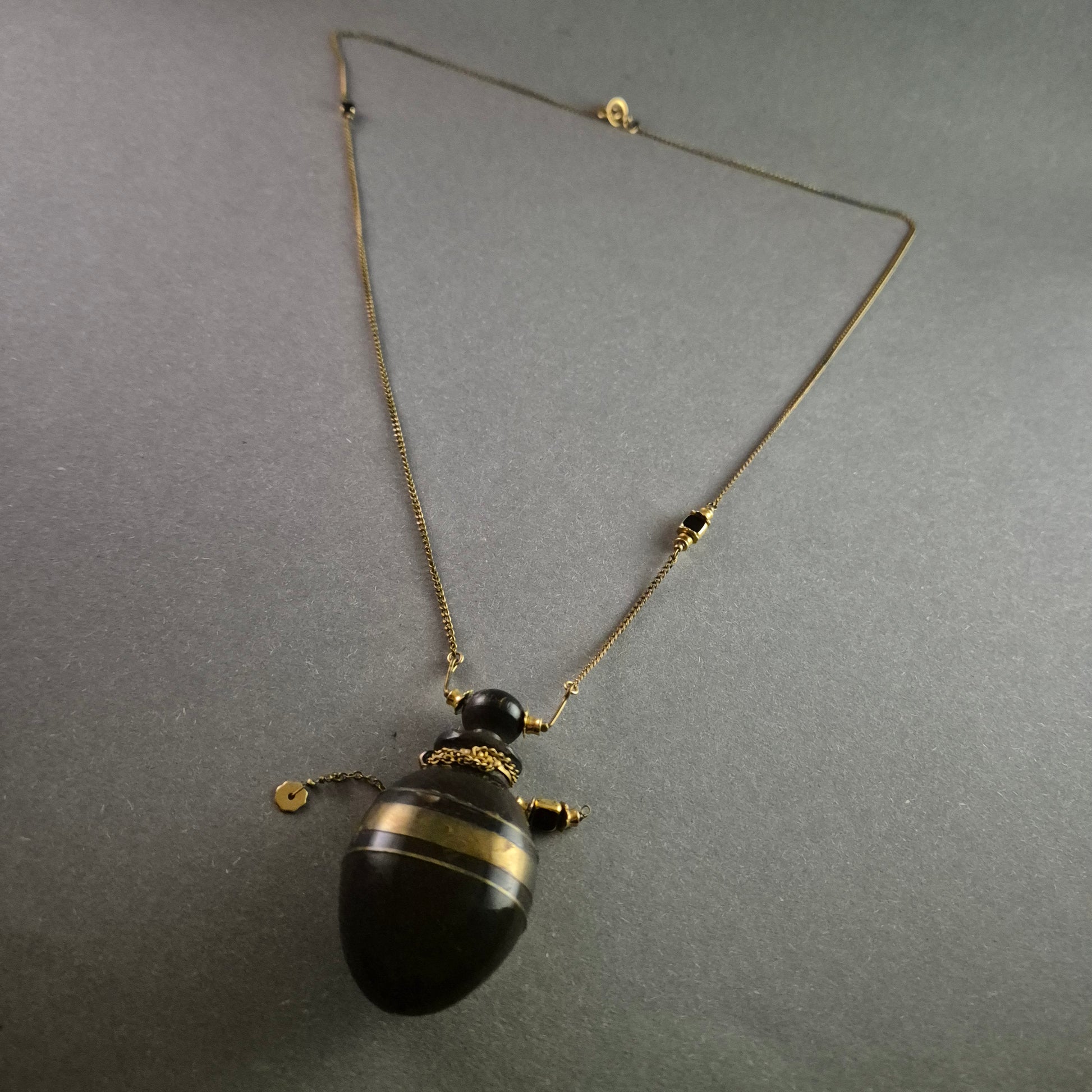 Diese außergewöhnliche Vintage-Halskette besticht durch ihren einzigartigen Flakon-Anhänger aus dunklem Holz mit goldfarbenen Zierelementen. Das kunstvolle Design erinnert an antiken Schmuck aus orientalischen Kulturen. Die filigrane Kette mit kleinen Perlenapplikationen ergänzt das edle Gesamtbild. Ein faszinierendes Schmuckstück für Liebhaber von Vintage- und Ethno-Stil.