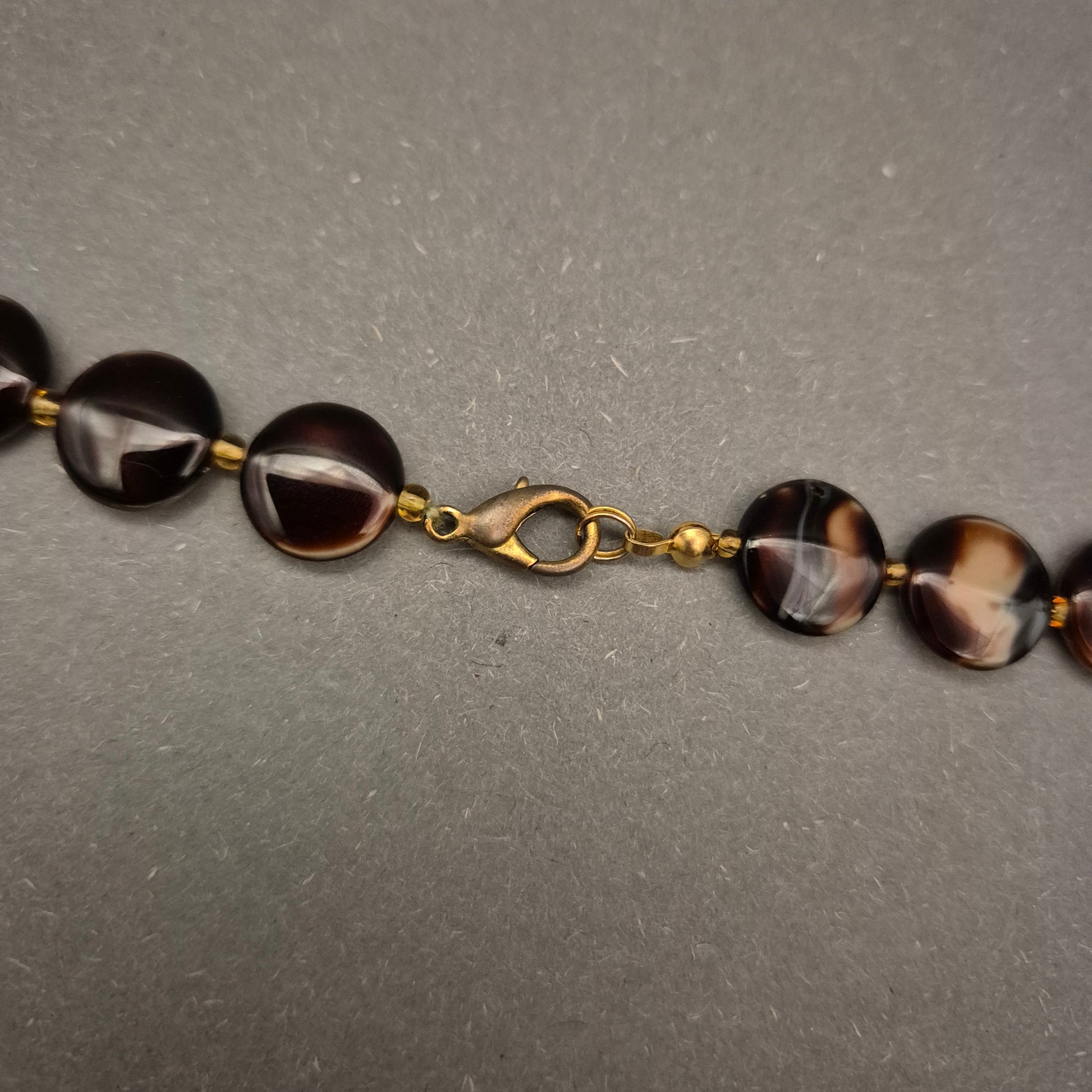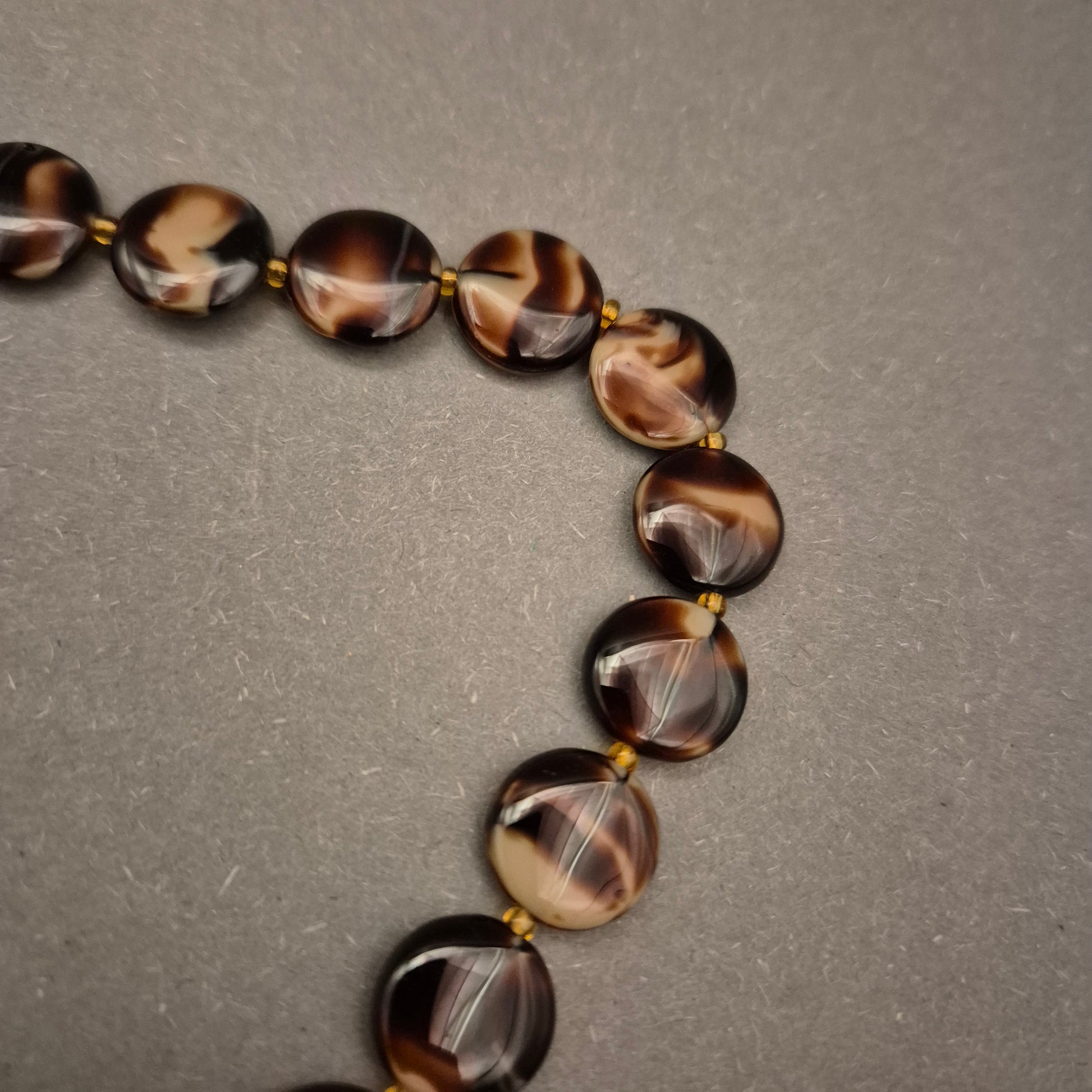 Diese auffällige Vintage-Halskette besticht durch ihre flachen, runden Perlen, die ein faszinierendes braun-beiges Marmormuster aufweisen – eine elegante Imitation der klassischen Schildpatt- oder Hornoptik. Die warmen Erdtöne und das schimmernde Material machen die Kette zu einem starken Blickfang. Jede Perle ist durch kleine Knoten oder Abstandshalter voneinander getrennt, was dem Schmuckstück eine geschmeidige Haptik verleiht. Mit ihrer kurzen Länge ist sie ideal als Choker oder eleganter Halsschmuck über einem Rollkragenpullover oder einer Bluse. Details: