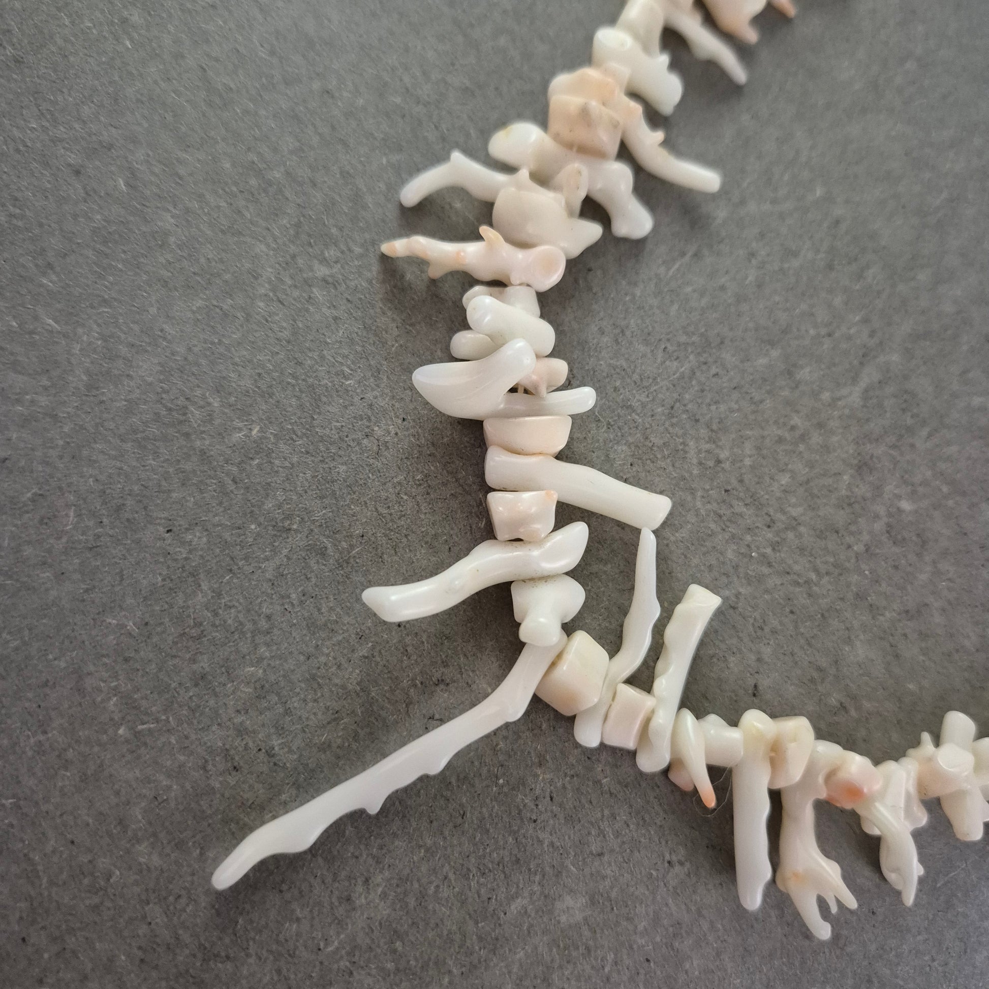 Diese auffällige Halskette besteht aus naturbelassenen weißen Korallenstücken, die der Kette einen rustikalen und maritimen Charakter verleihen. Die individuelle Form jedes Korallenfragments macht jedes Stück einzigartig. Der klassische Schraubverschluss aus Metall sorgt für sicheren Halt und rundet das Design im Retro-Stil ab.