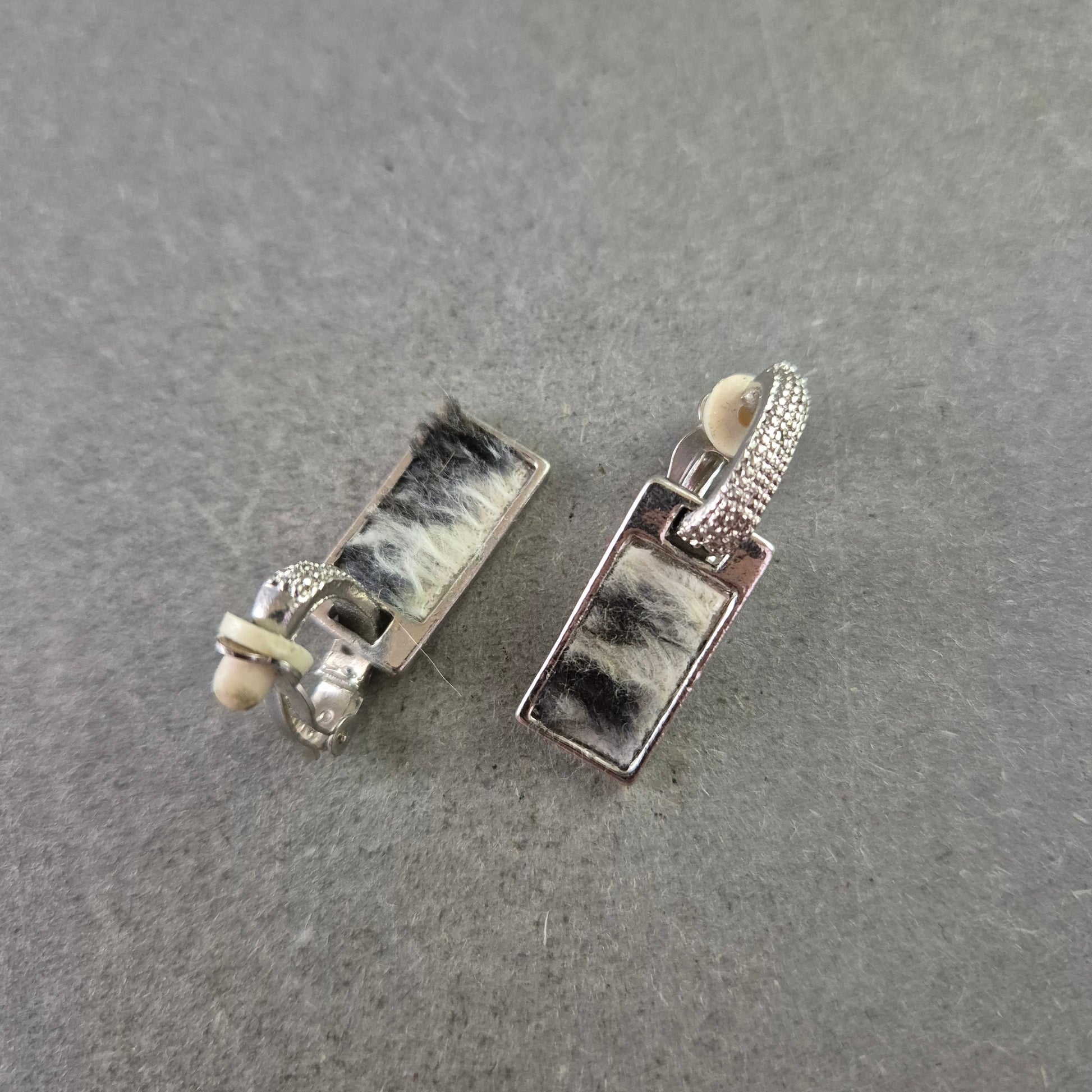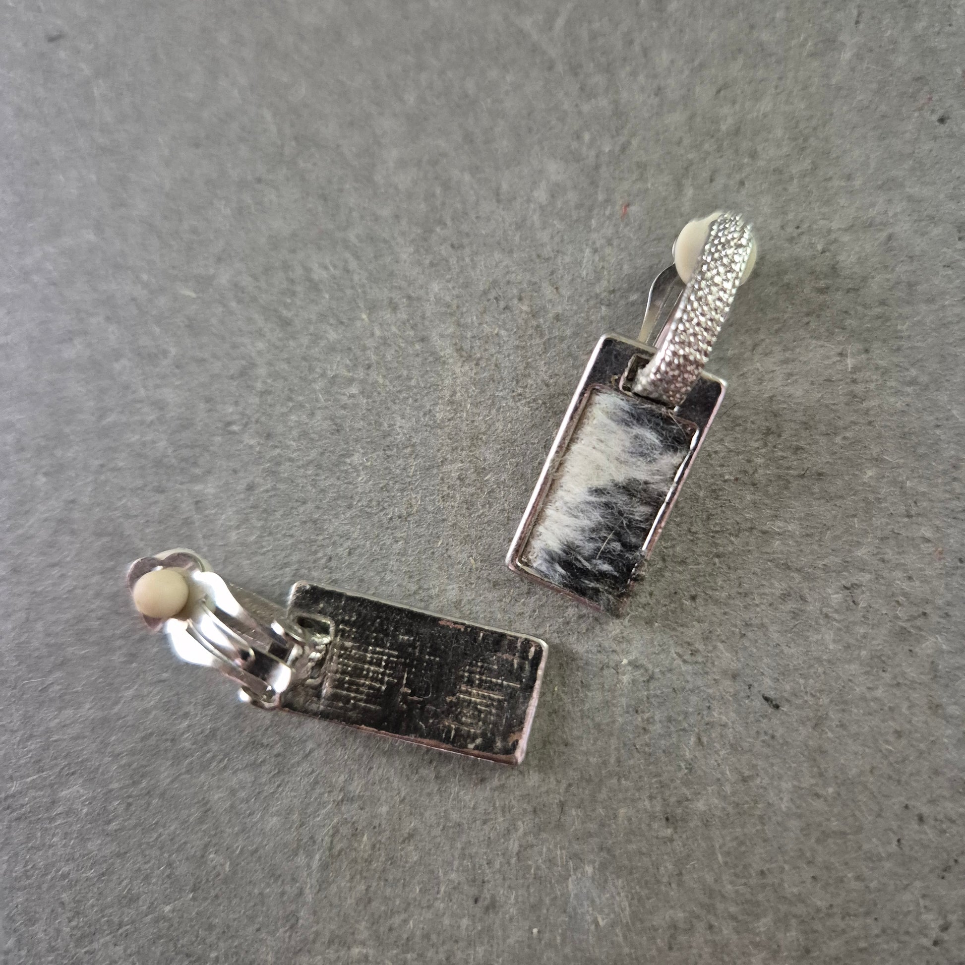 Diese besonderen Vintage Ohrclips vereinen Metall in Silberoptik mit einem auffälligen Fell-Einsatz in Schwarz-Weiß-Musterung. Das rechteckige Design verleiht den Clips eine klare, elegante Form, während das Fell-Detail ihnen einen außergewöhnlichen und extravaganten Look gibt.