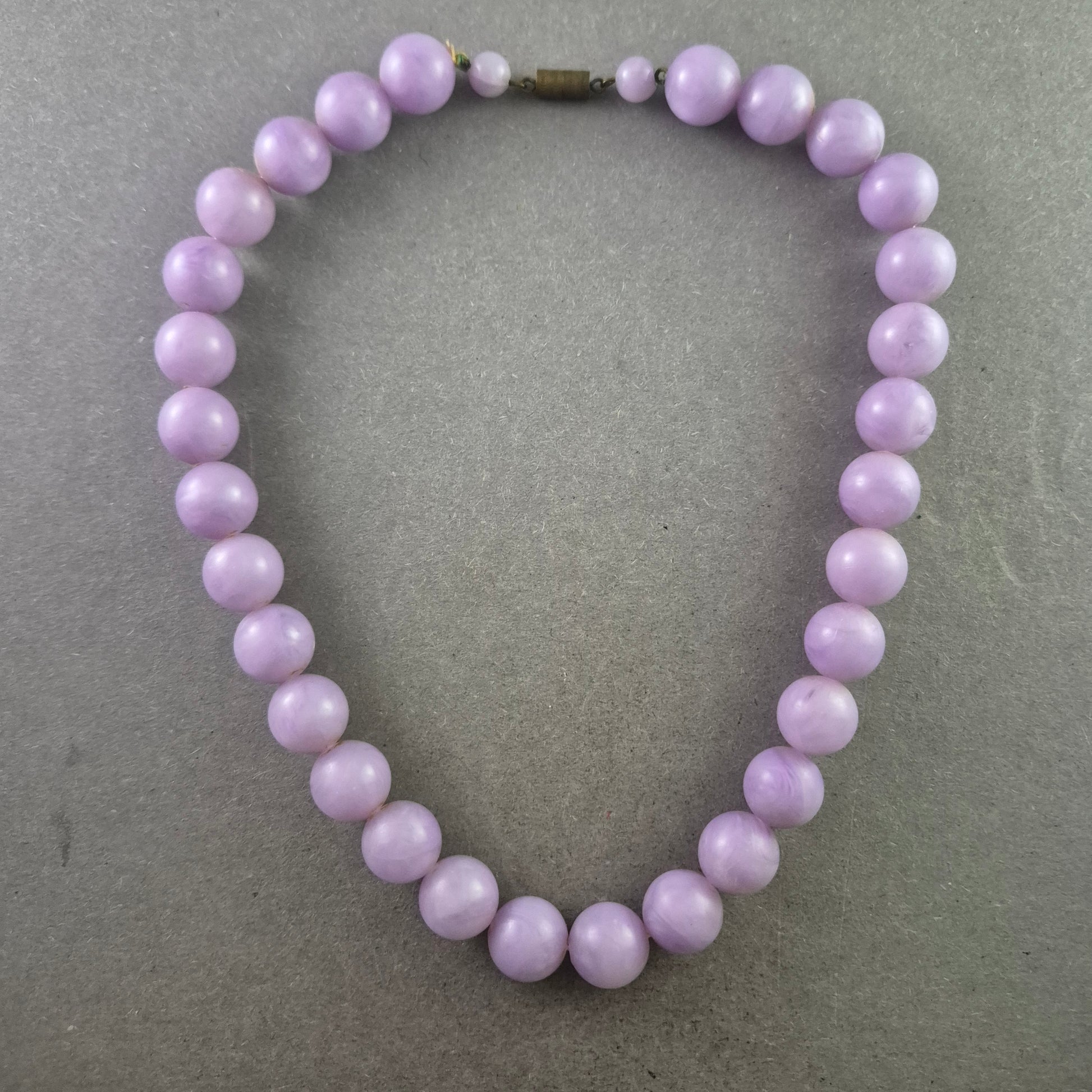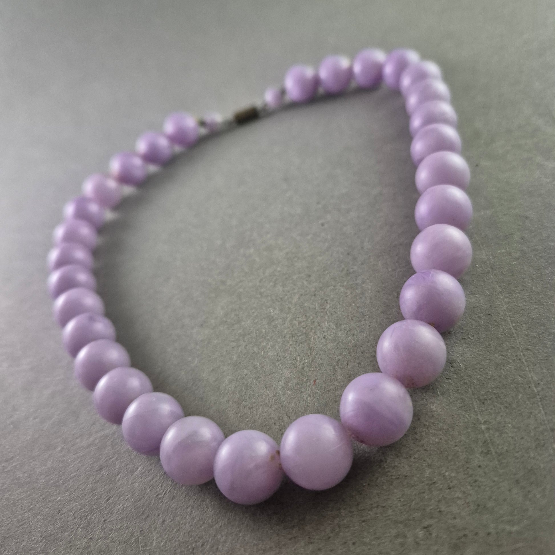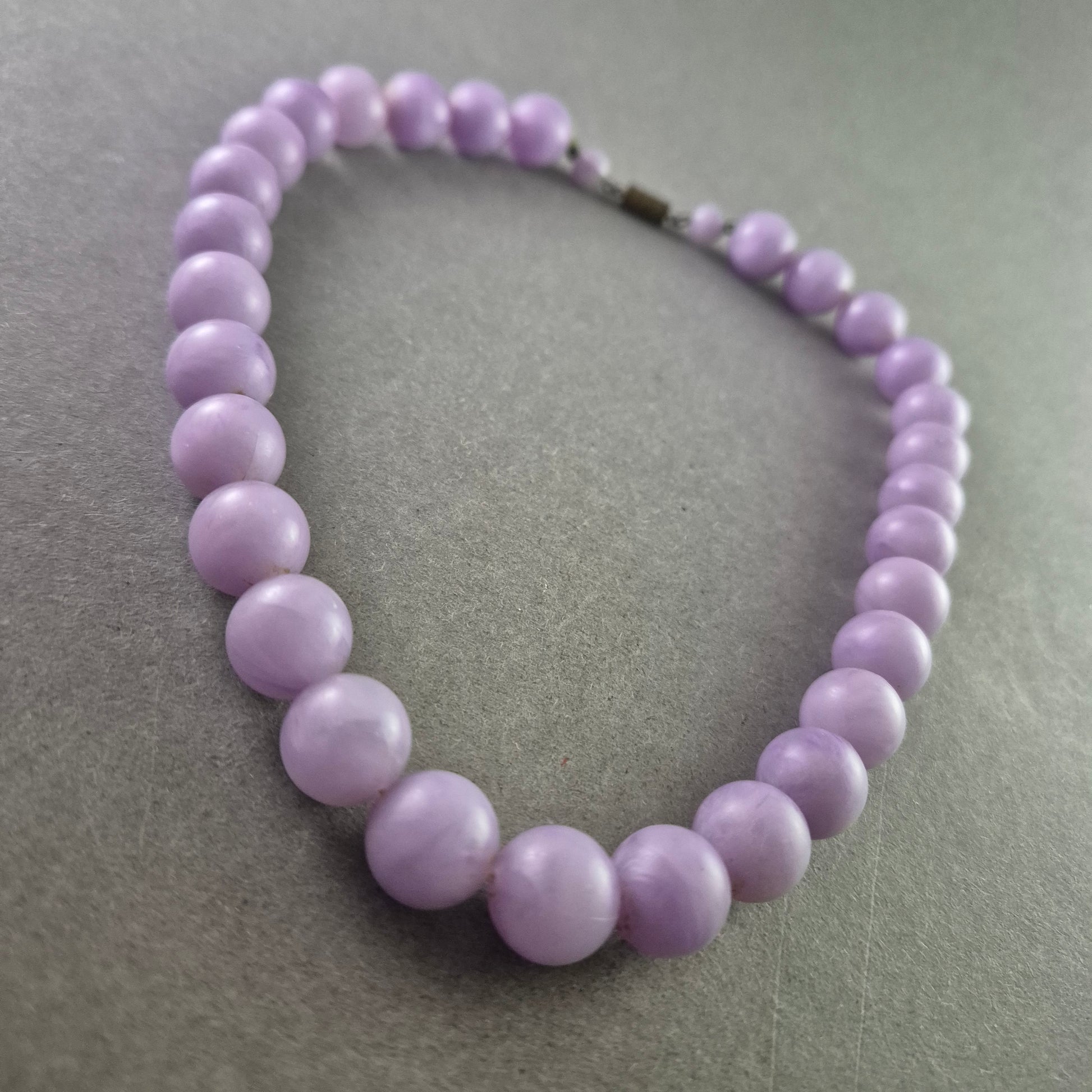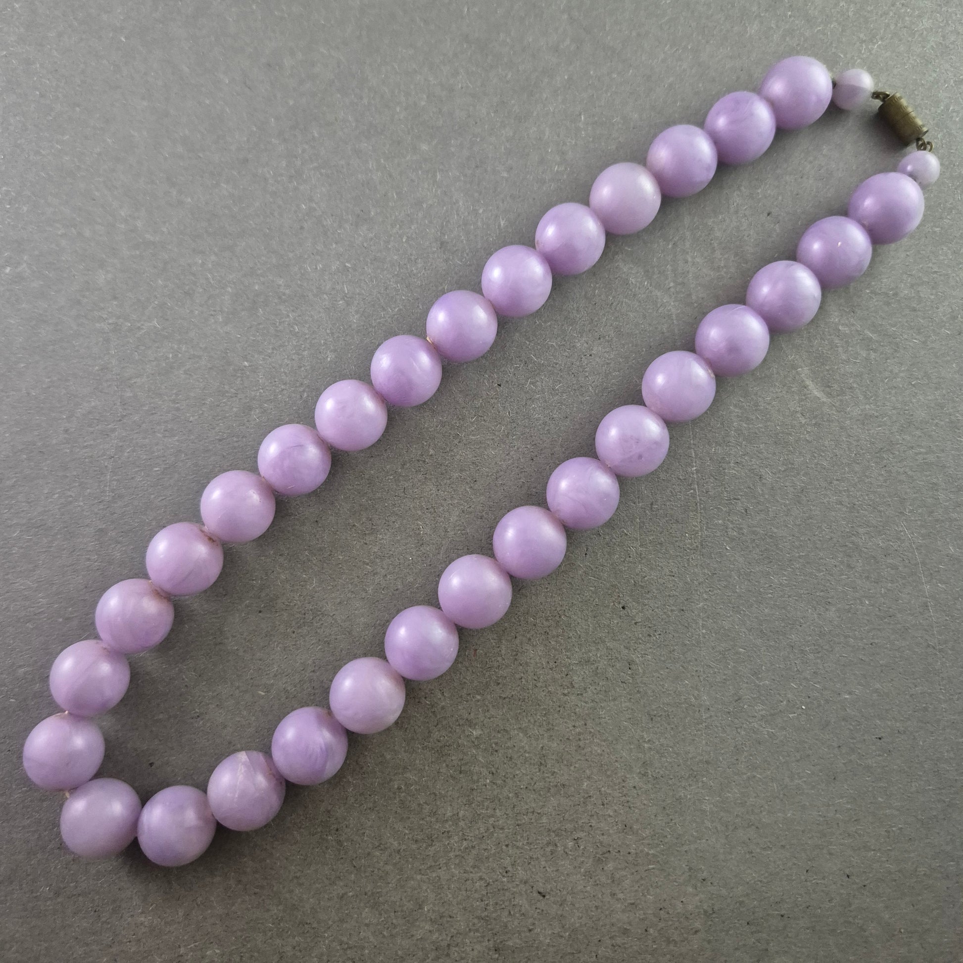 Diese charmante Vintage-Kette in sanftem Fliederton besticht durch ihre gleichmäßig runden Perlen, die einen dezenten Glanz aufweisen. Der klassische Schraubverschluss in Messingoptik rundet das nostalgische Gesamtbild ab und sorgt für sicheren Halt. Ideal für Liebhaberinnen von pastelligen Farbtönen und zeitloser Eleganz.
