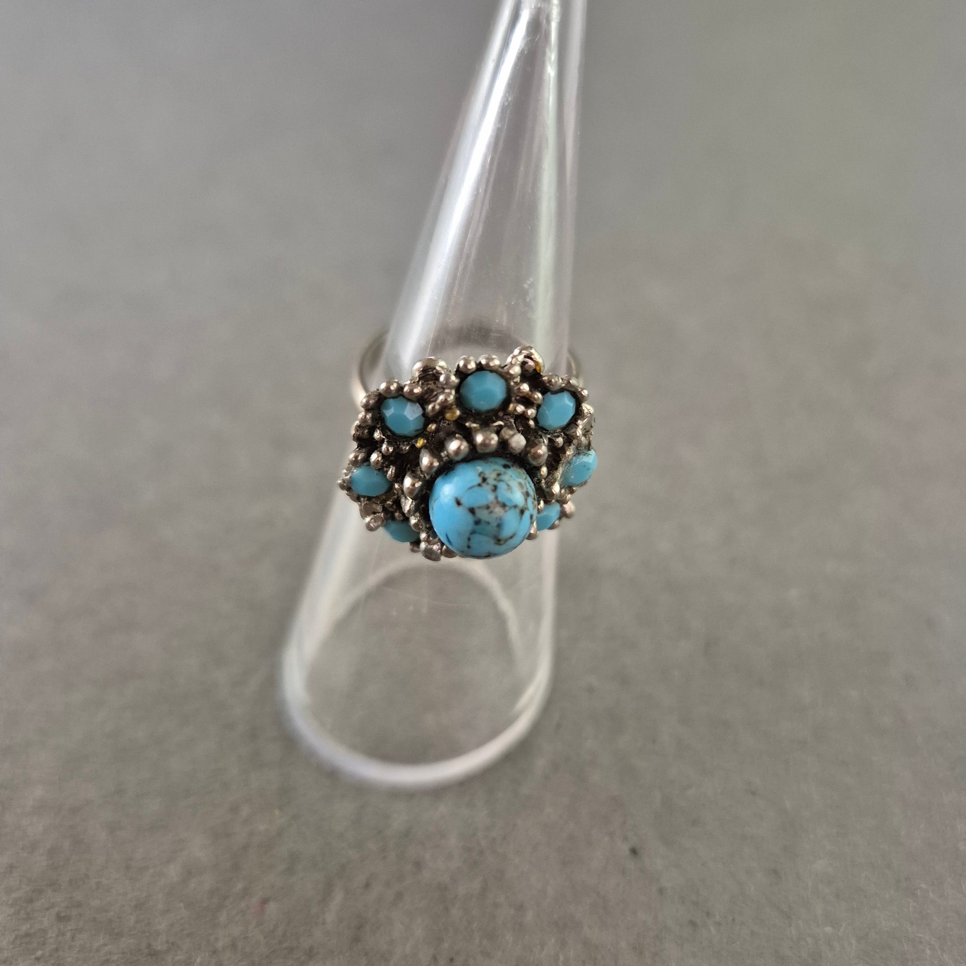 Dieser elegante Vintage Ring besticht durch sein kunstvolles Design mit einem zentralen türkisfarbenen Cabochon, der von mehreren kleineren Steinen umrahmt ist. Der Ring ist aus silberfarbenem Metall gefertigt und wirkt durch die Kombination aus filigranen Details und kräftigem Türkis besonders auffällig. Ein schönes Schmuckstück für Liebhaber von Ethno- und Boho-Stilen.