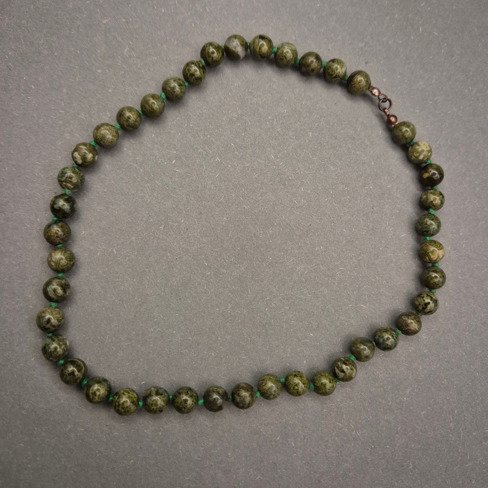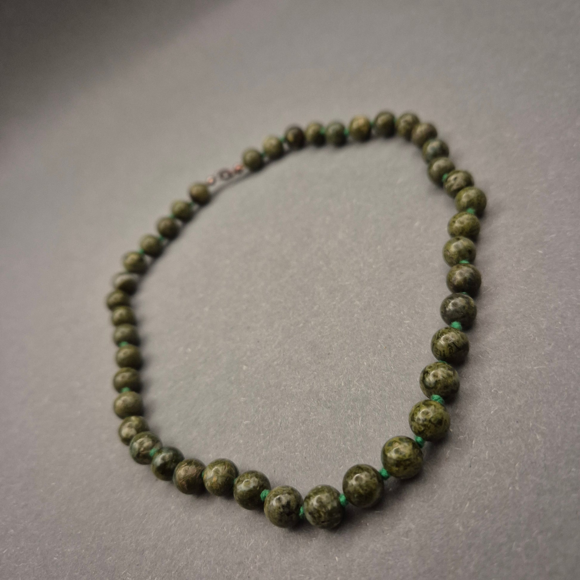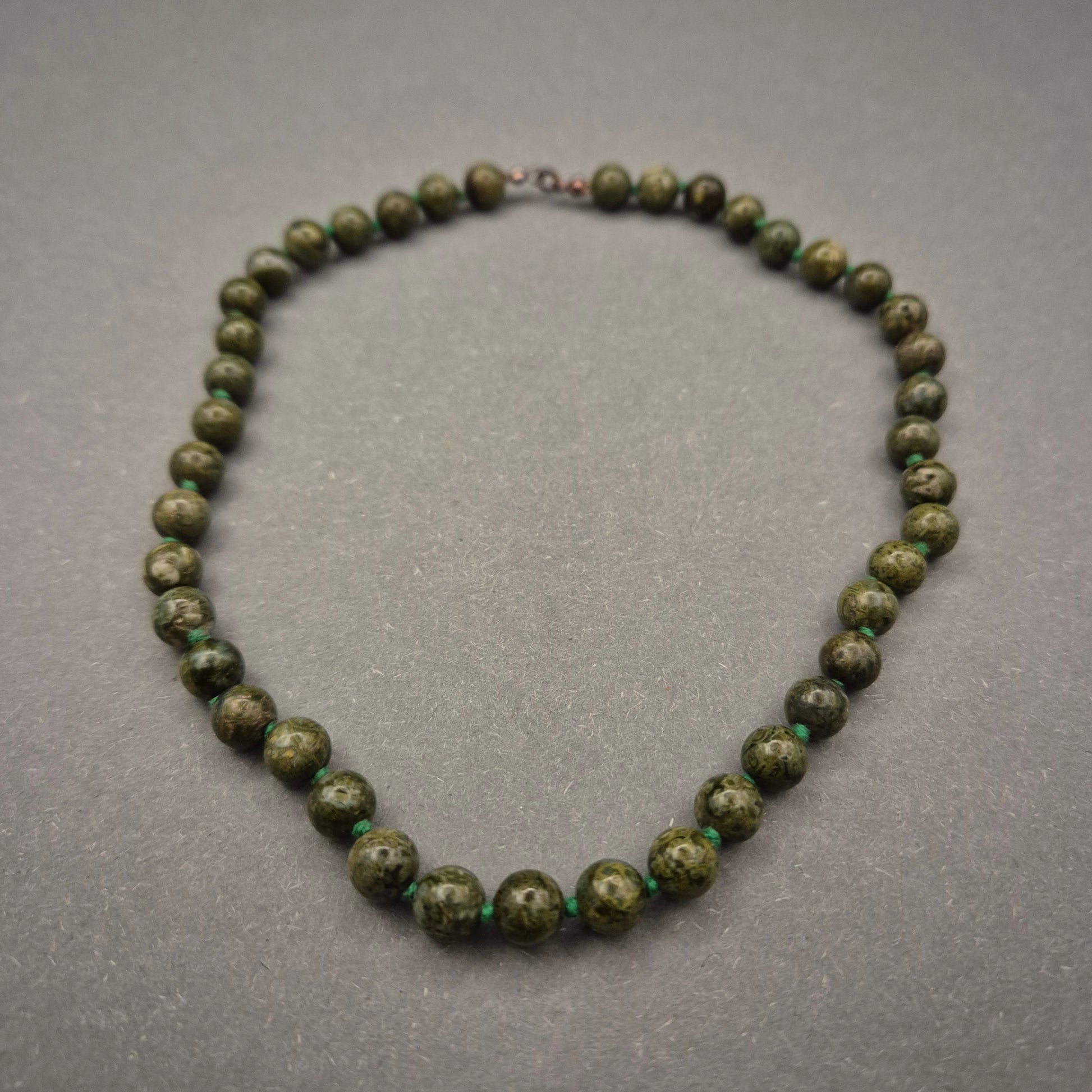 Diese klassische Halskette besteht aus rund geschliffenen, grünen Naturstein-Perlen, die auf farblich passenden Garnen aufgefädelt sind. Die dezenten Farbnuancen und die natürliche Maserung jeder Perle verleihen dem Schmuckstück eine organische, edle Ausstrahlung. Ein dezenter Metallverschluss rundet das Design ab und sorgt für sicheren Halt.