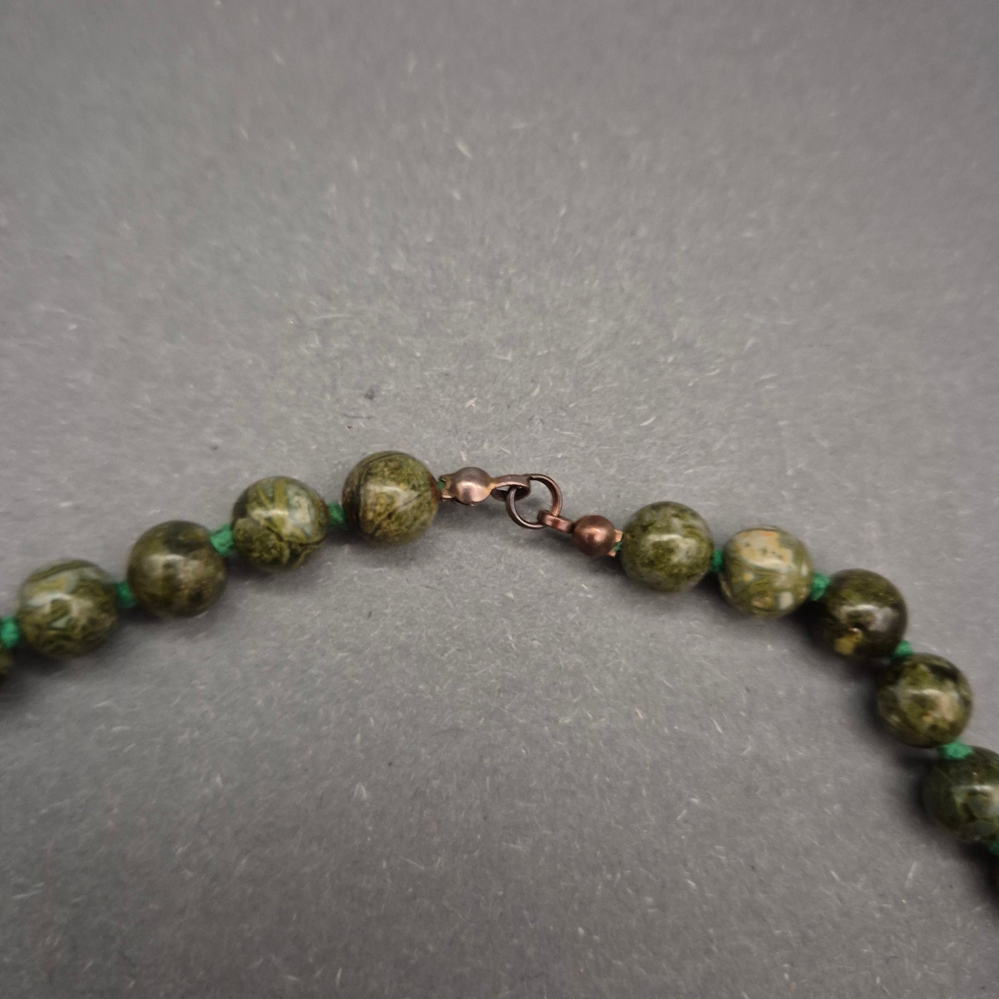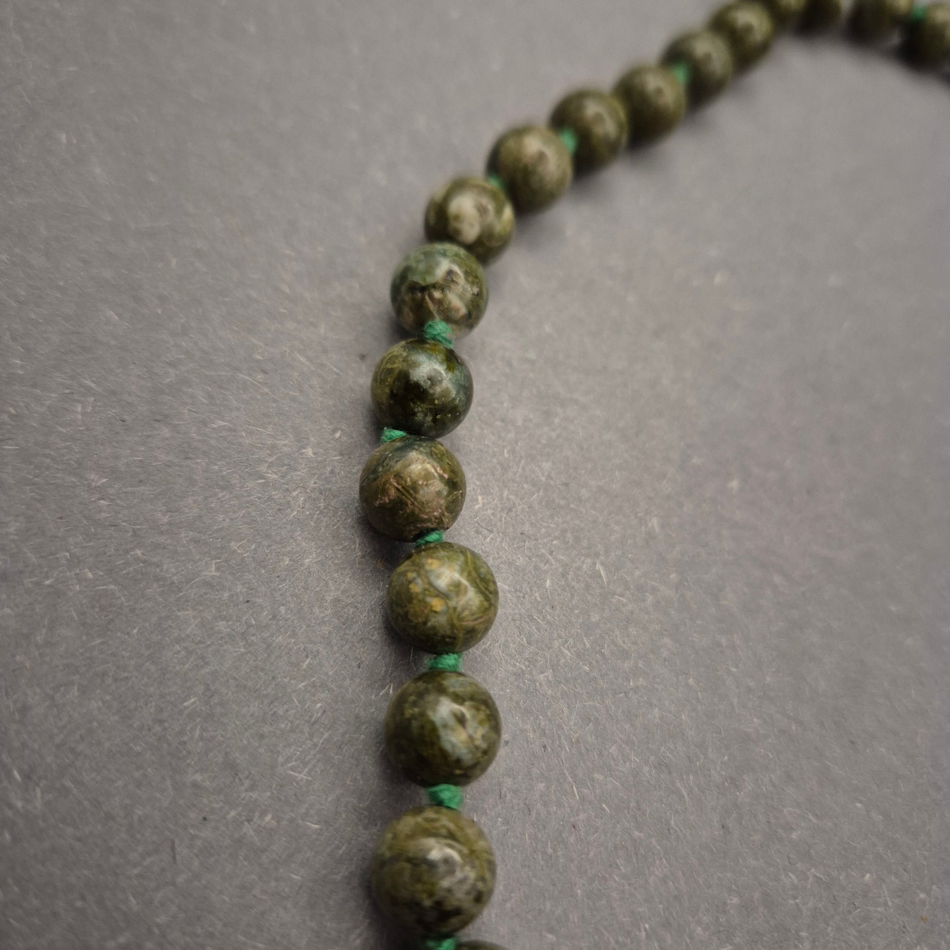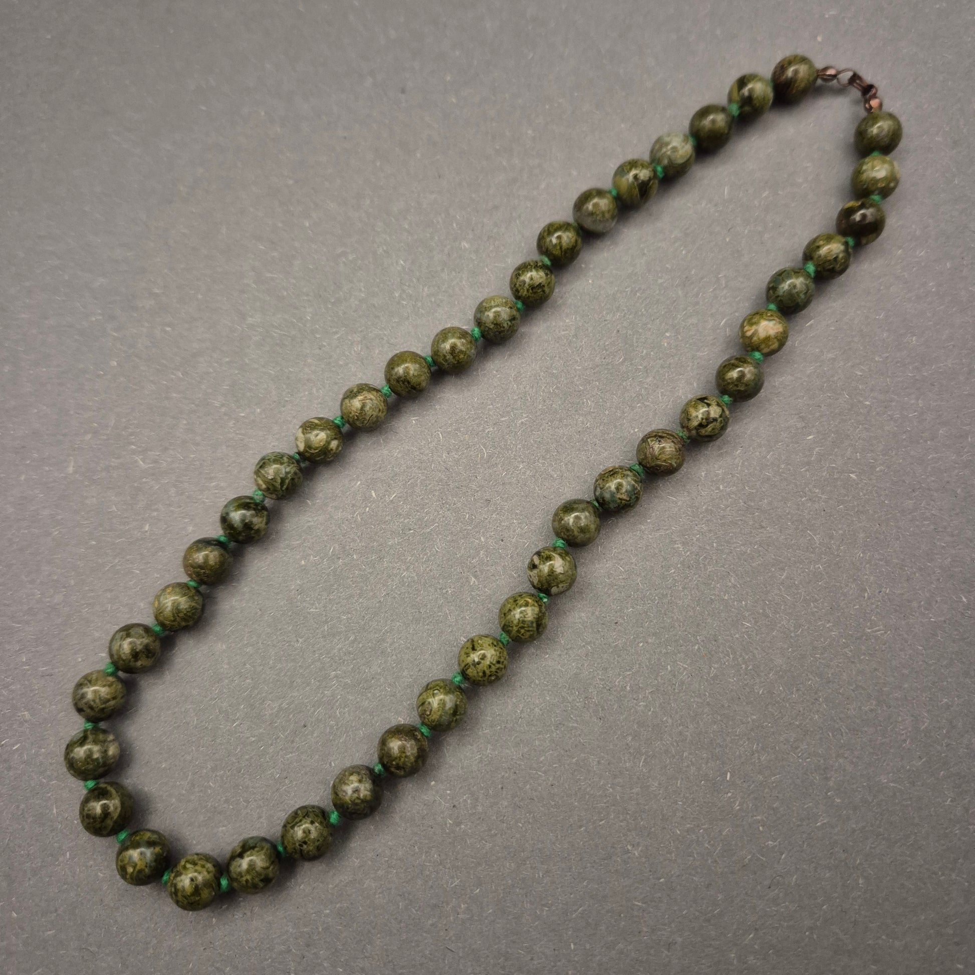 Diese klassische Halskette besteht aus rund geschliffenen, grünen Naturstein-Perlen, die auf farblich passenden Garnen aufgefädelt sind. Die dezenten Farbnuancen und die natürliche Maserung jeder Perle verleihen dem Schmuckstück eine organische, edle Ausstrahlung. Ein dezenter Metallverschluss rundet das Design ab und sorgt für sicheren Halt.