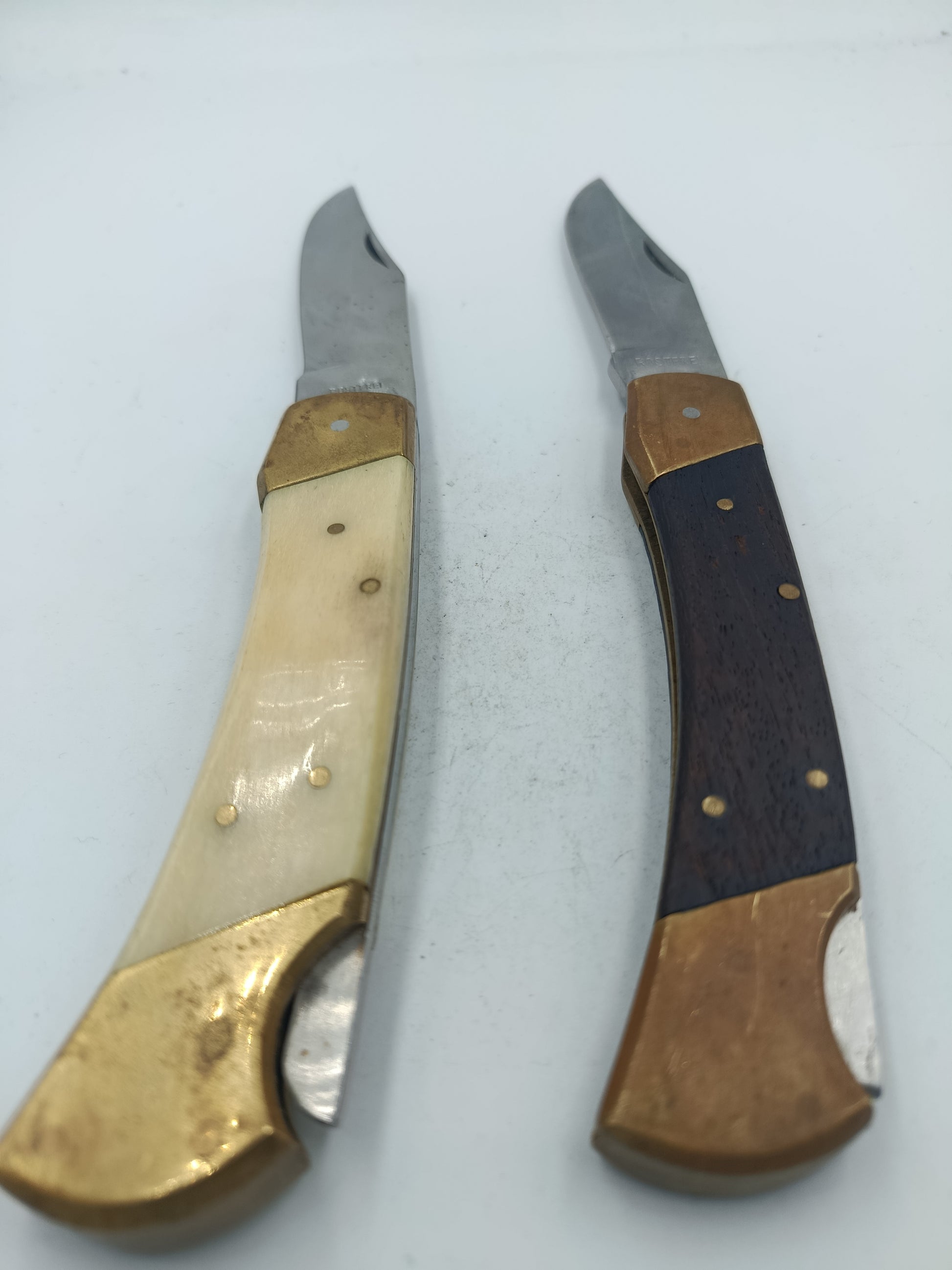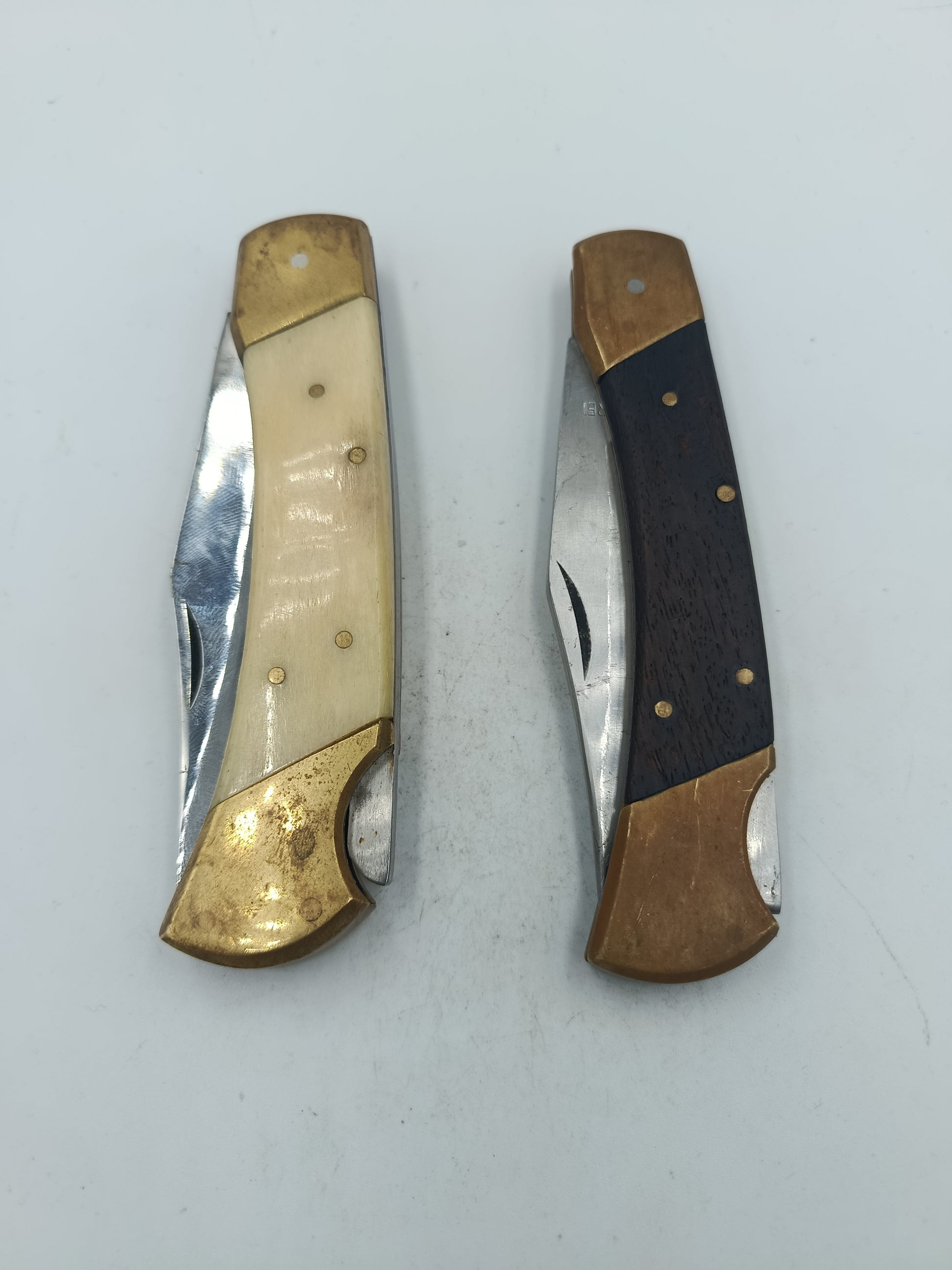 Zwei klassische Taschenmesser im Set mit Messingbeschlägen und Holz-/Knochengriffen