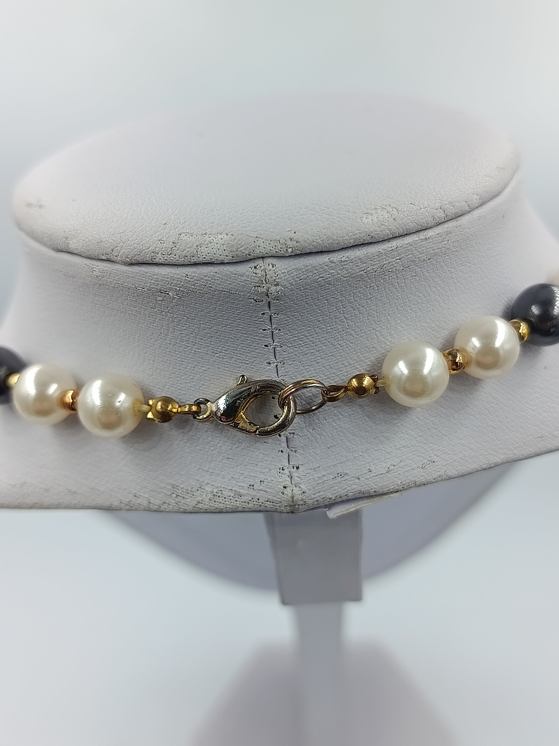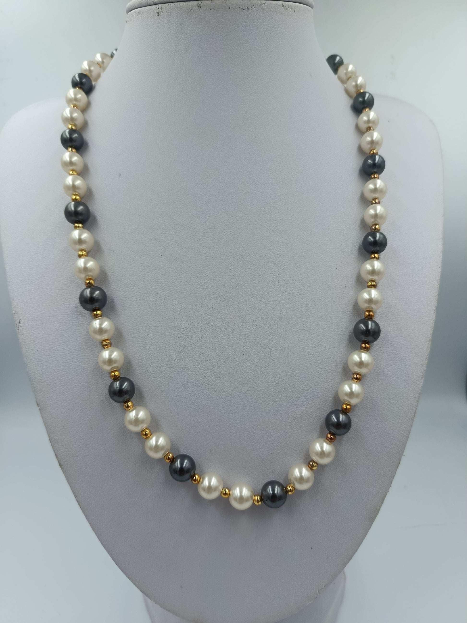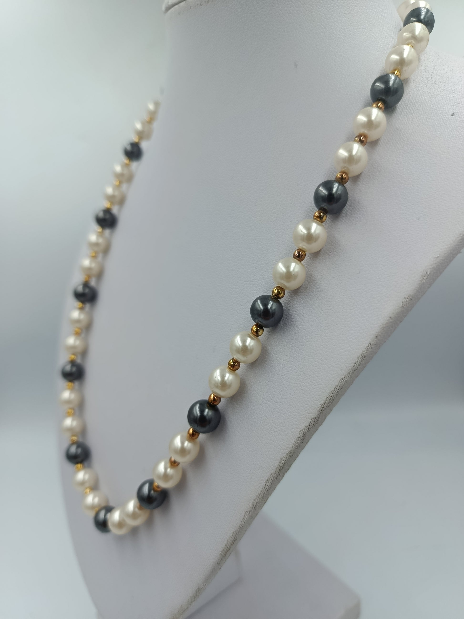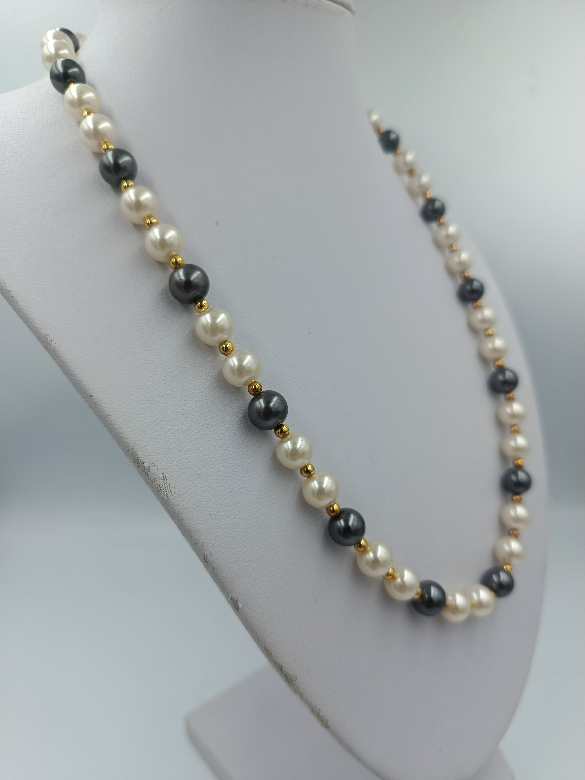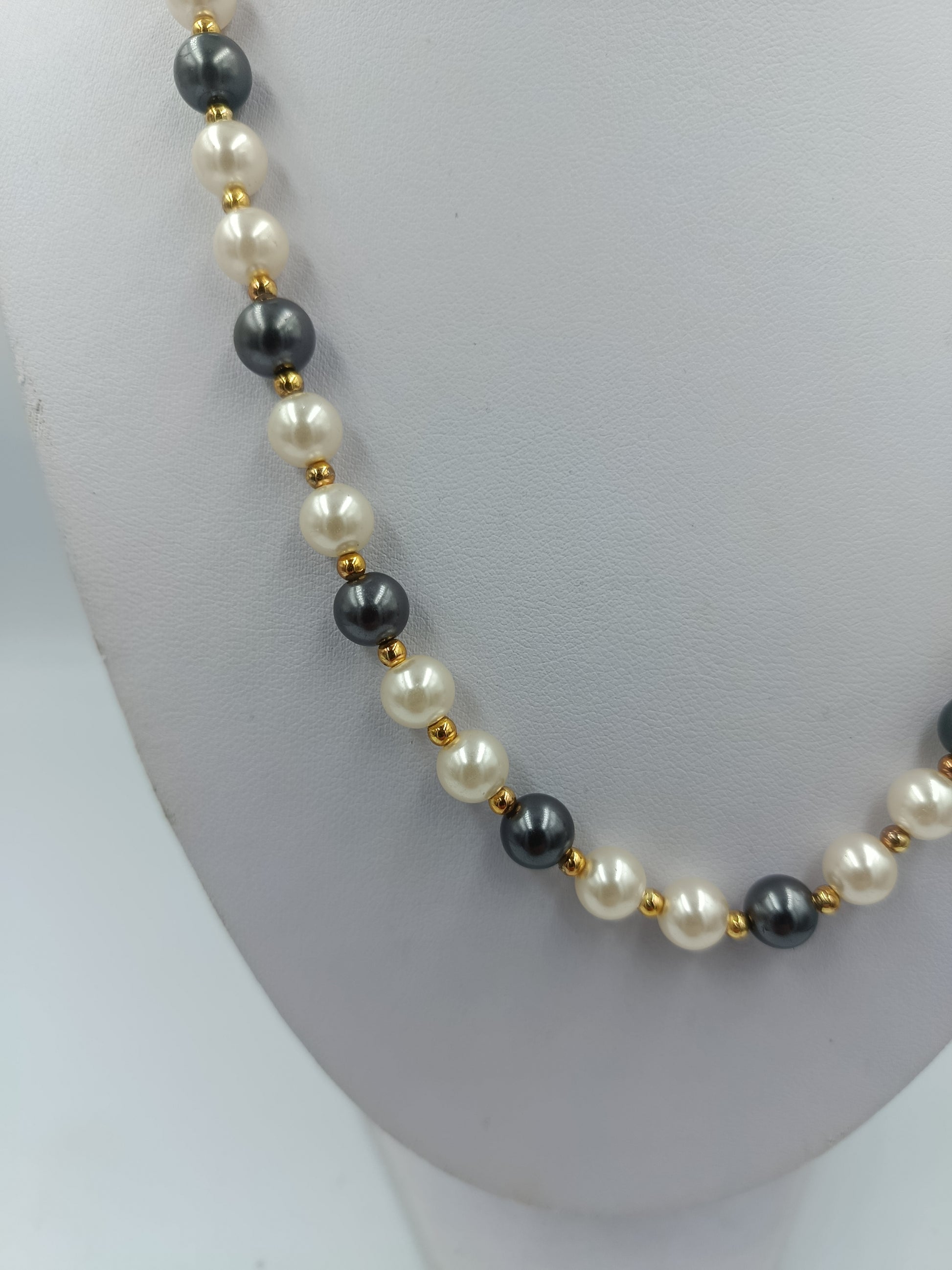 Stilvolle Perlenkette in elegantem Design mit abwechselnd weißen und anthrazitfarbenen Perlen. Die goldfarbenen Zwischenelemente verleihen der Kette einen edlen Kontrast und machen sie zu einem besonderen Blickfang – ideal für elegante Outfits oder festliche Anlässe.