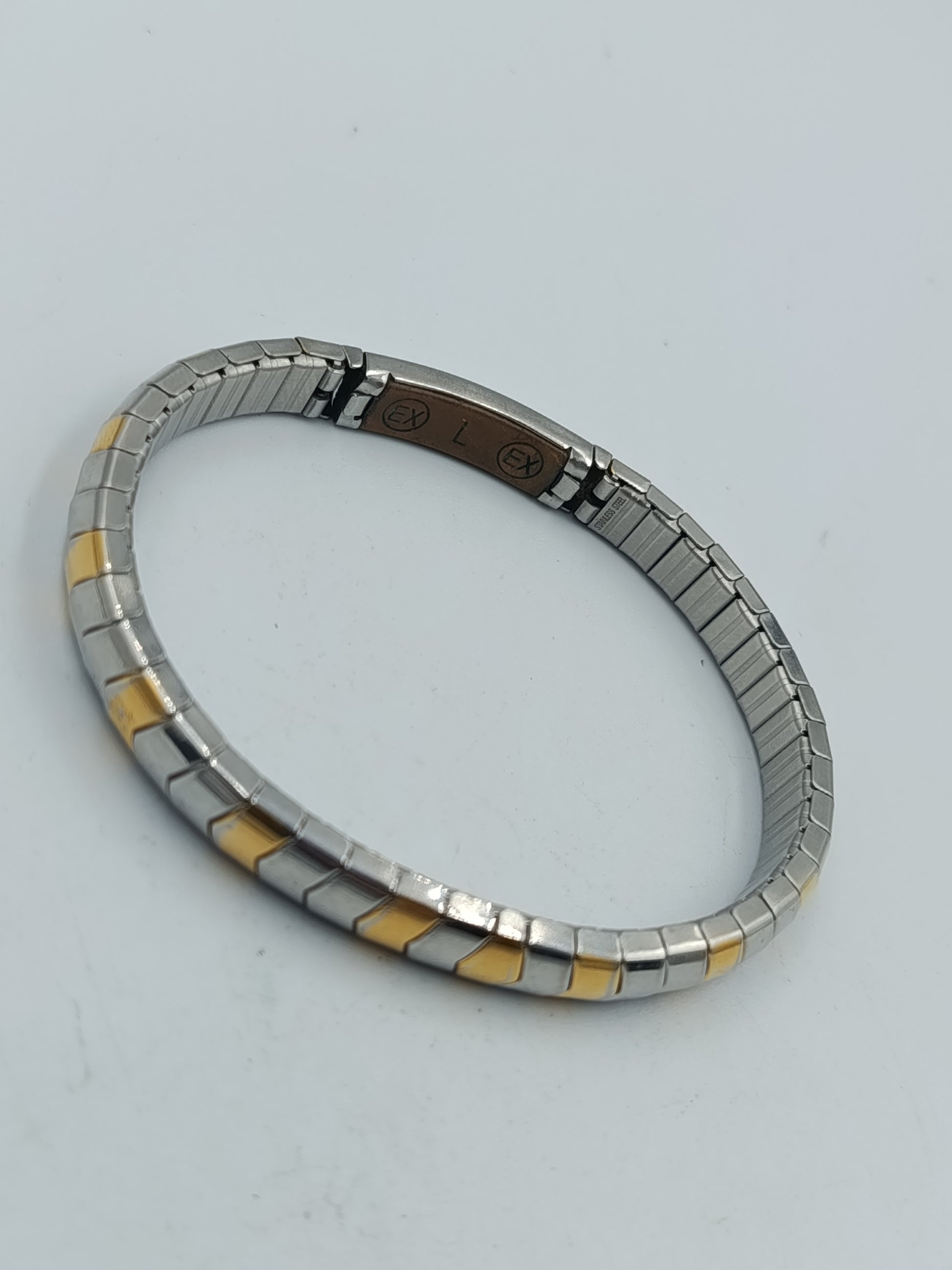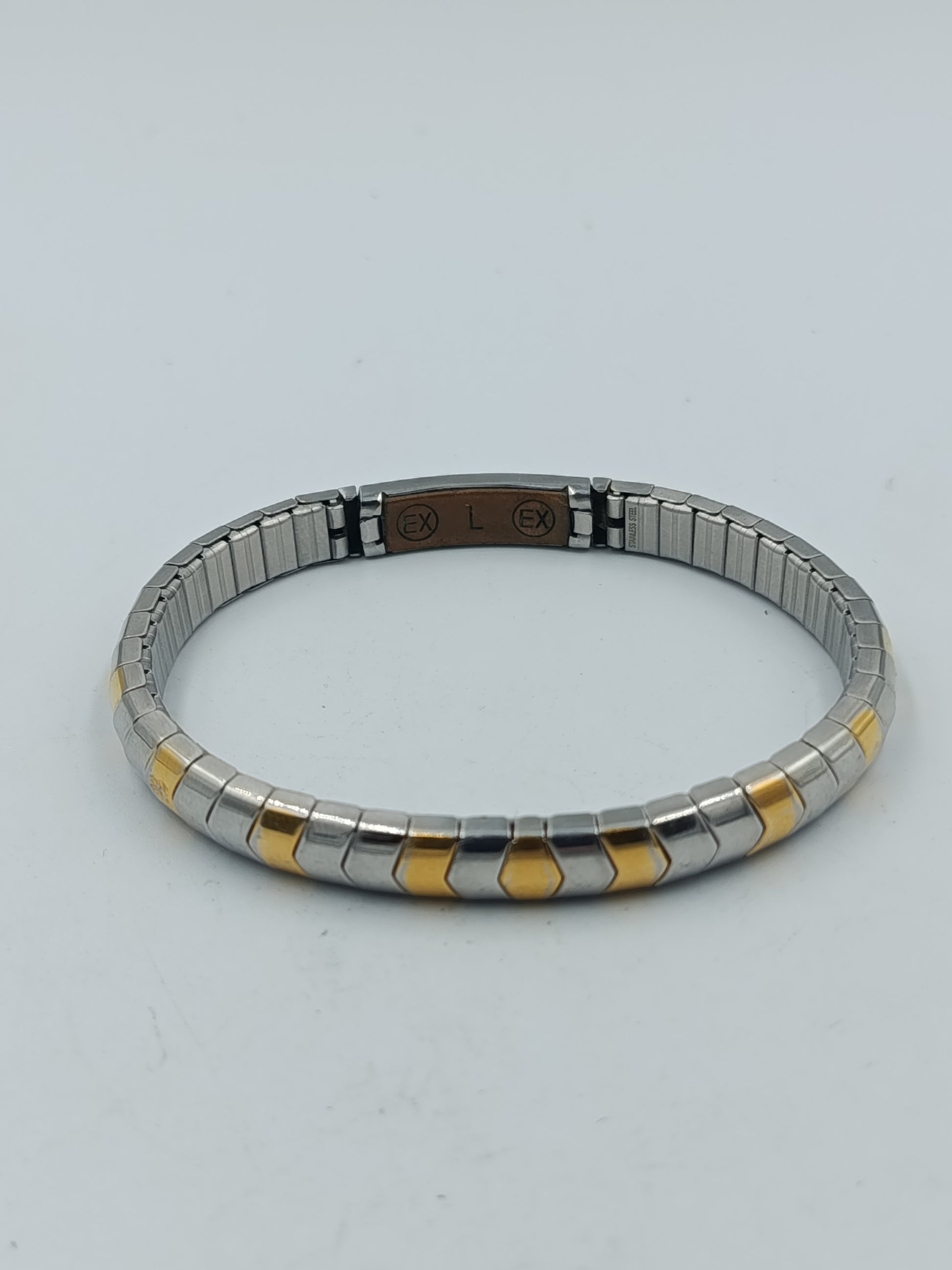 Modernes elastisches Armband mit zweifarbigem Design in silberner und goldfarbener Optik. Durch die elastische Gliederstruktur lässt es sich bequem über das Handgelenk streifen und bietet einen angenehmen Tragekomfort. Ein vielseitiges Accessoire für Damen und Herren – ideal für den Alltag oder als dezenter Blickfang.