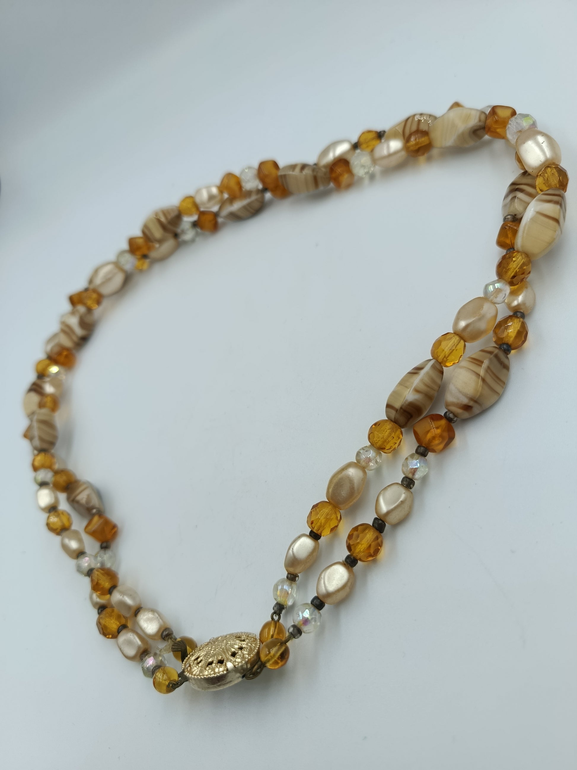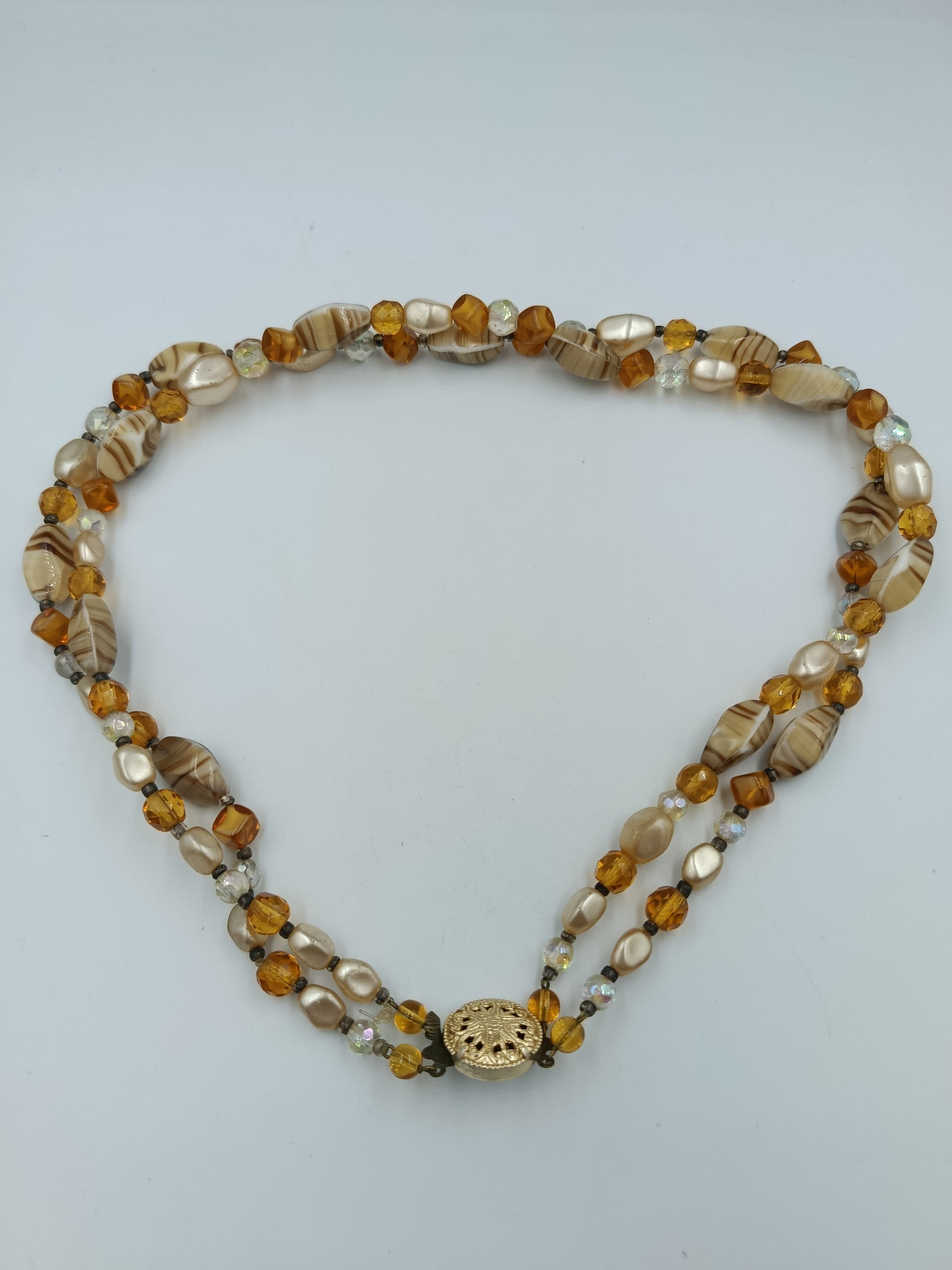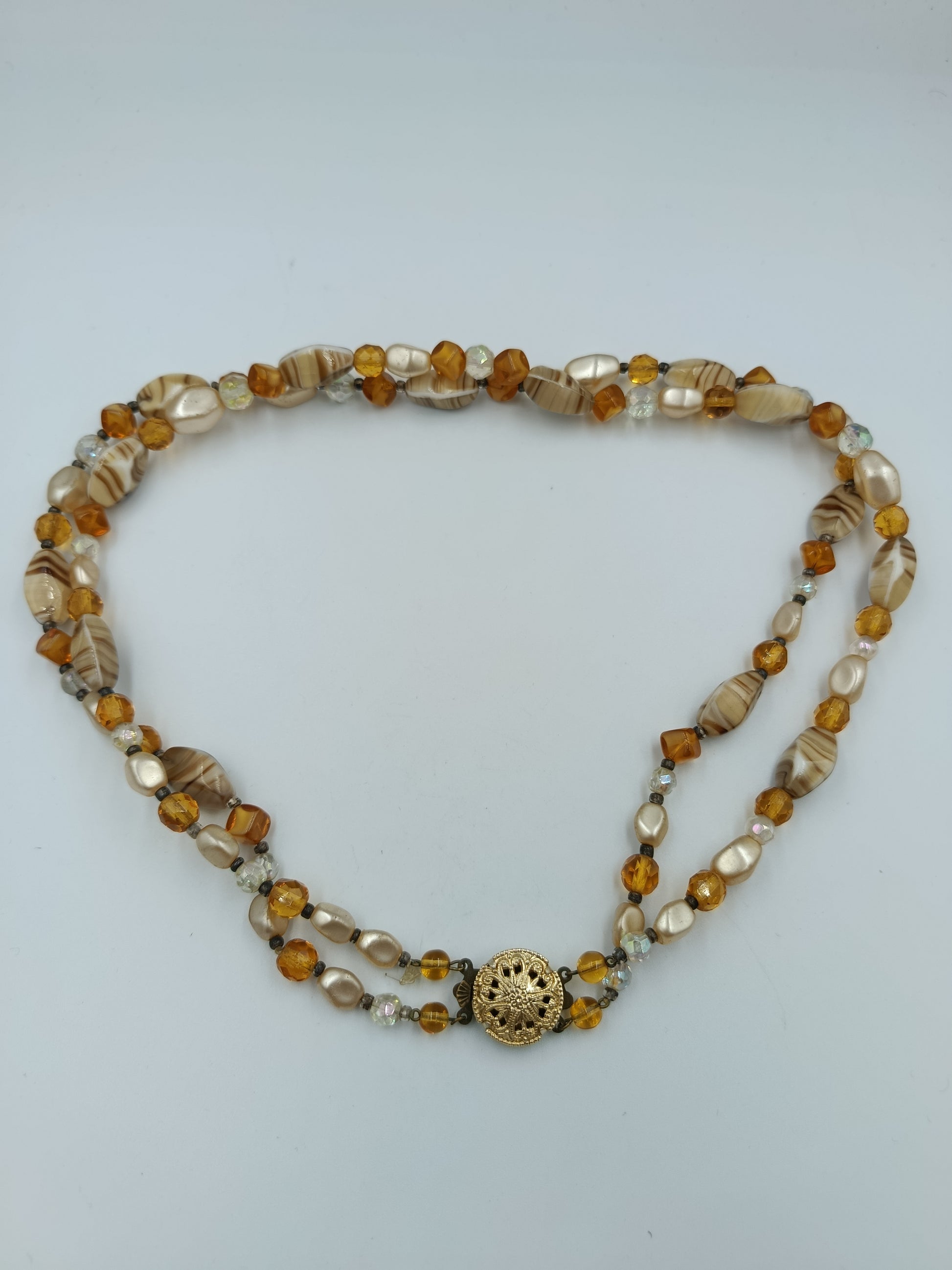 Elegante, zweireihige Halskette in warmen Bernstein- und Cremetönen. Sie besteht aus einer Kombination von facettierten Glasperlen, marmorierten Perlen mit Streifenmuster und perlmuttfarbenen Elementen, die dem Schmuckstück eine edle und zugleich lebendige Ausstrahlung verleihen. Der Blickfang ist das runde, vergoldete Zierschloss mit filigraner Ornamentik, das nicht nur funktional, sondern auch dekorativ wirkt.