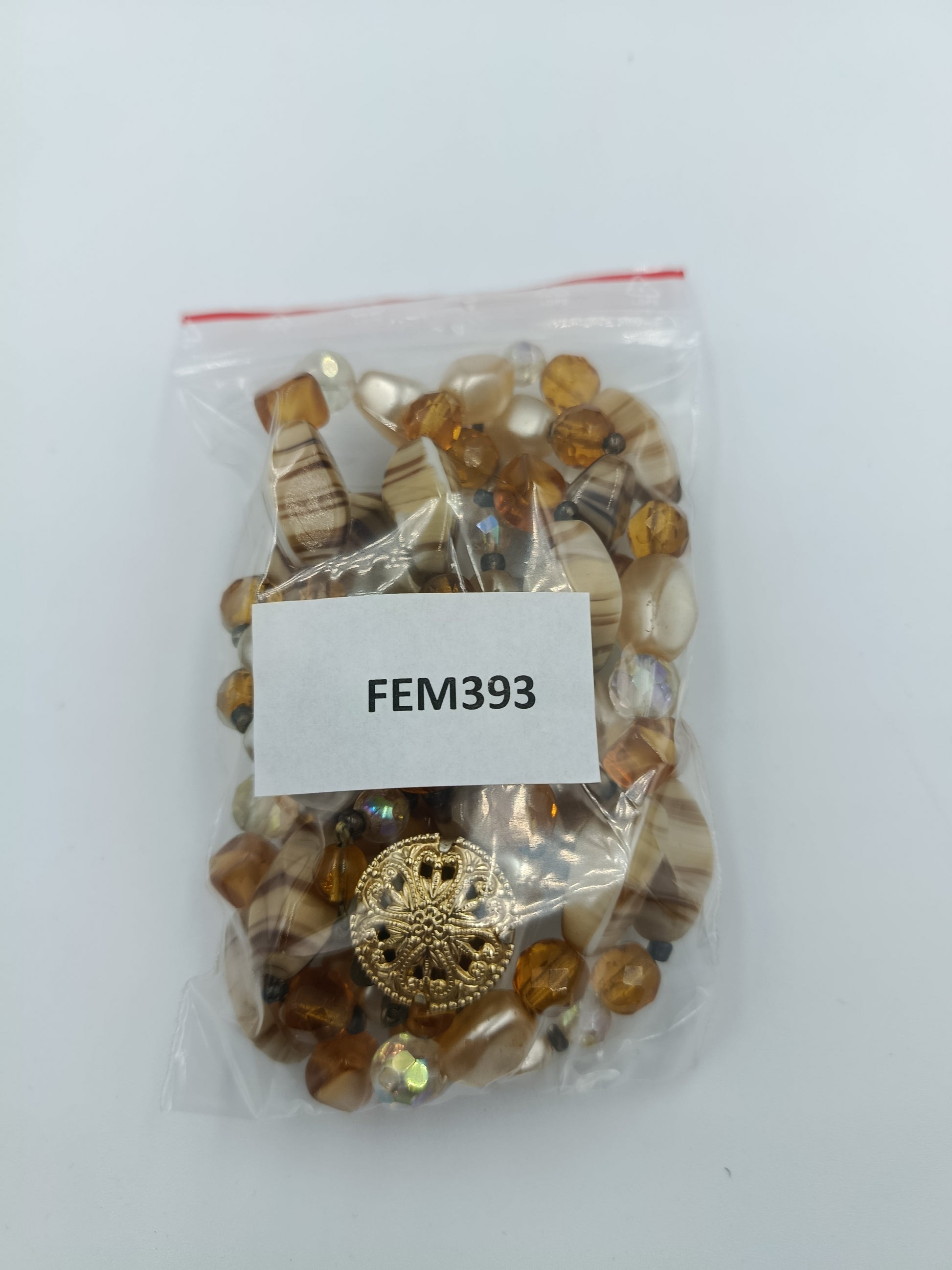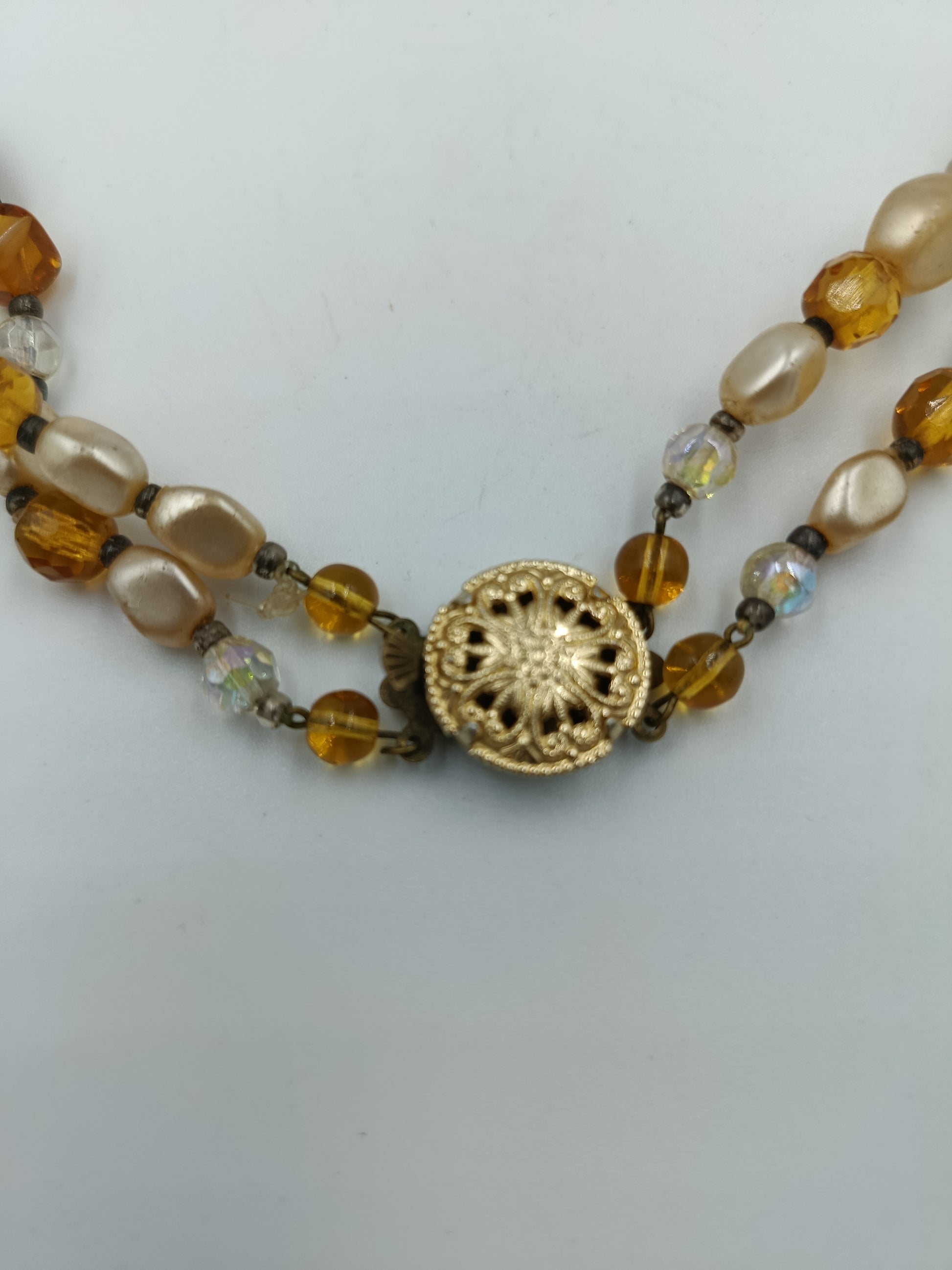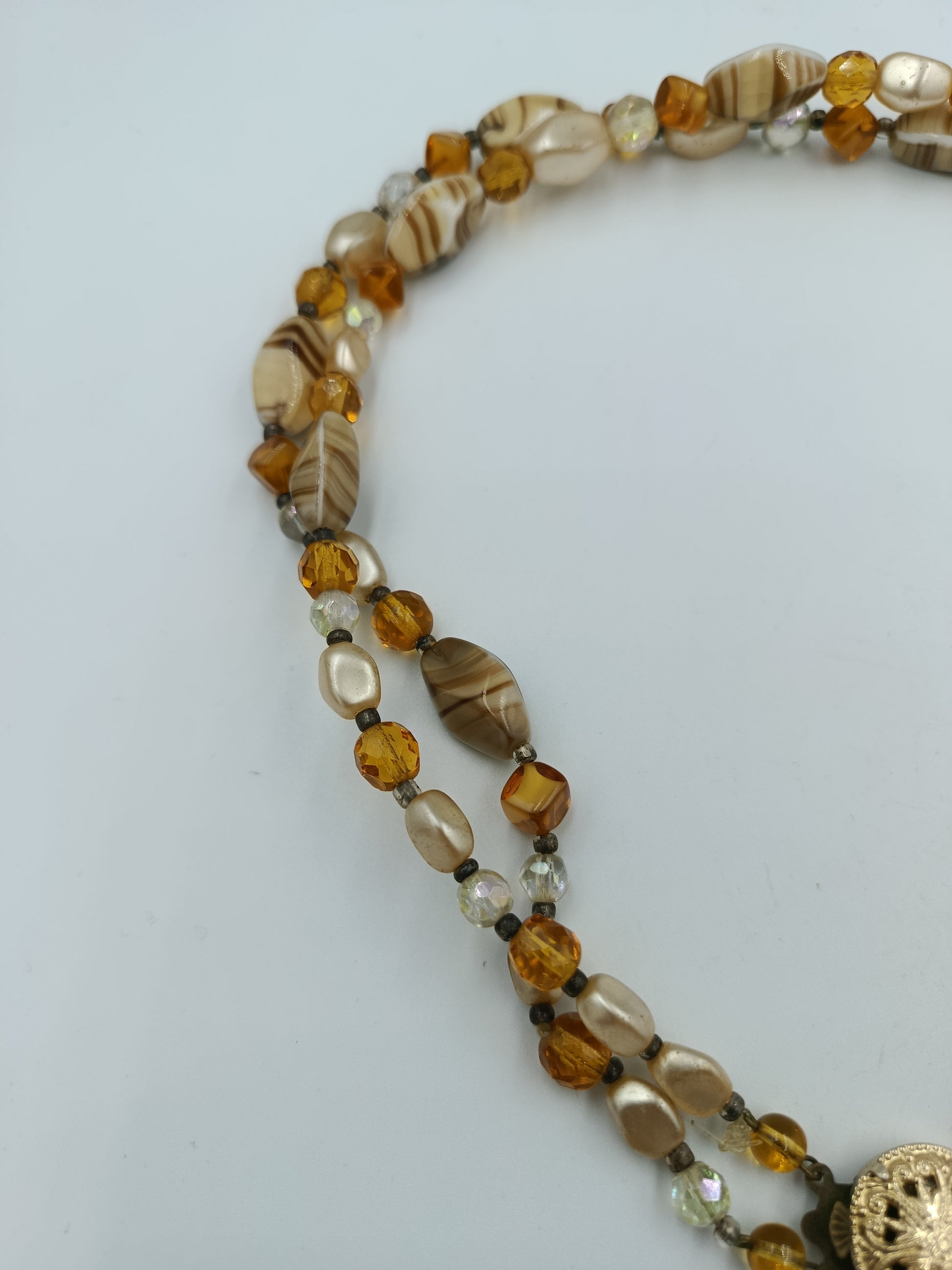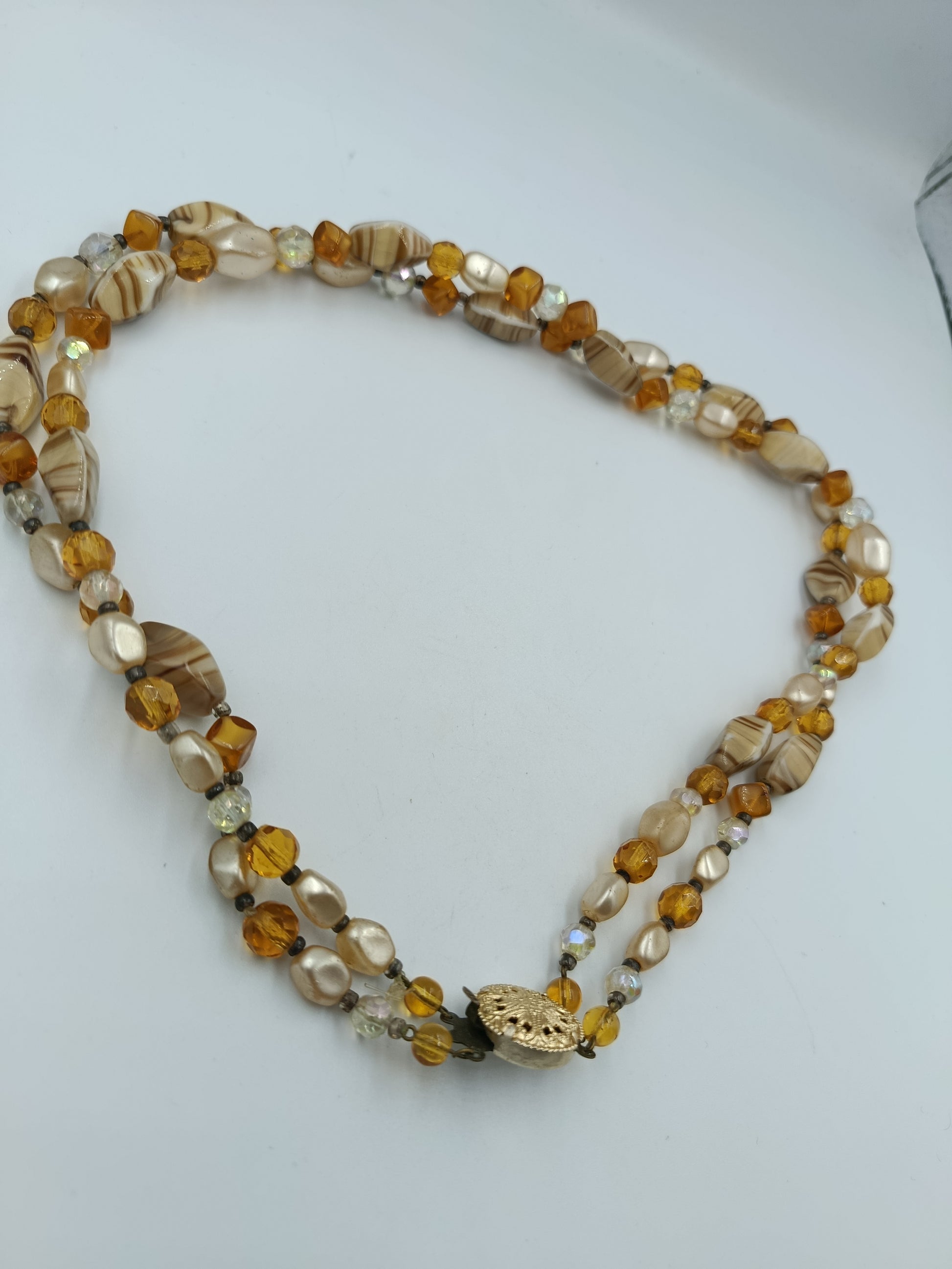 Elegante, zweireihige Halskette in warmen Bernstein- und Cremetönen. Sie besteht aus einer Kombination von facettierten Glasperlen, marmorierten Perlen mit Streifenmuster und perlmuttfarbenen Elementen, die dem Schmuckstück eine edle und zugleich lebendige Ausstrahlung verleihen. Der Blickfang ist das runde, vergoldete Zierschloss mit filigraner Ornamentik, das nicht nur funktional, sondern auch dekorativ wirkt.