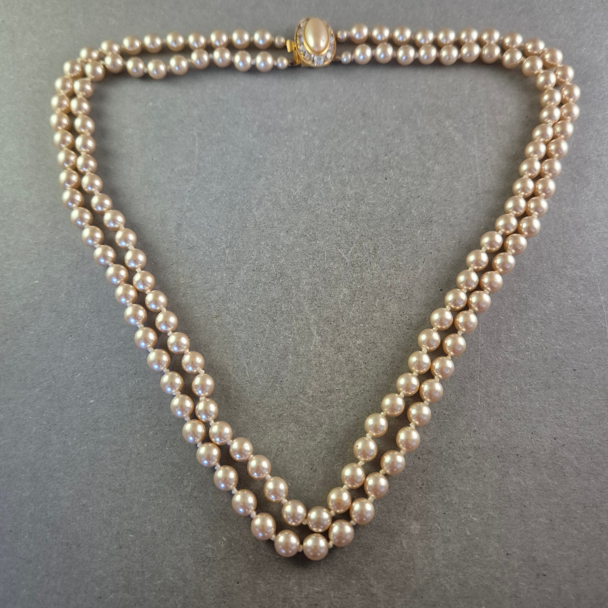 Diese elegante zweireihige Perlen Halskette bringt zeitlose Schönheit und klassischen Vintage-Charme zusammen. Die gleichmäßig schimmernden Perlen in zartem Creme-Ton werden von einem dekorativen ovalen Steckverschluss abgerundet, der mit einem perlmuttfarbenen Element und feinen Glitzersteinen verziert ist. Ideal für festliche Anlässe oder als stilvolles Accessoire im Alltag.