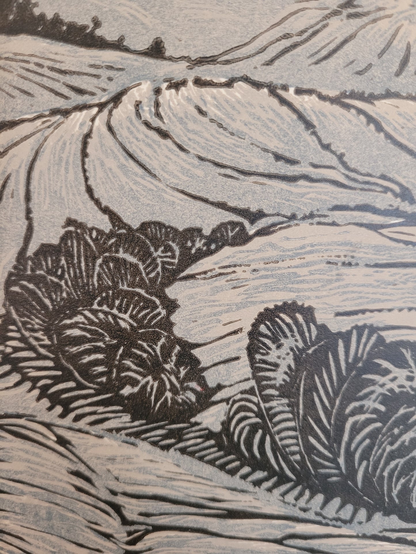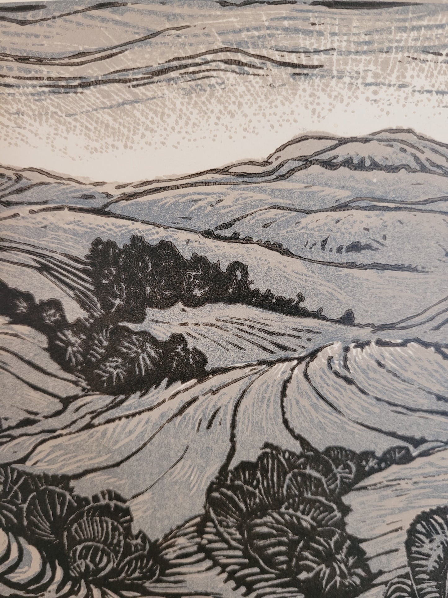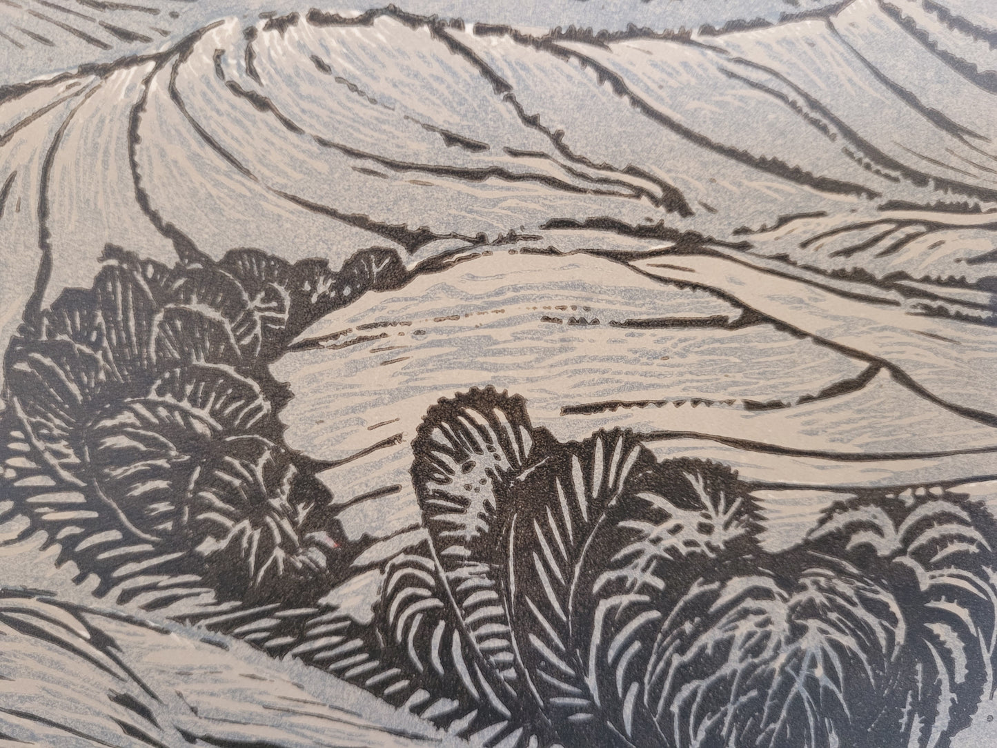 Asiatische Schule (XX) Original Linolschnitt Weite Landschaft mit Hügeln