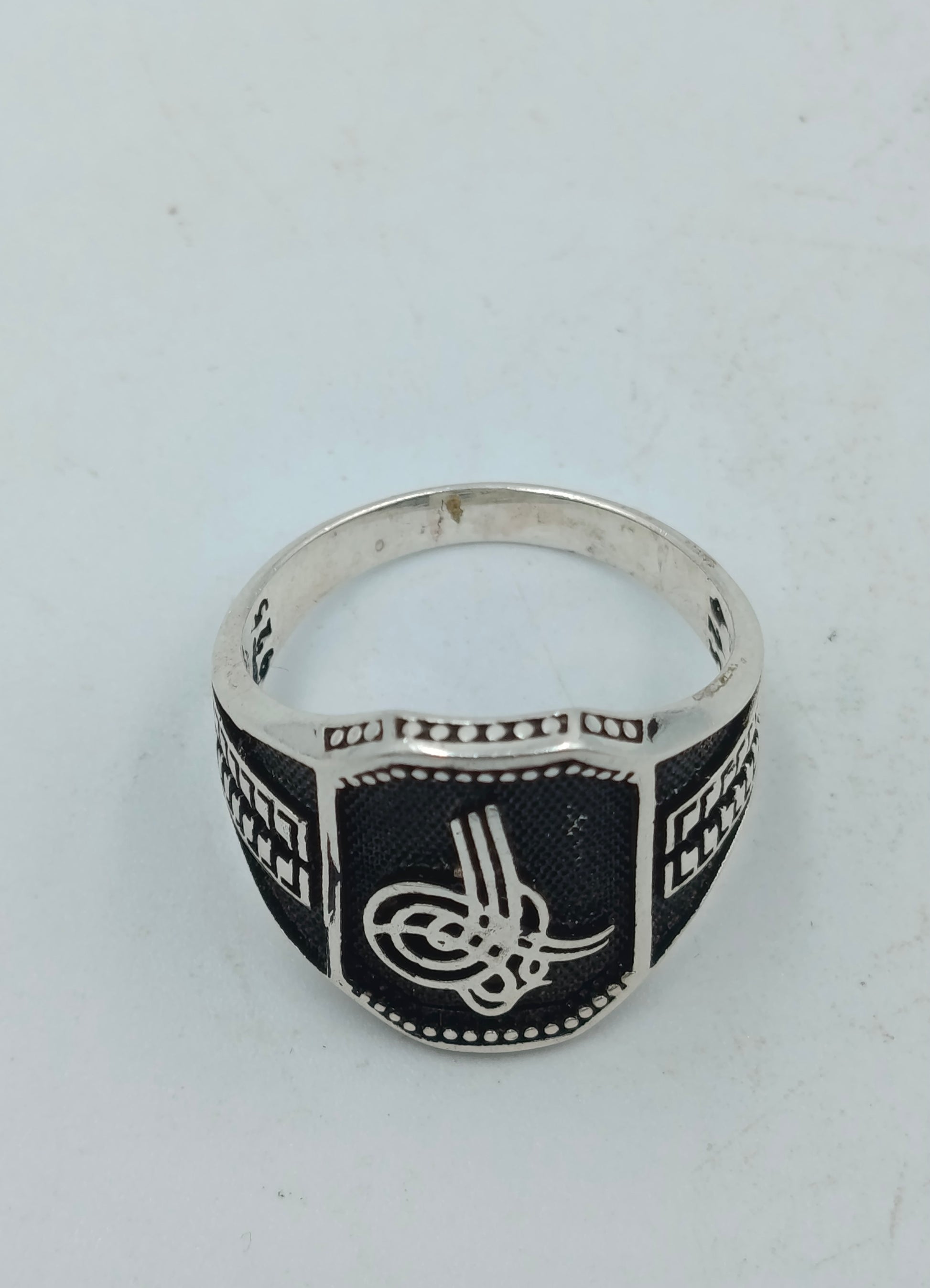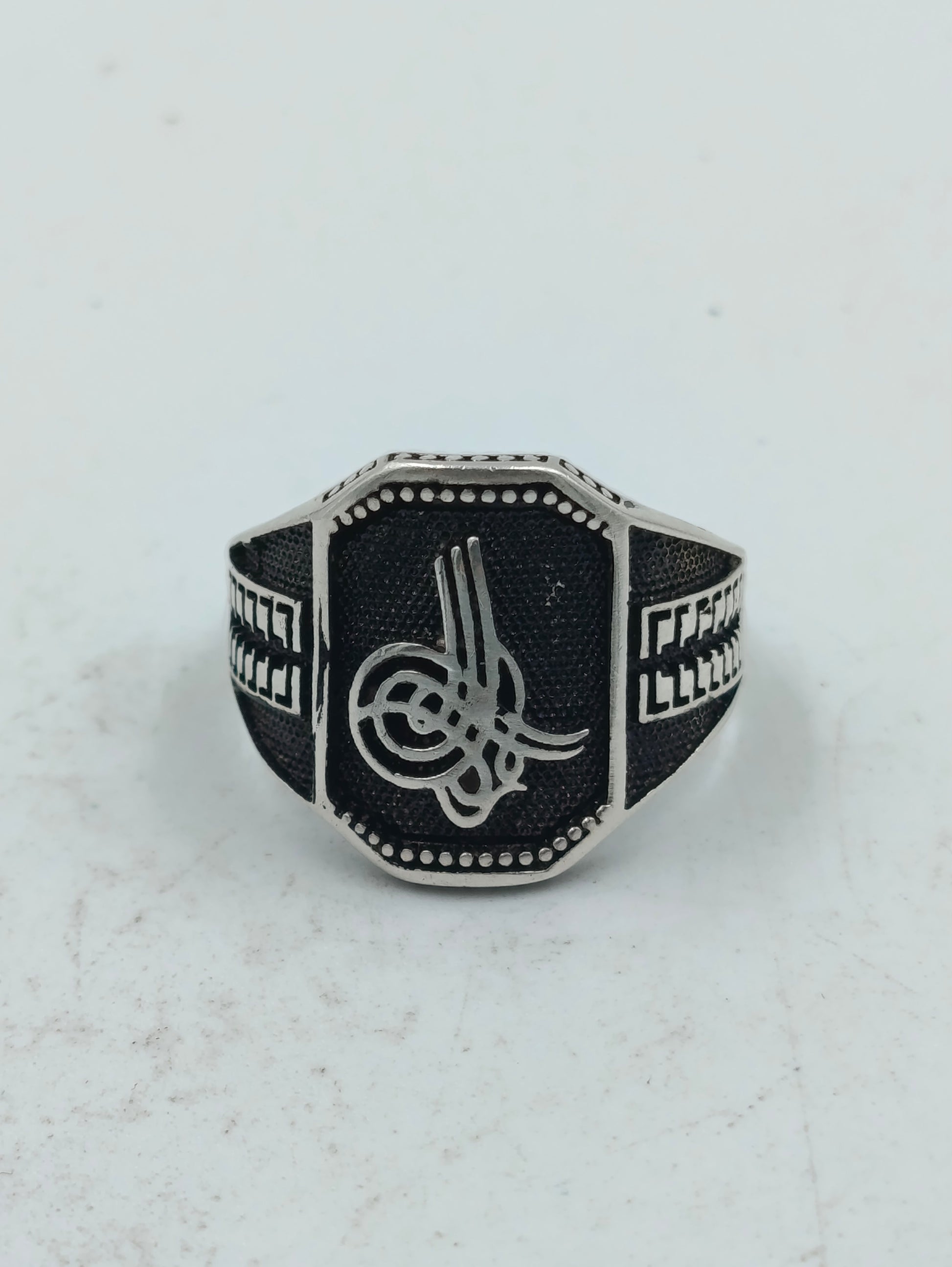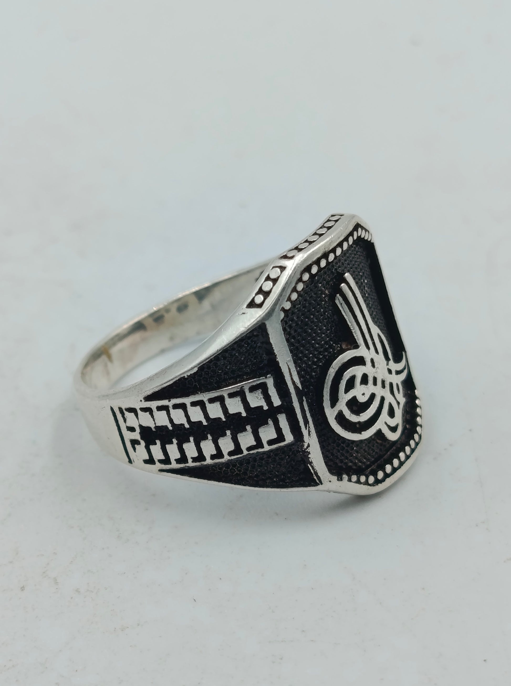 Maskuliner 925er Silber Herrenring mit markanter Tughra Gravur auf schwarzem Hintergrund. Das kantige Design mit orientalischen Mustern an den Seiten verleiht dem Ring einen kraftvollen, edlen Charakter. Ein Statementstück mit kultureller Note – ideal für Männer mit Stil und Persönlichkeit.