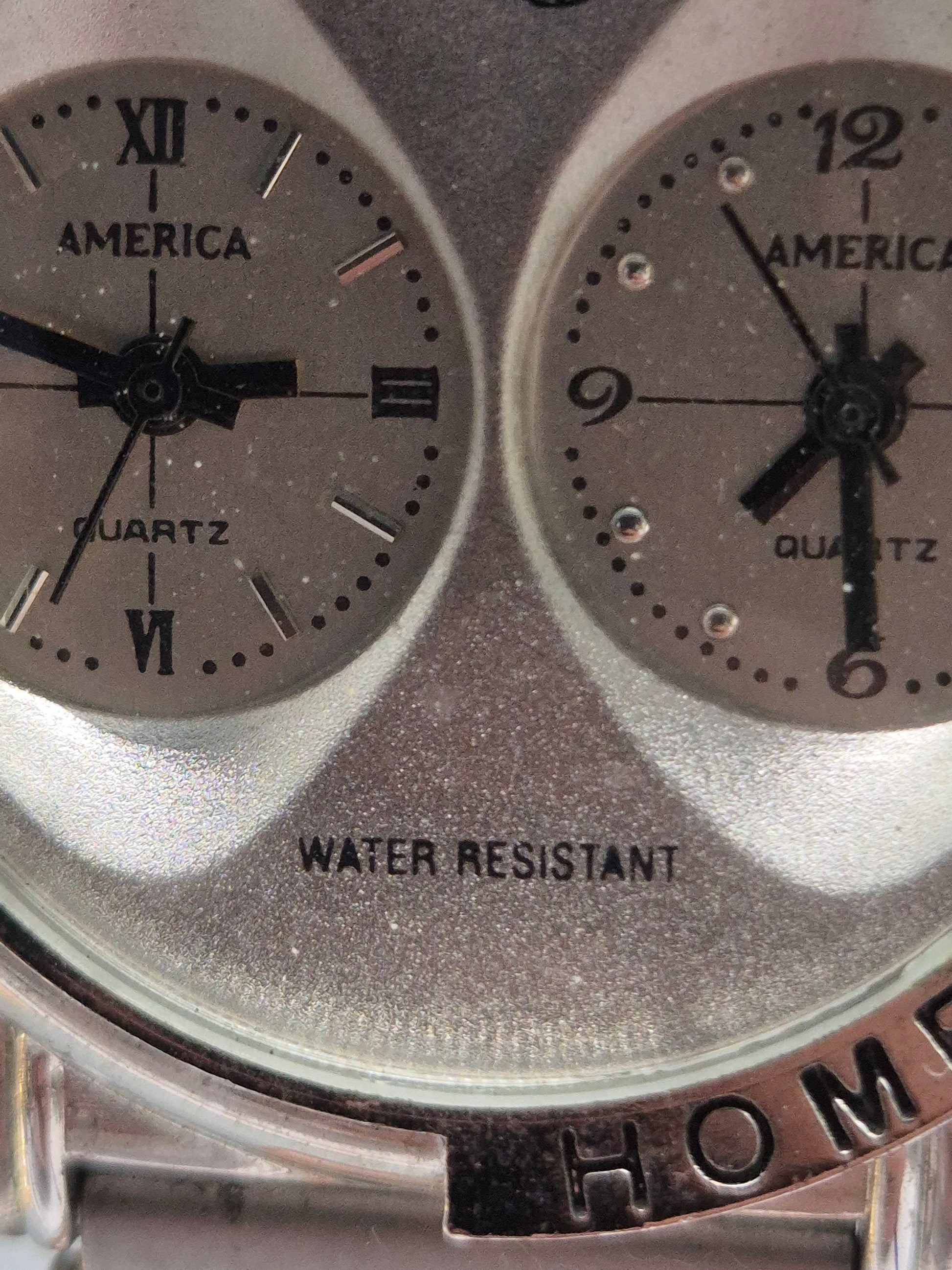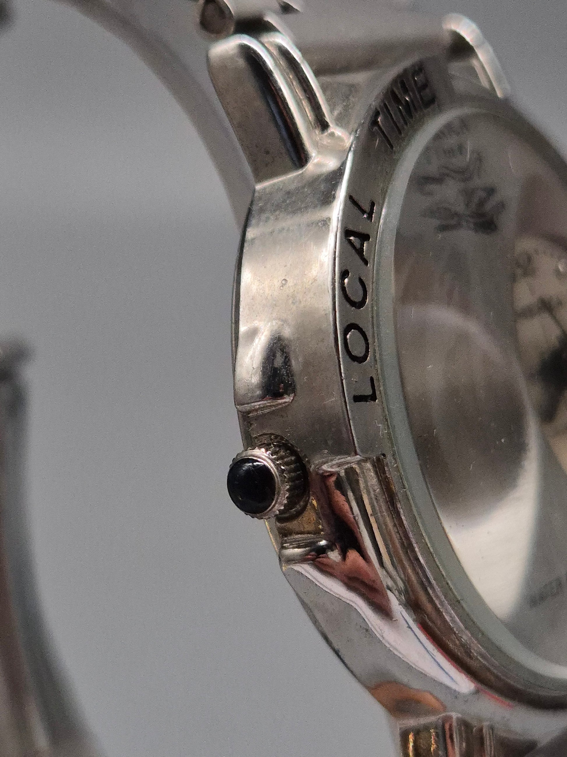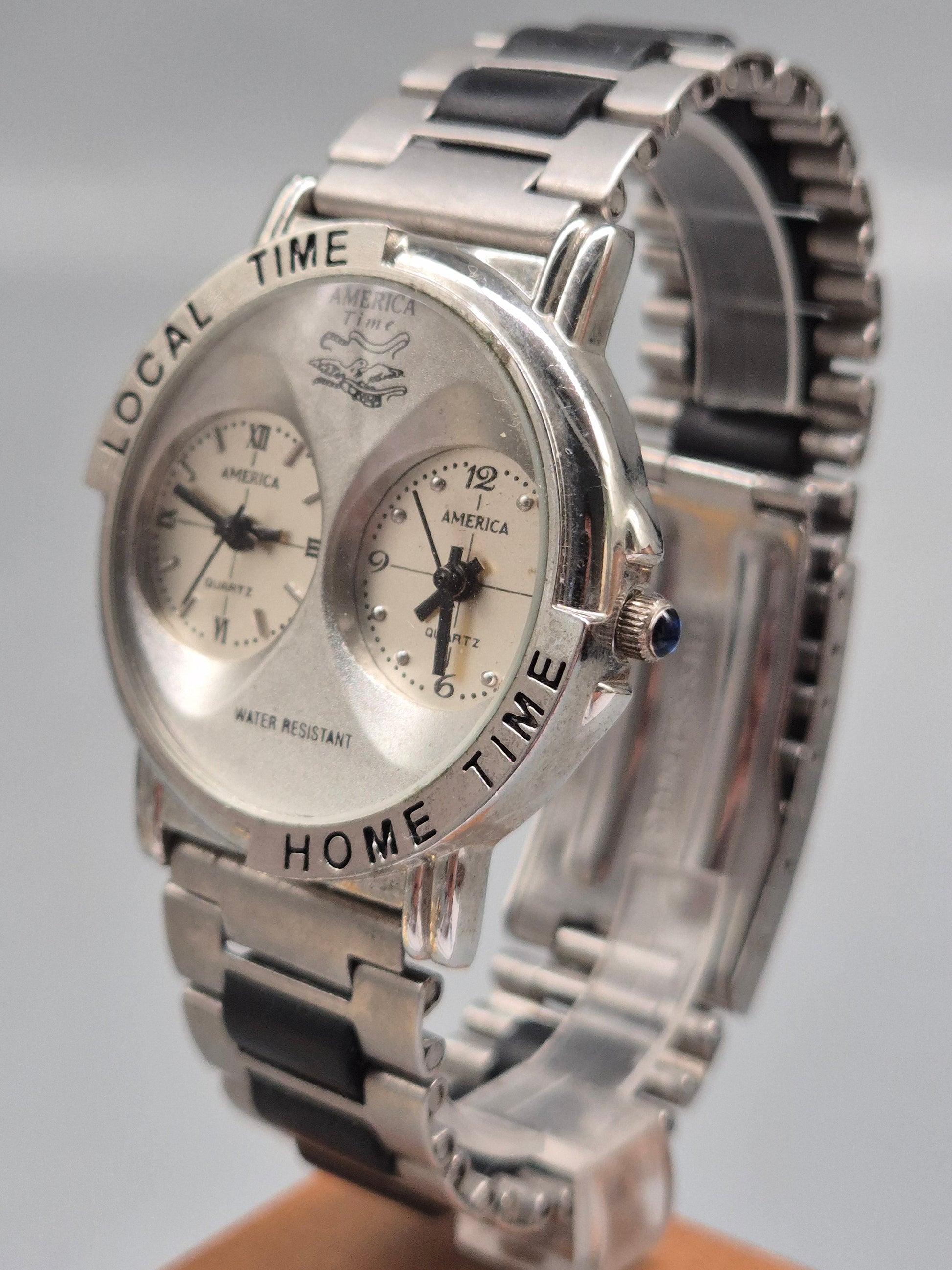 Diese auffällige America Time Herren Uhr bietet zwei separate Quarzwerke für parallele Zeitanzeigen – ideal für Vielreisende oder Geschäftsleute mit internationalen Kontakten. Das Zifferblatt ist in zwei Sektionen unterteilt: „Local Time“ und „Home Time“, jeweils mit eigenem Design. Das markante Edelstahlgehäuse wird durch ein zweifarbiges Gliederarmband in Silber und Schwarz ergänzt. Praktisch, funktional und mit einem Hauch Retro-Charme – diese Uhr ist ein echter Hingucker.