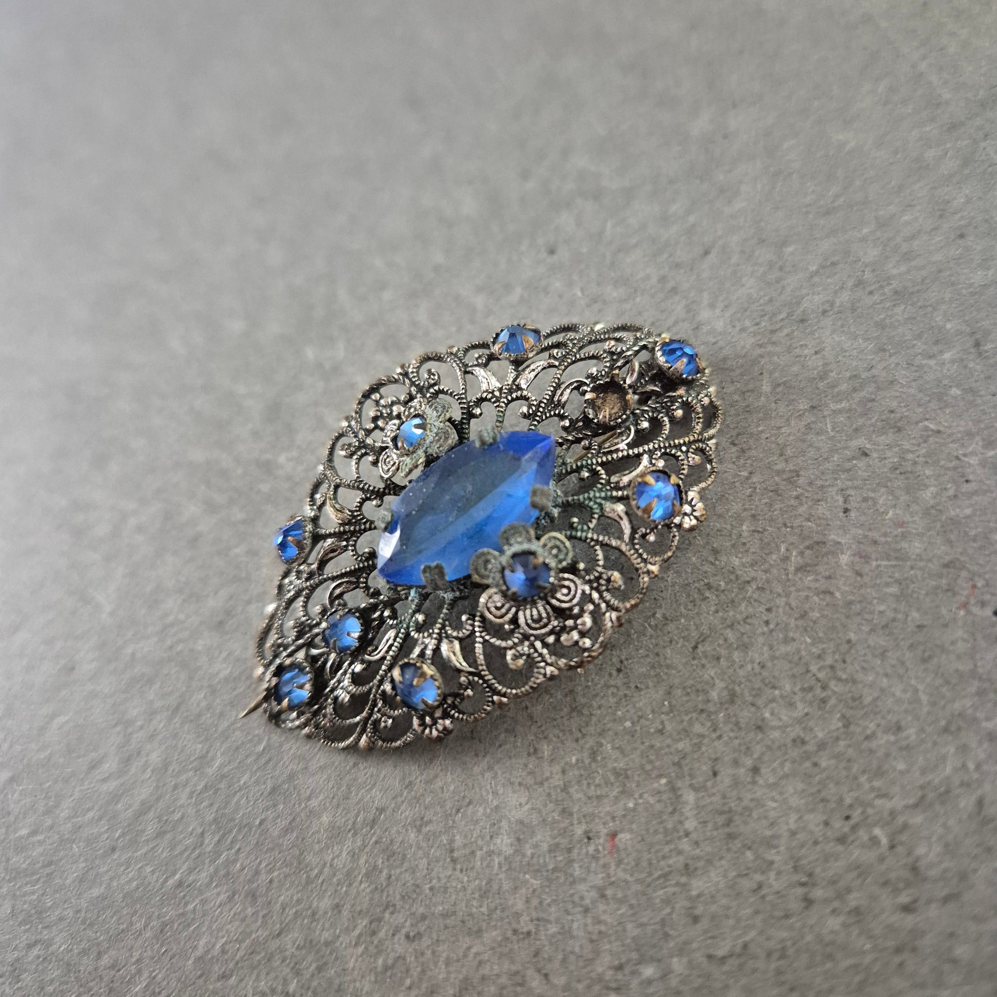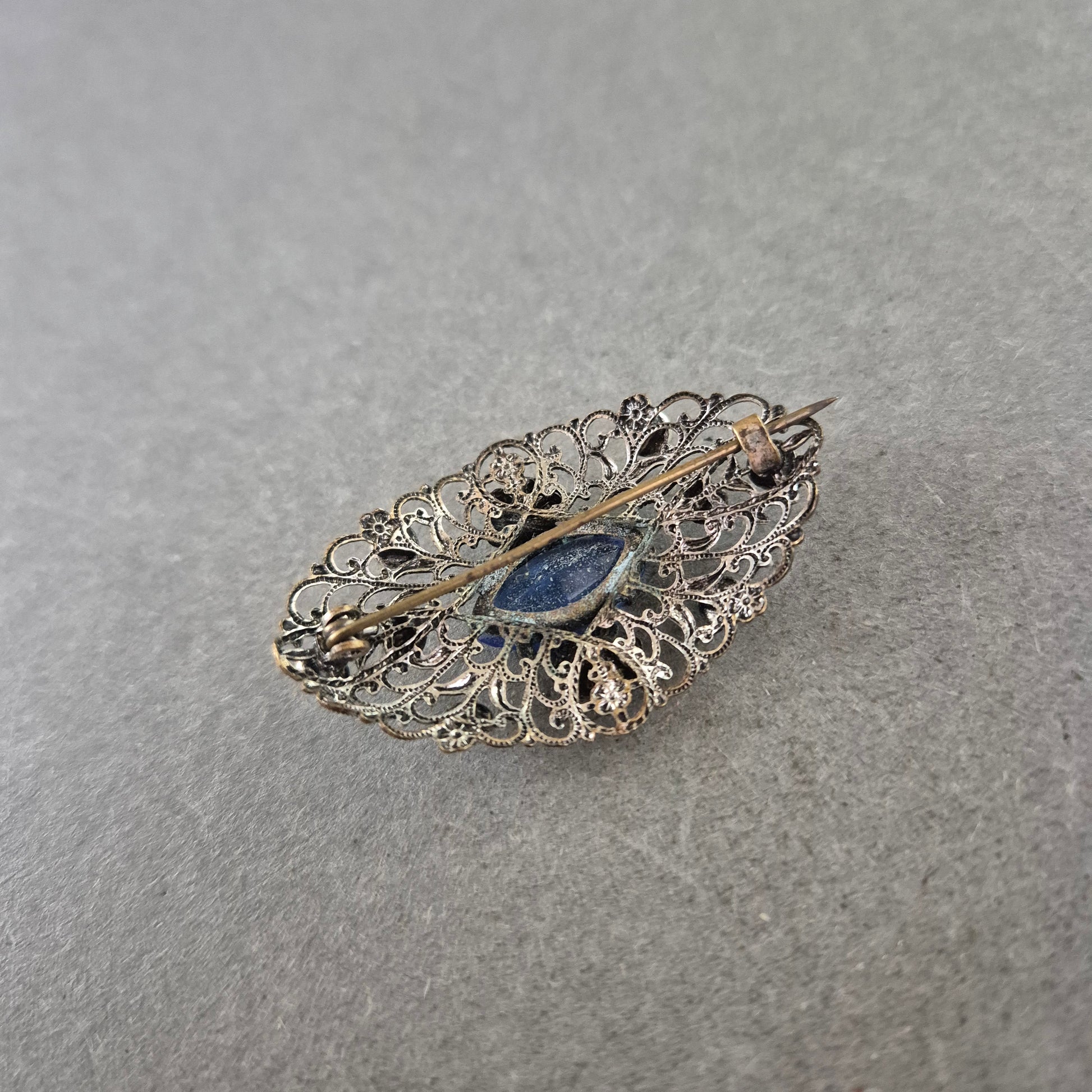 Antike Brosche im Filigran-Design mit blauen Schmucksteinen