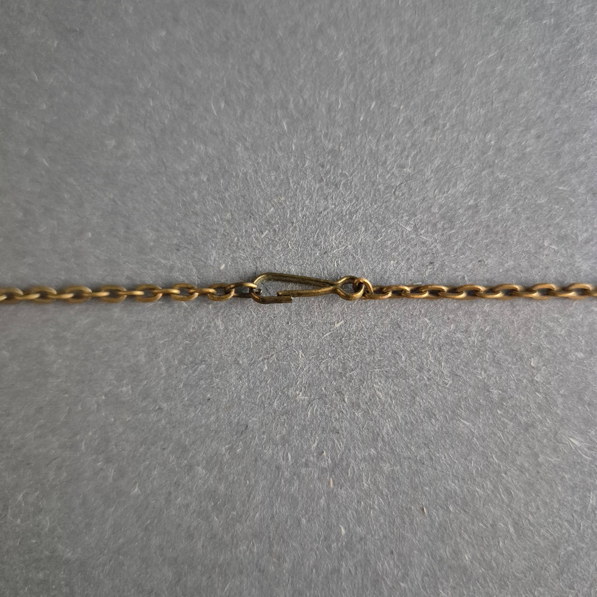 Diese elegante Vintage-Damenkette besticht durch ihr verschnörkeltes, florales Design und ein kunstvoll eingefasstes schwarzes Schmuckelement in Tropfenform. Die messingfarbene Kette verleiht dem Stück eine antike Optik und macht es zu einem idealen Accessoire für Liebhaber klassischer Schmuckstücke. Drei funkelnde Glassteine runden das Design geschmackvoll ab.