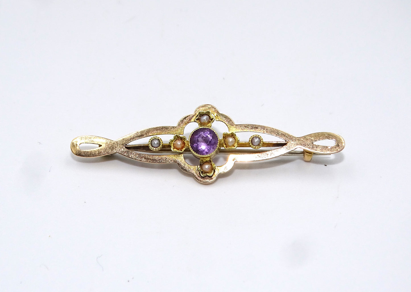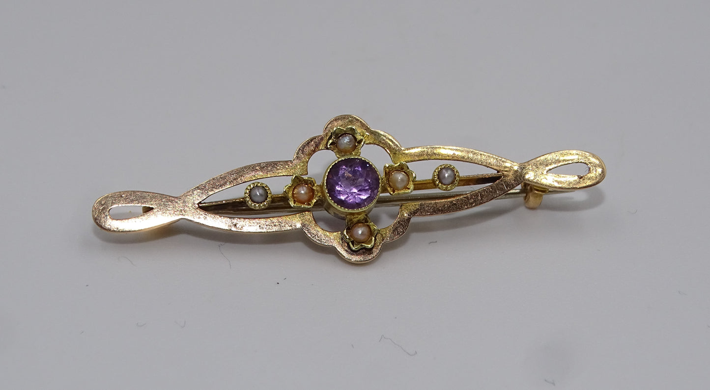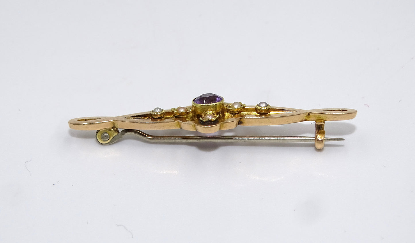 Antike Jugendstil 14k Gold Brosche mit Amethyst und Perlen