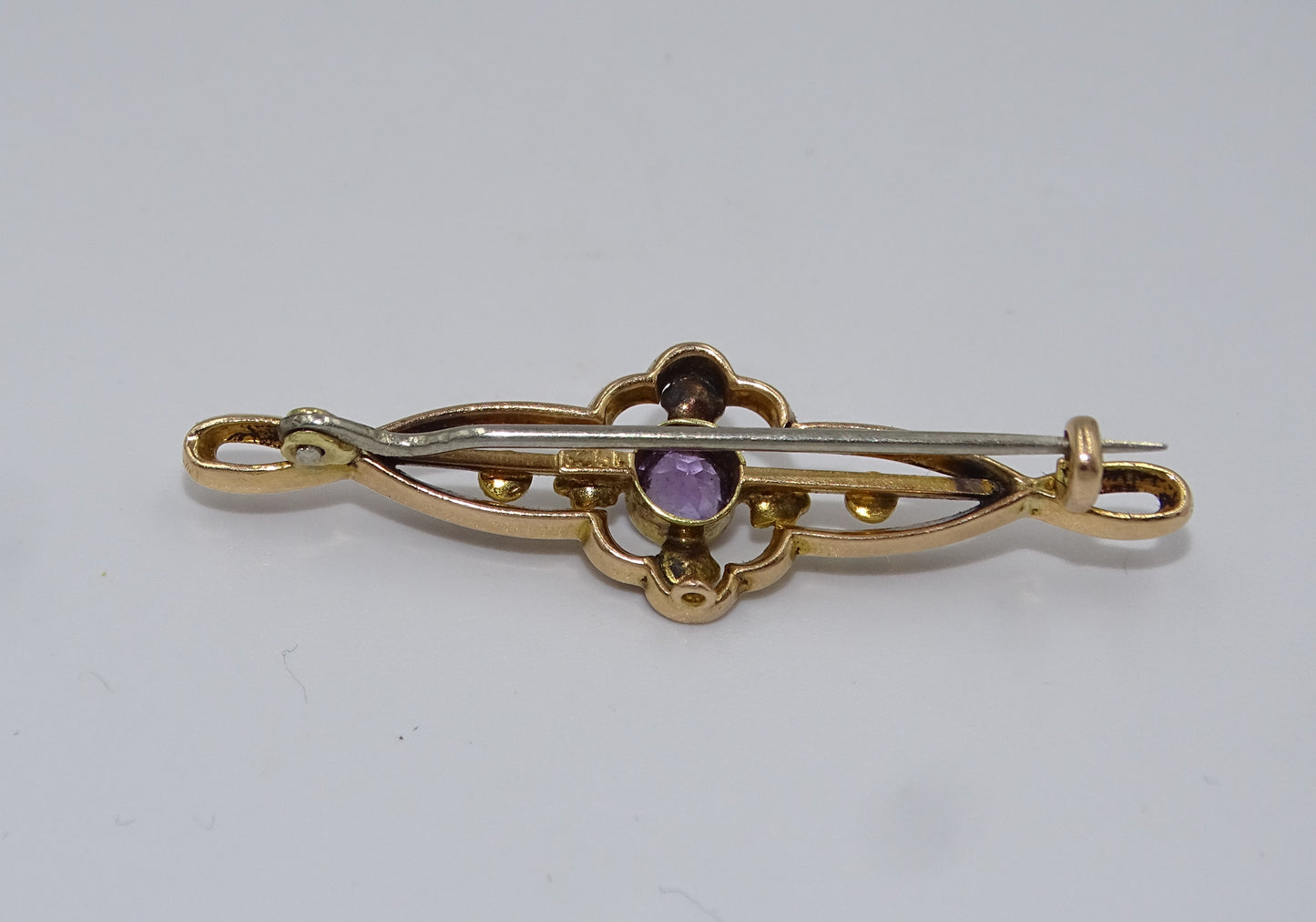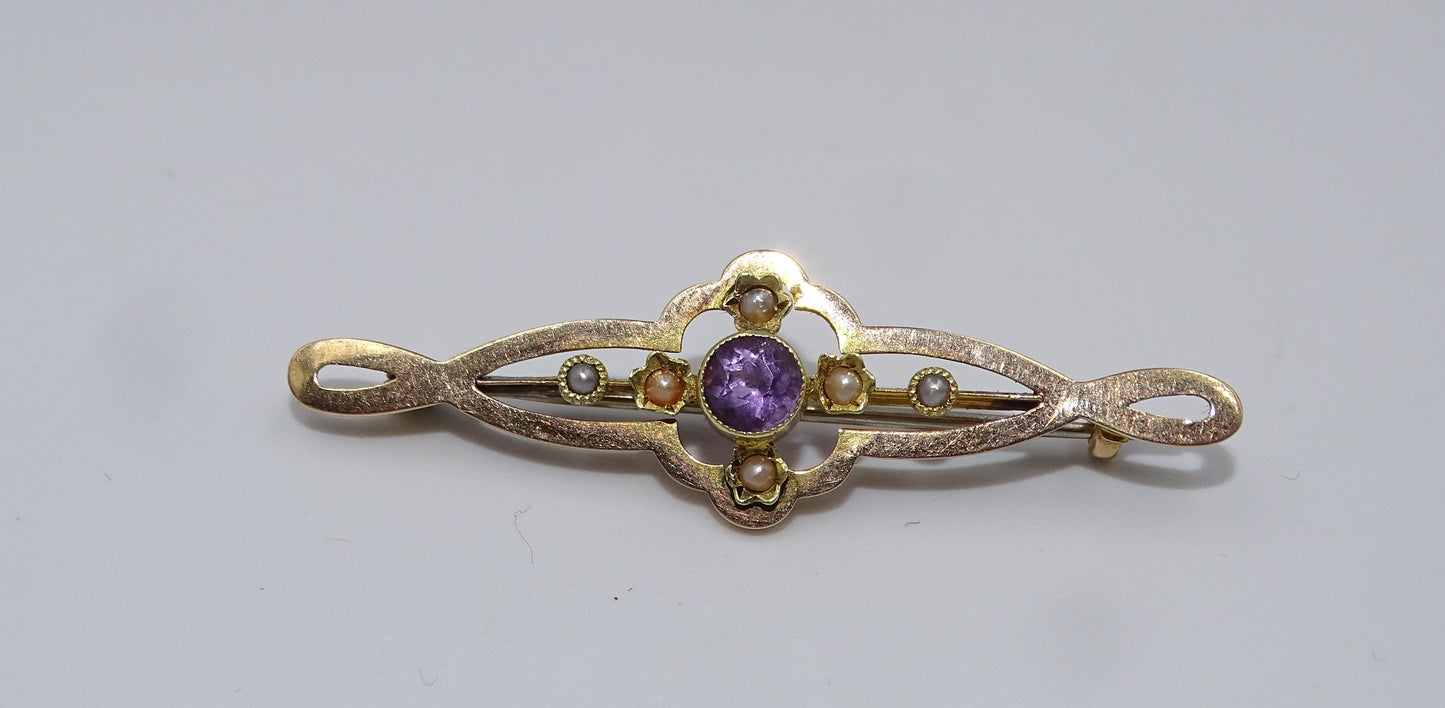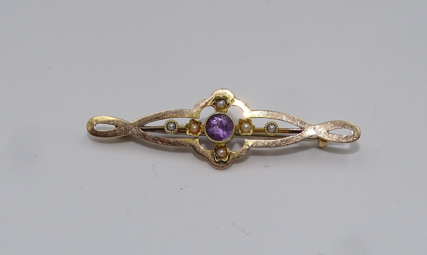 Antike Jugendstil 14k Gold Brosche mit Amethyst und Perlen