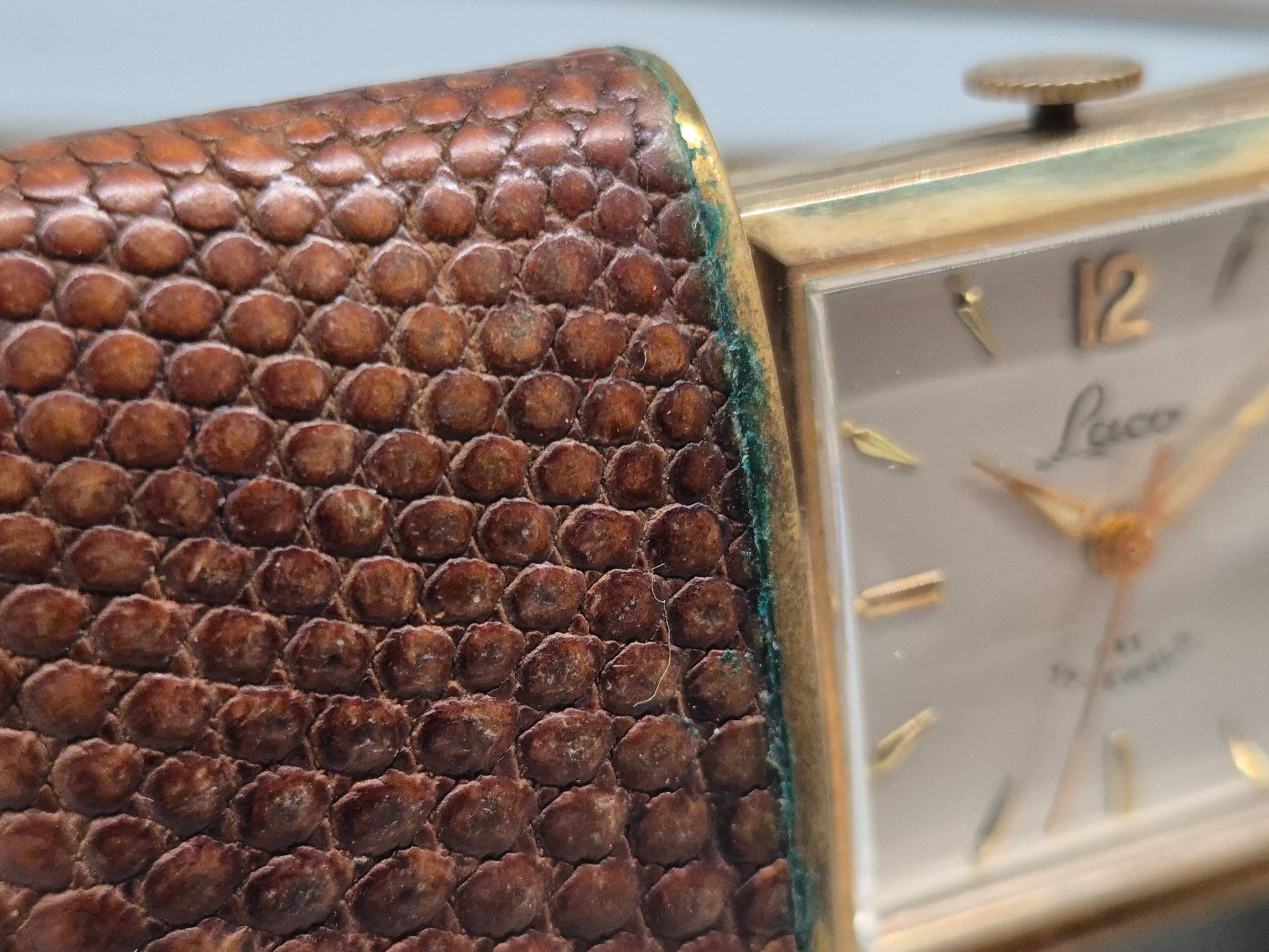 Diese fein gearbeitete Laco Damen Uhr vereint nostalgischen Charme mit ungewöhnlichem Design. Eingebettet ist das quadratische Gehäuse mit feinem 17 Jewels‑Werk in einen lederbezogenen Lepidolith‑Schuber, der sich elegant an der Halskette befestigen lässt. Ideal als tragbarer Reise‑ oder Anhängeuhr – ausgefallene Retro‑Ästhetik und zeitlose Technik in einem Stück.