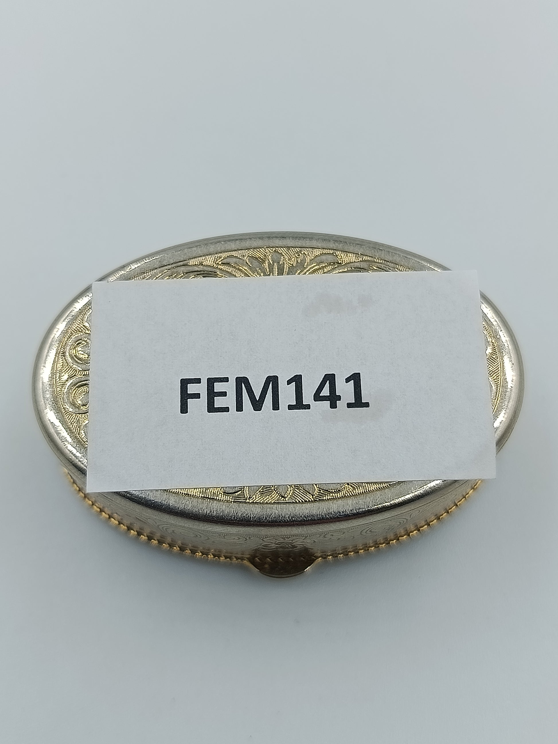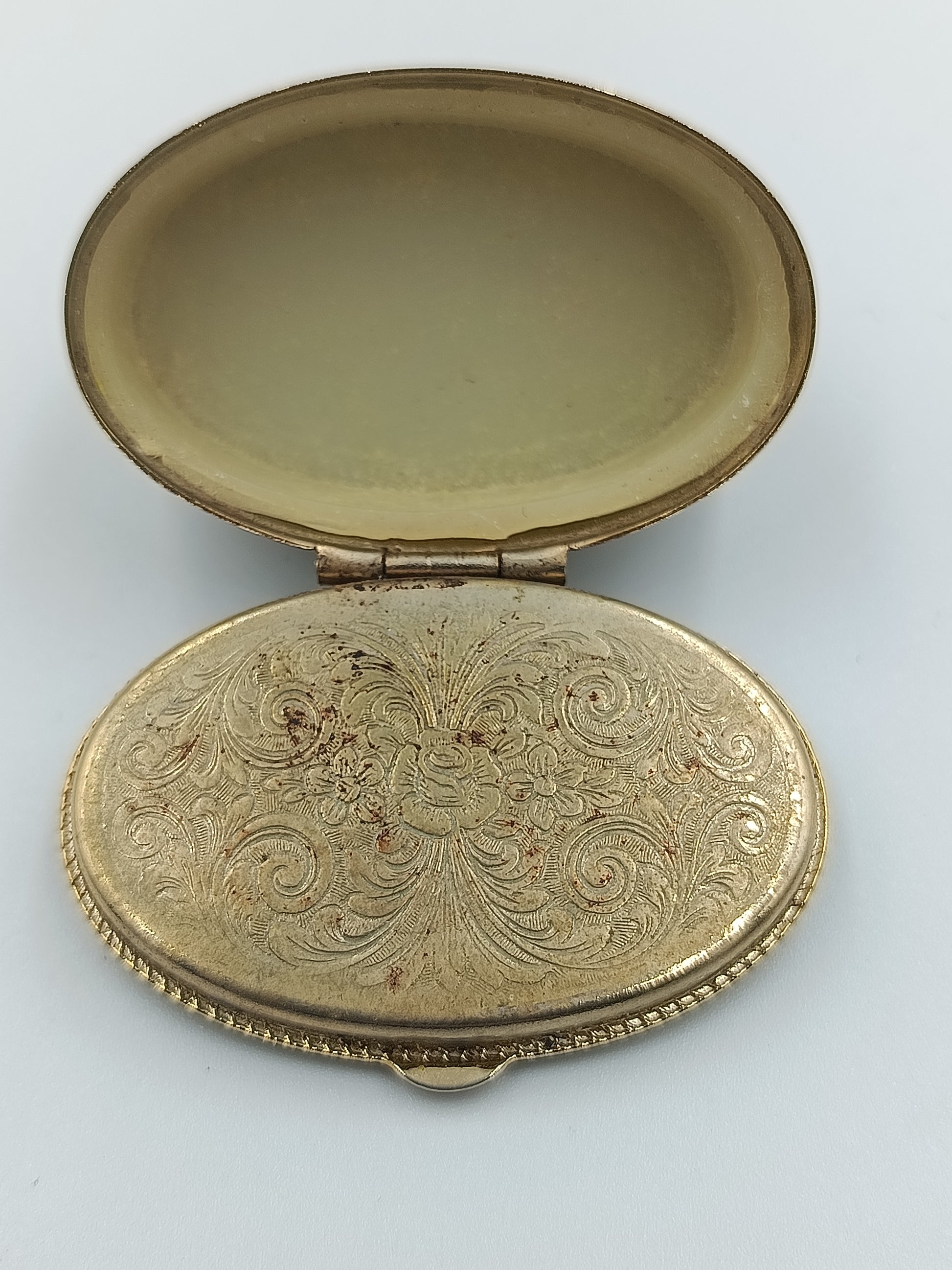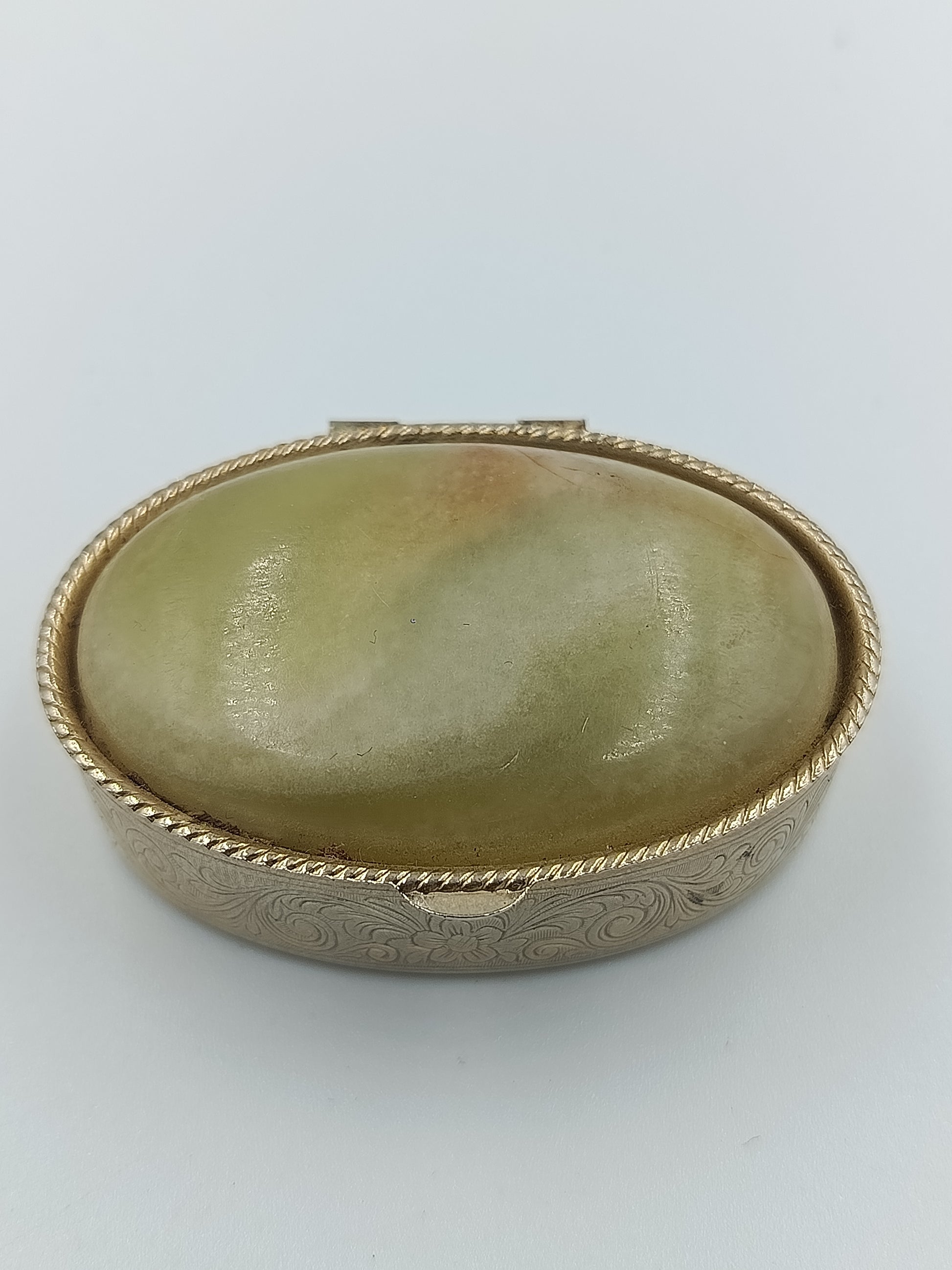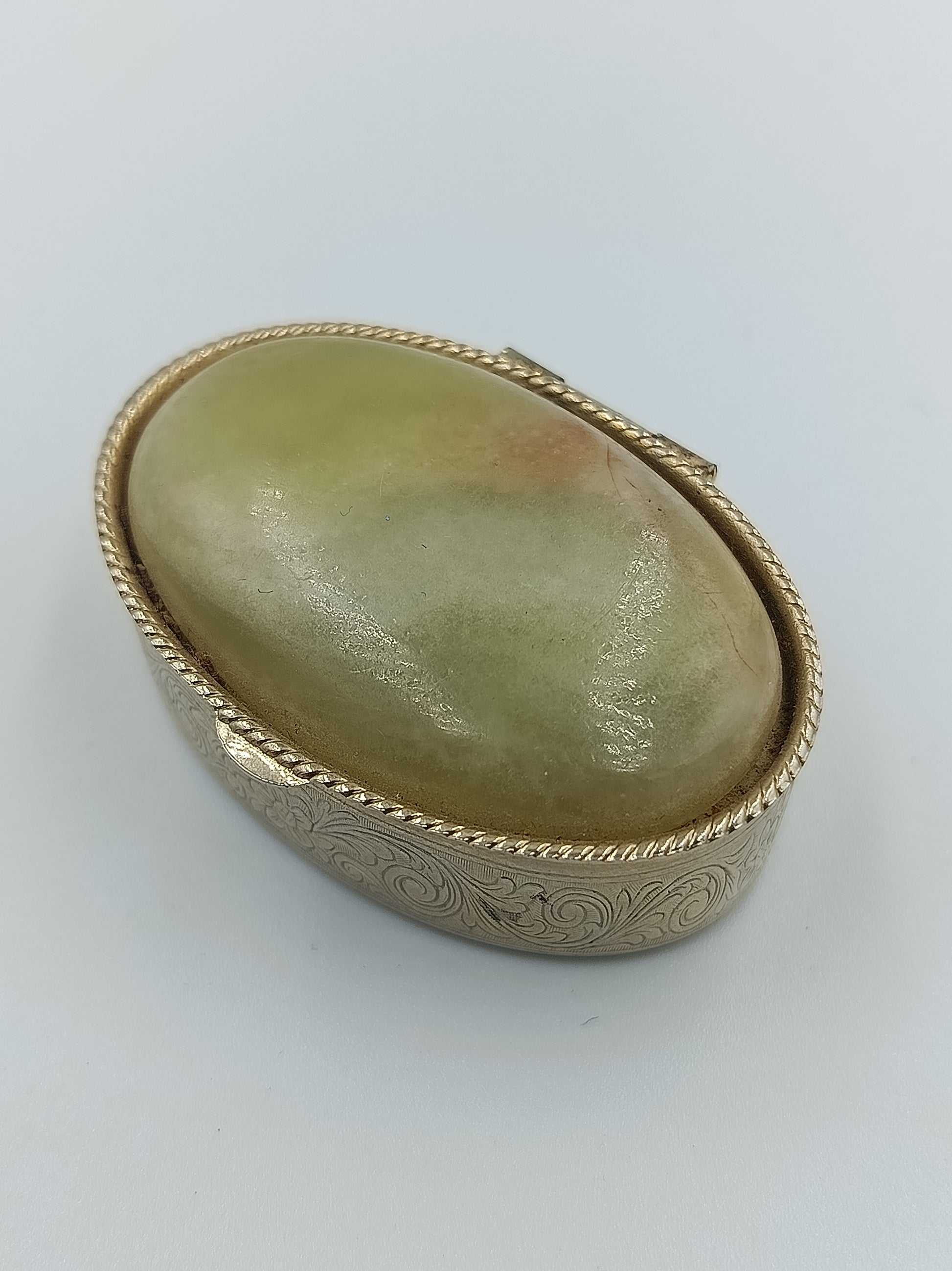 Elegante, ovale Pillendose mit grünem Steinbesatz auf dem Deckel und fein graviertem Metallrahmen. Das Innenfach ist schlicht gehalten und eignet sich perfekt zur Aufbewahrung von kleinen Schmuckstücken, Pillen oder anderen Kleinigkeiten. Ein klassisches Sammlerstück mit Vintage-Charme.