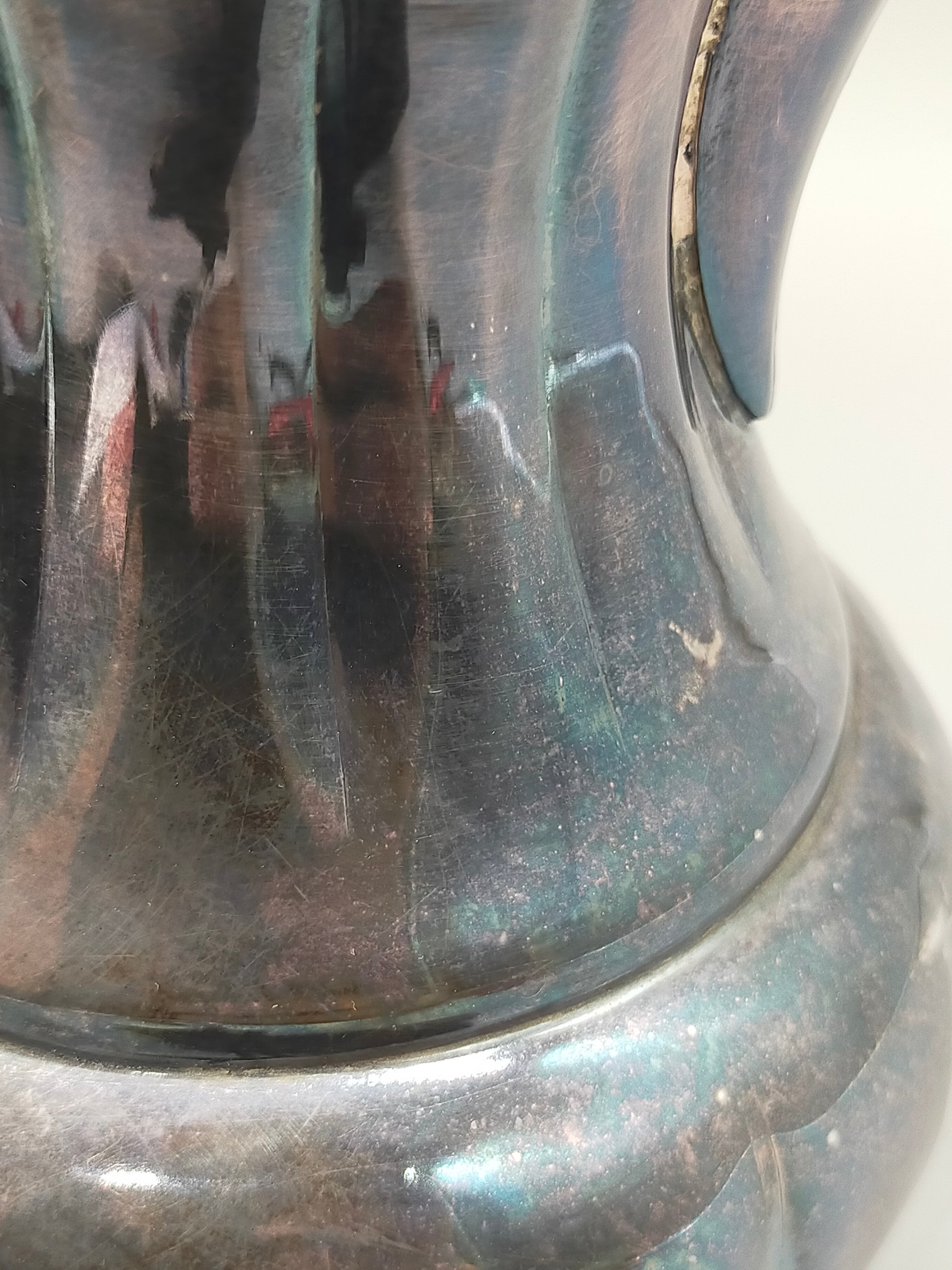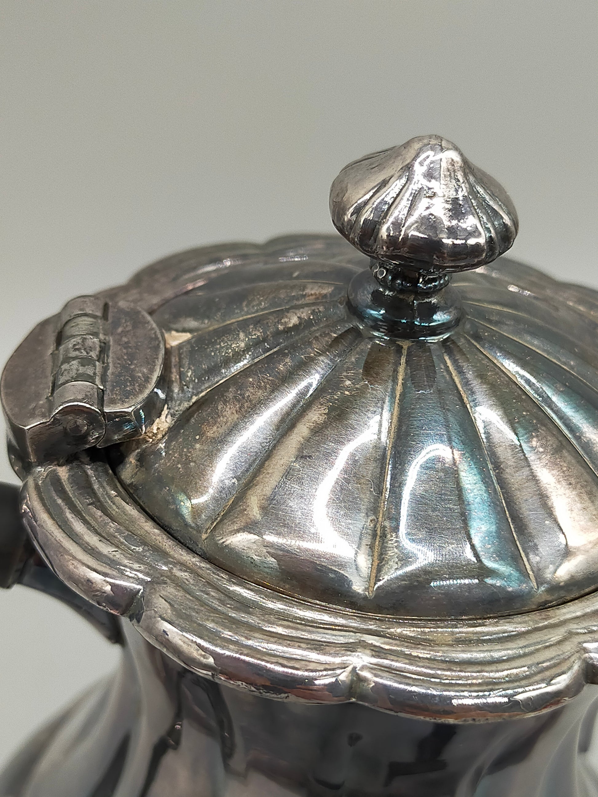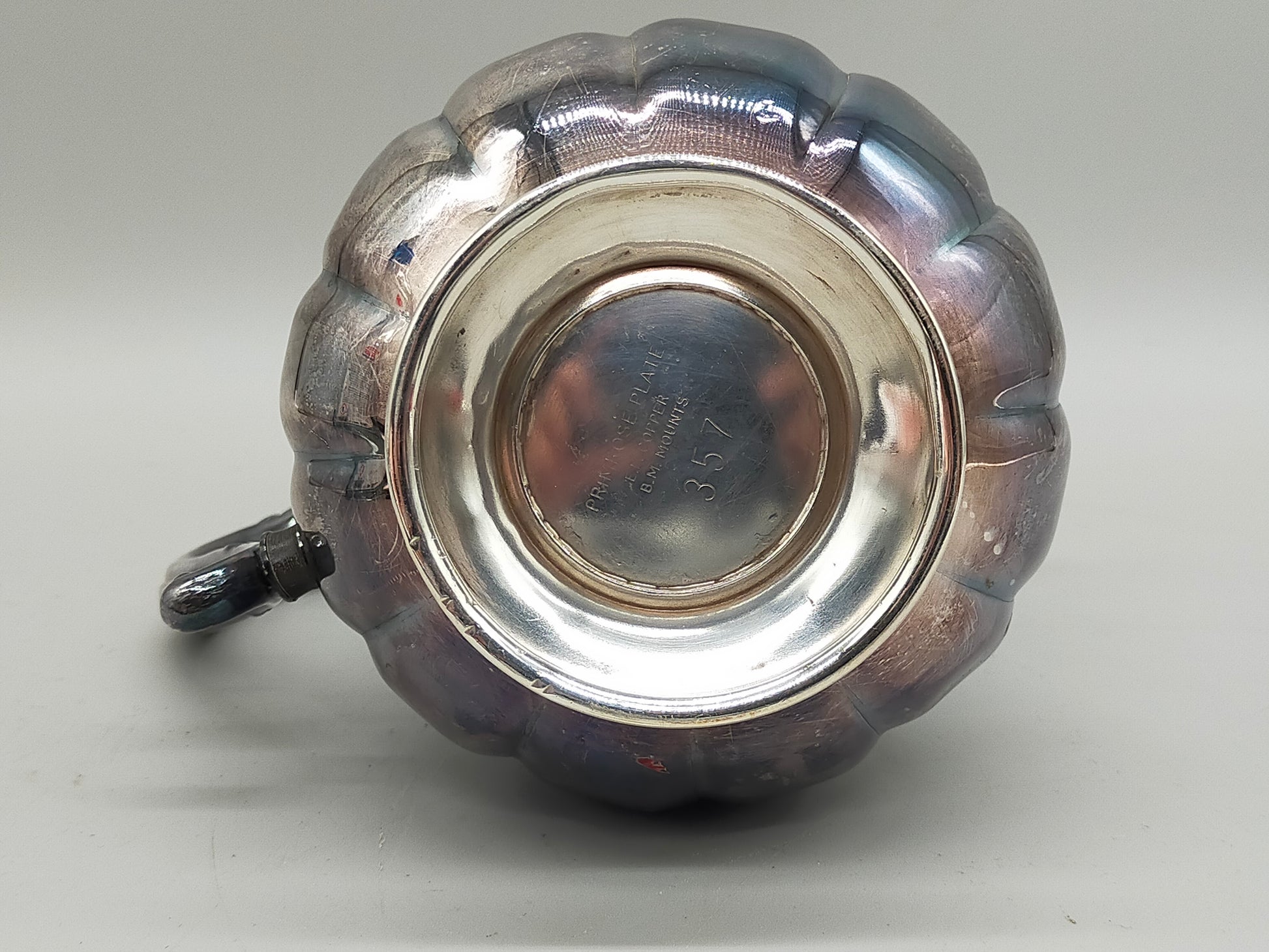 Herzlich willkommen, Diese exquisite Kaffeekanne der Marke Primrose Plate besticht durch ihr klassisches, bauchiges Design mit eleganten Längskanelierungen. Die feine Verarbeitung mit Britannia-Metall-Beschlägen (B.M. Mounts) auf einer Kupferbasis verleiht dem Stück eine beachtliche Schwere und Wertigkeit. Die charakteristische Patina unterstreicht den antiken Charme und macht sie zu einem idealen Dekorationsstück für Liebhaber klassischer Silberwaren.