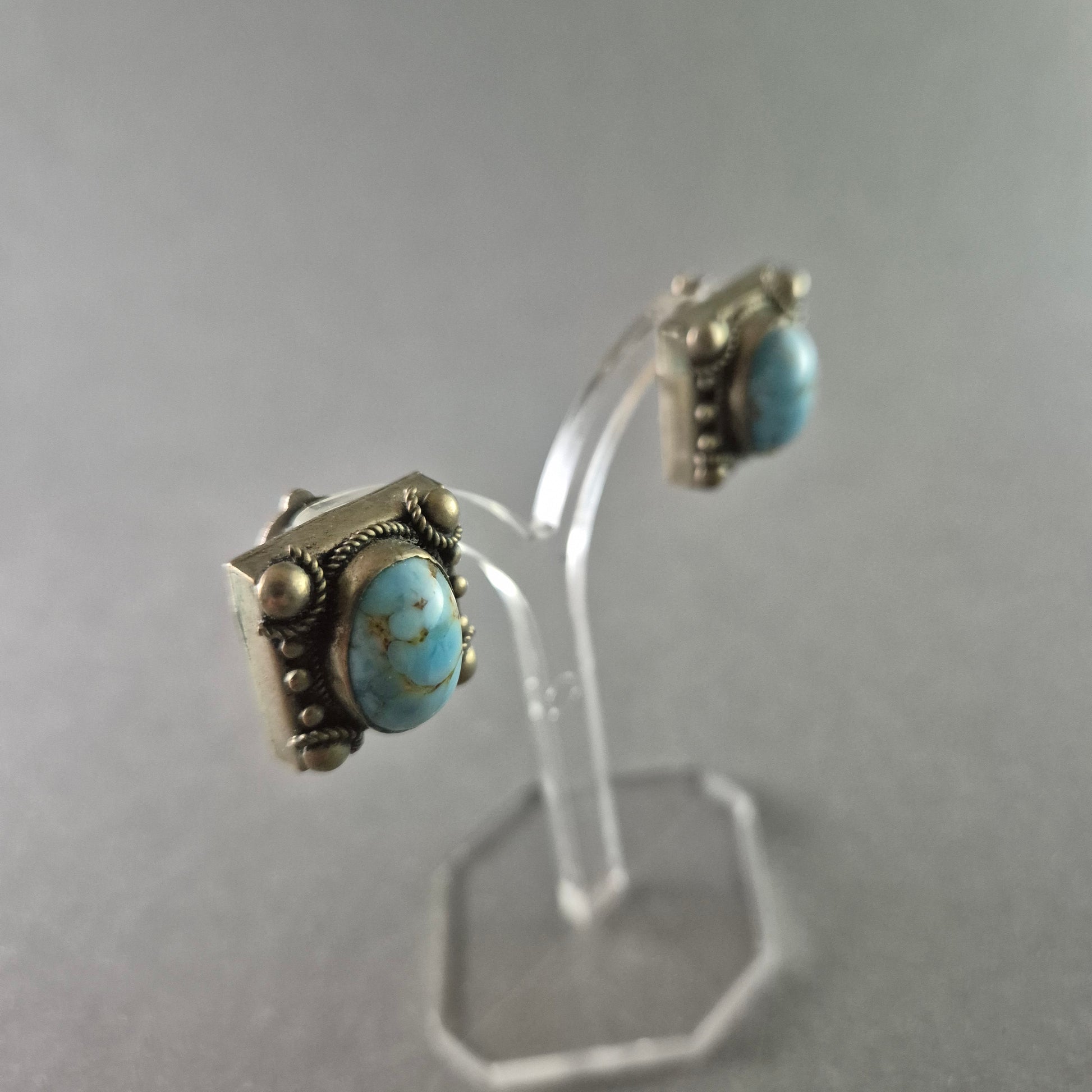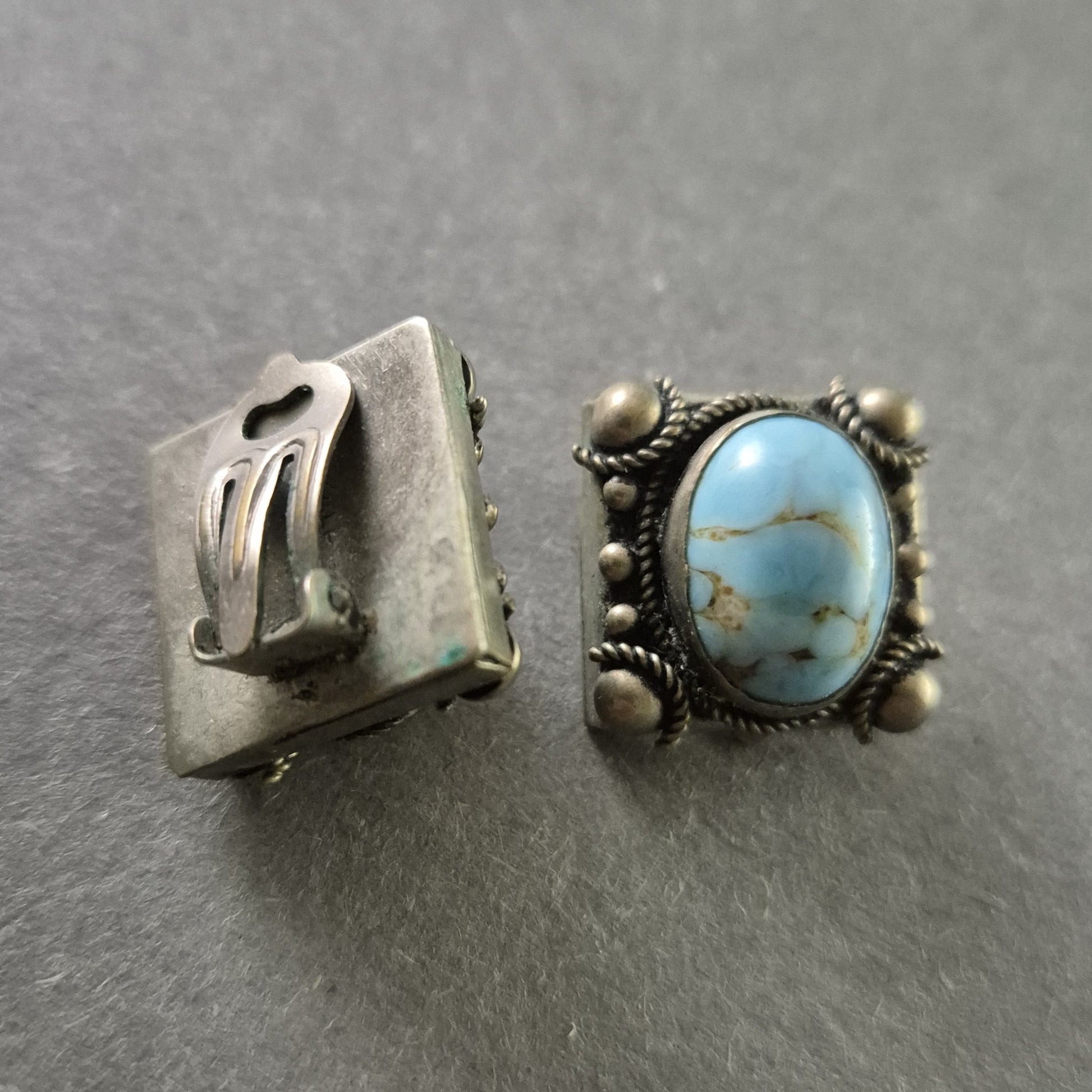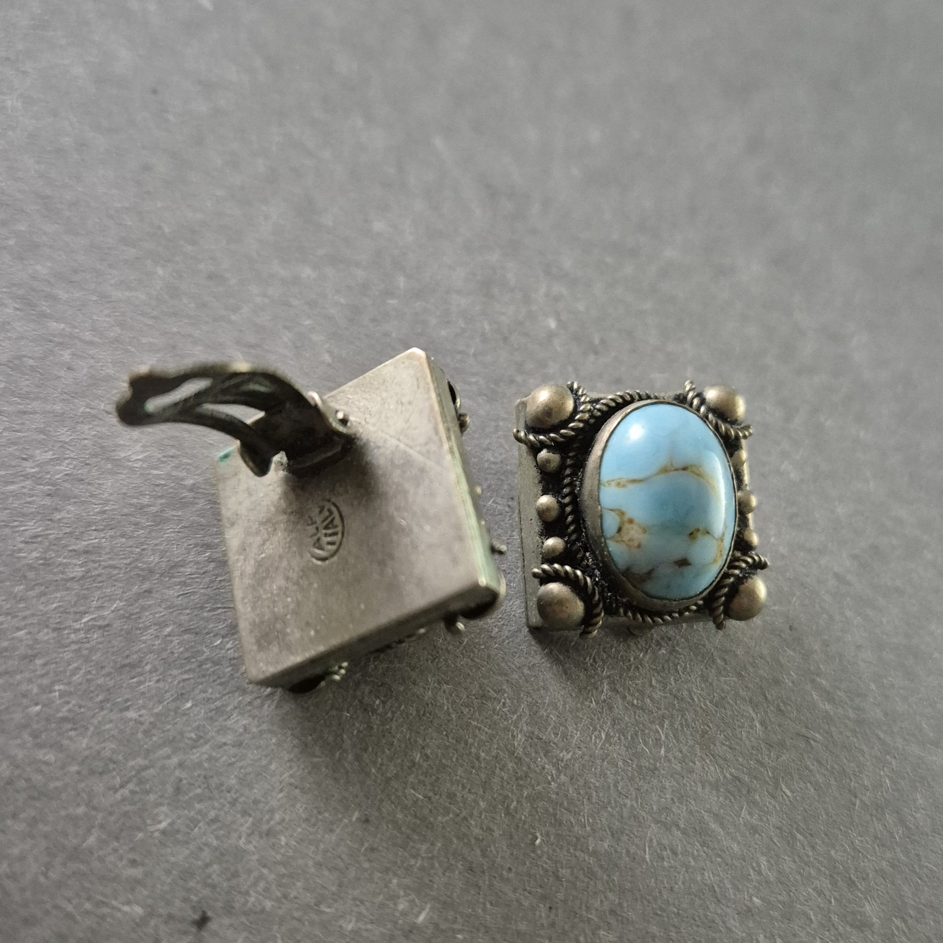 Diese kunstvollen antiken Ohrclips bestechen durch ihre detailreiche Verarbeitung im Vintage-Stil. Jeder Clip ist mit einem ovalen Türkis-Stein besetzt, der von kunstvollen Silberverzierungen umrahmt wird. Die quadratische Form und die filigranen Verzierungen verleihen diesen Ohrclips einen einzigartigen Charme und machen sie zu einem besonderen Schmuckstück für Liebhaber klassischer Designs.