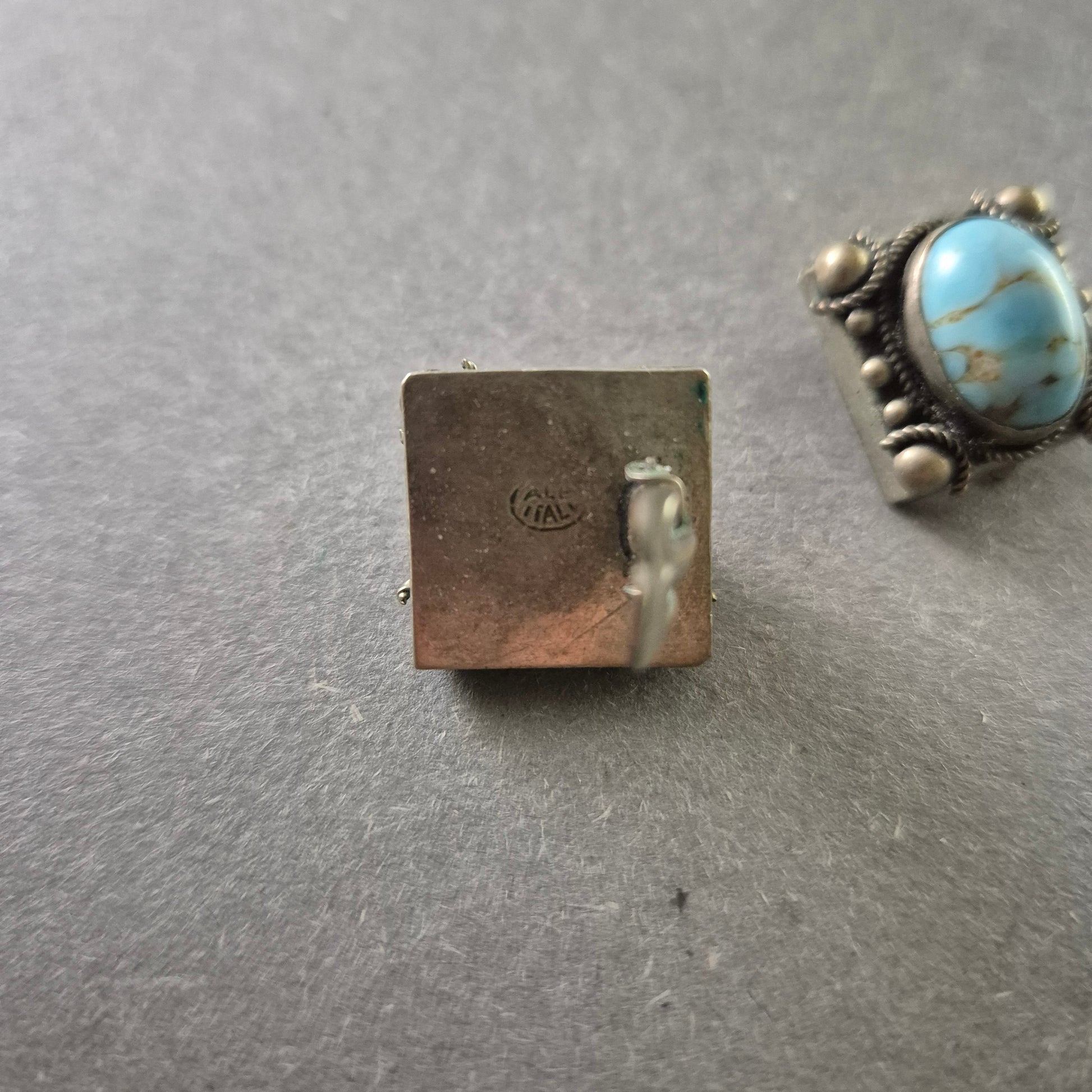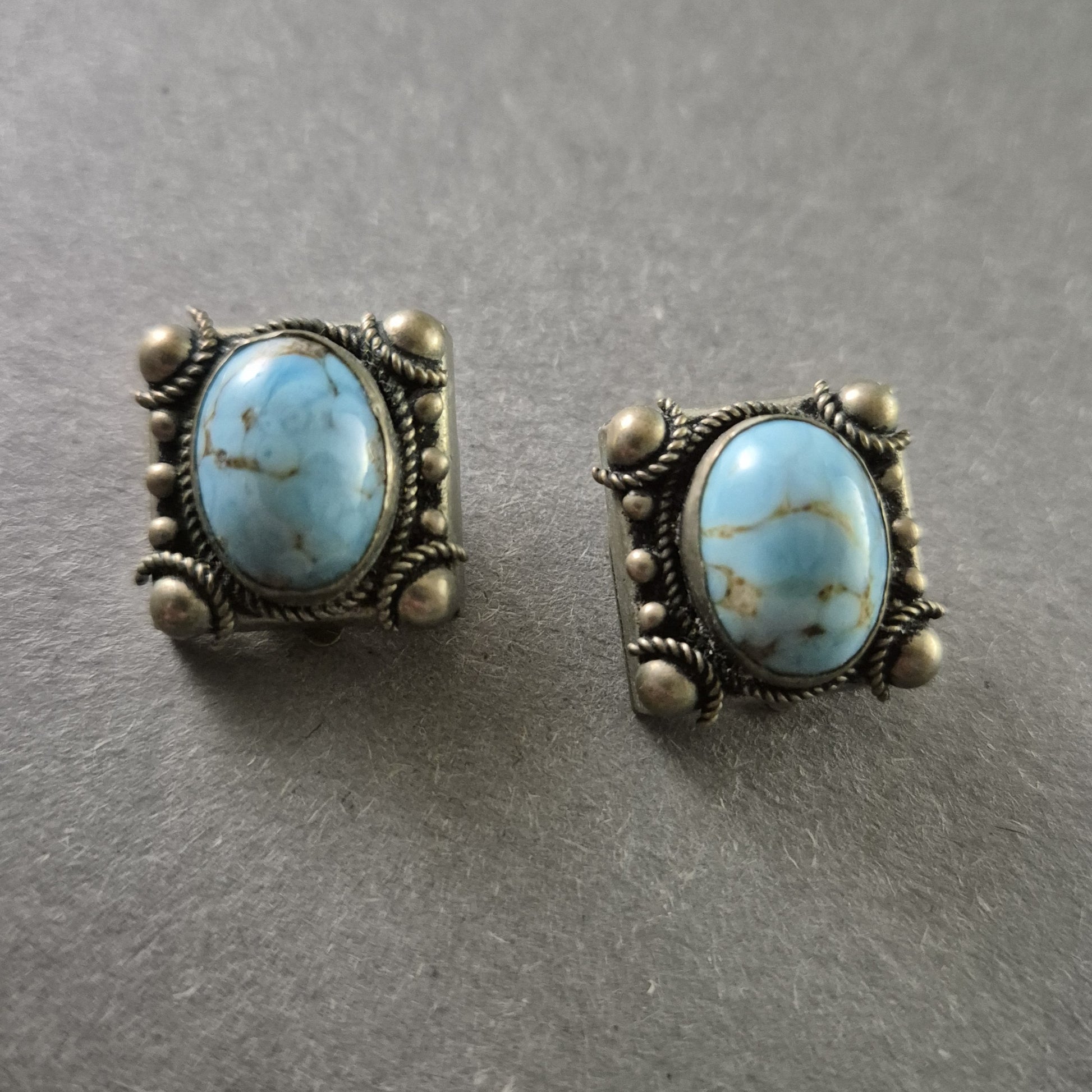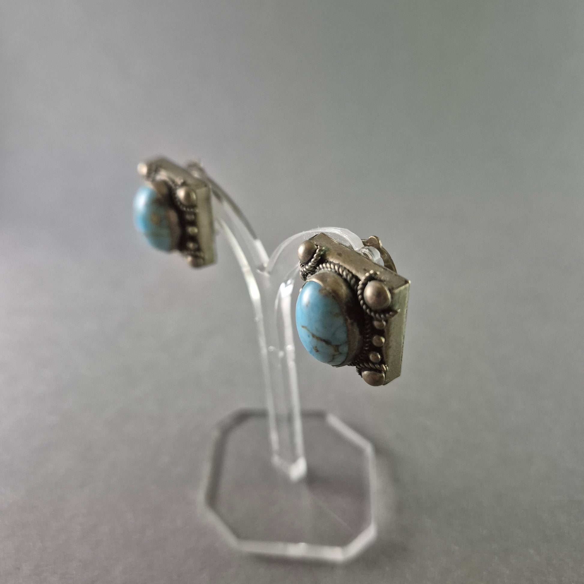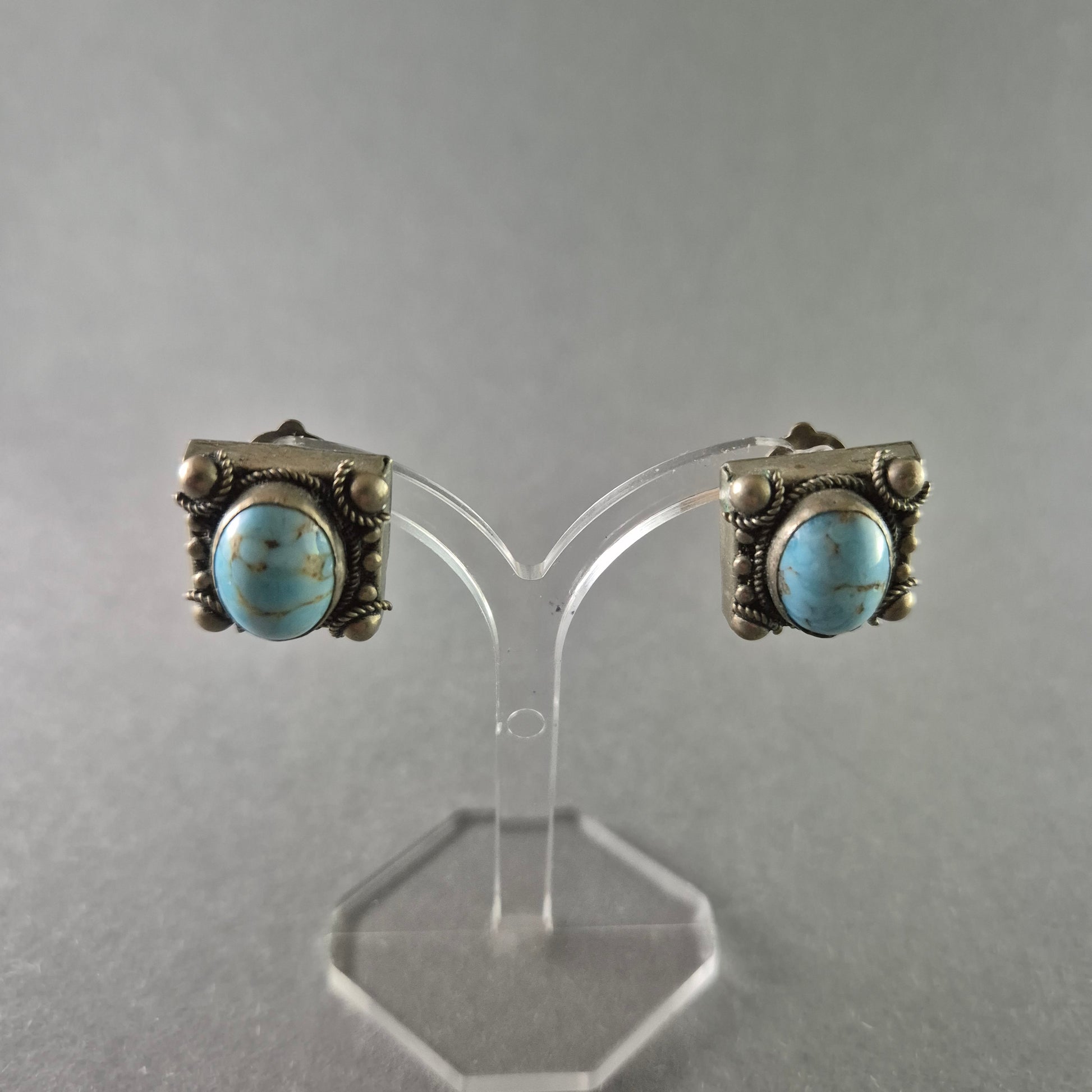 Diese kunstvollen antiken Ohrclips bestechen durch ihre detailreiche Verarbeitung im Vintage-Stil. Jeder Clip ist mit einem ovalen Türkis-Stein besetzt, der von kunstvollen Silberverzierungen umrahmt wird. Die quadratische Form und die filigranen Verzierungen verleihen diesen Ohrclips einen einzigartigen Charme und machen sie zu einem besonderen Schmuckstück für Liebhaber klassischer Designs.