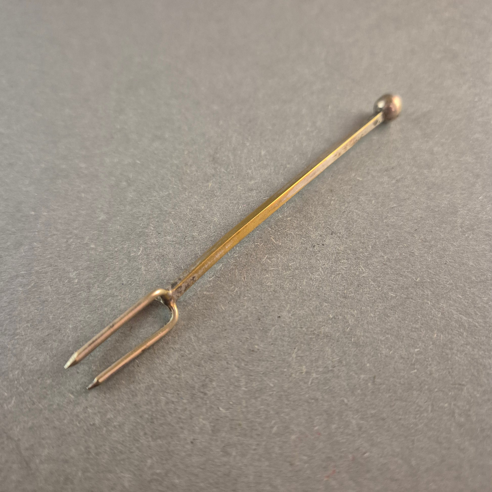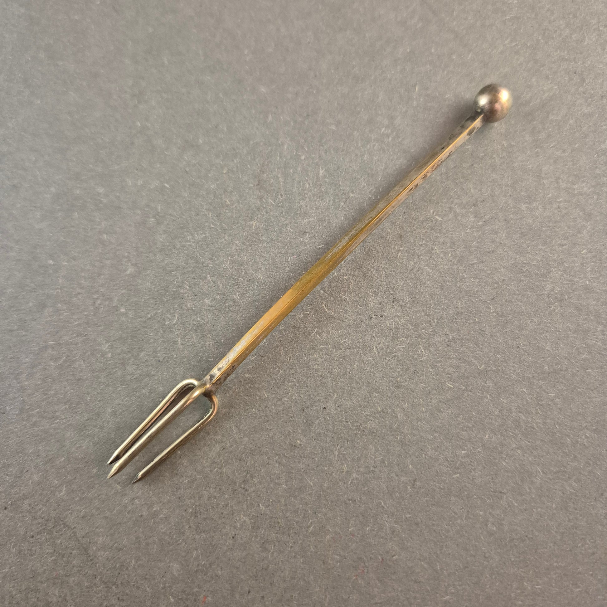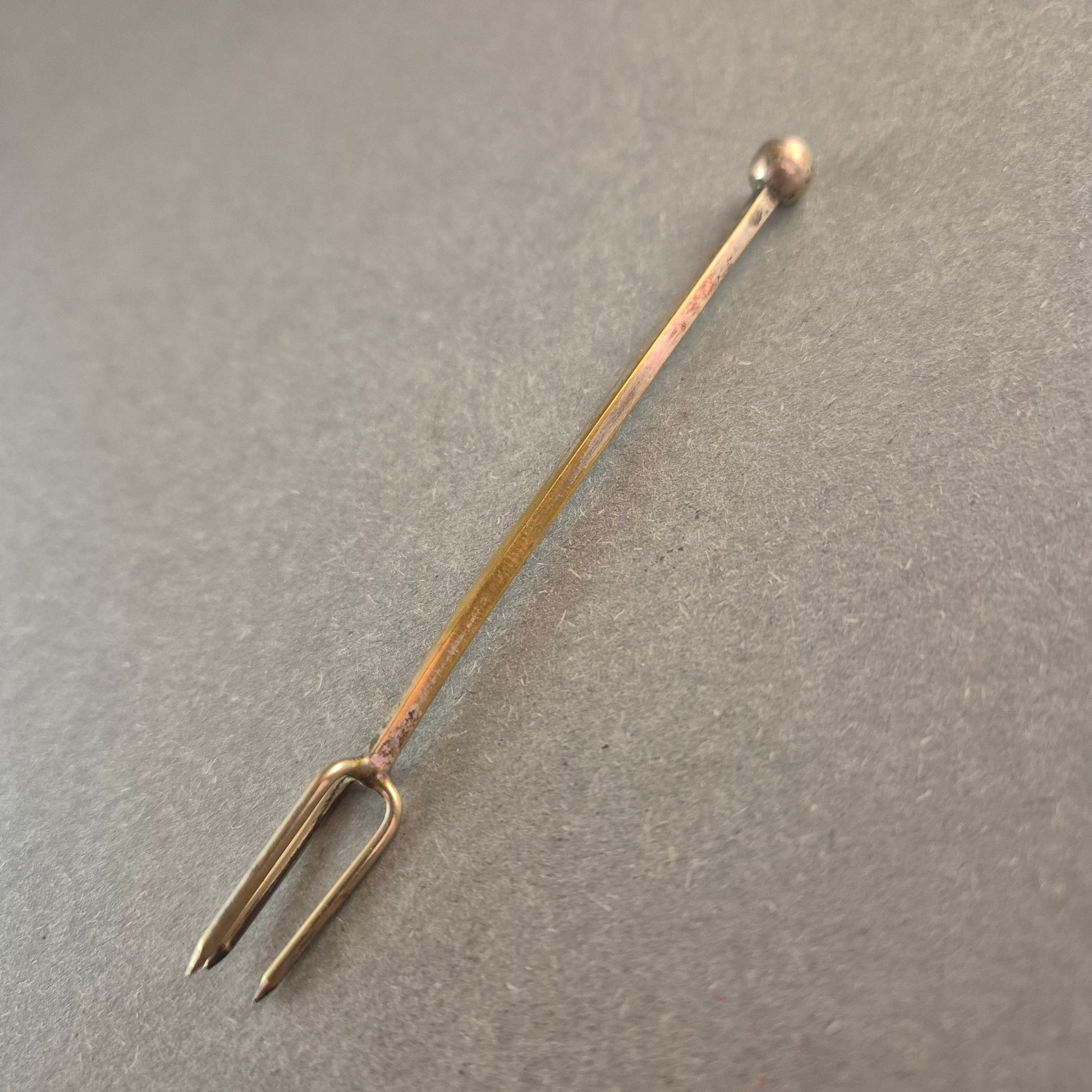Diese außergewöhnliche Miniatur-Gabel aus Metall – vermutlich versilbert oder Silberlegierung – präsentiert sich mit zwei feinen Zacken und einem dekorativen Kugelgriff. Aufgrund ihrer Größe und Gestaltung könnte sie ursprünglich als Olive-, Hors d'œuvre- oder Pickle-Gabel gedient haben. Heute eignet sie sich hervorragend als charmantes Sammlerstück oder für stilvolle Vintage-Tischdekorationen.